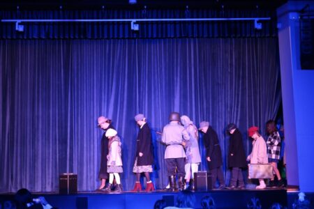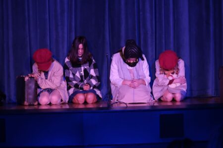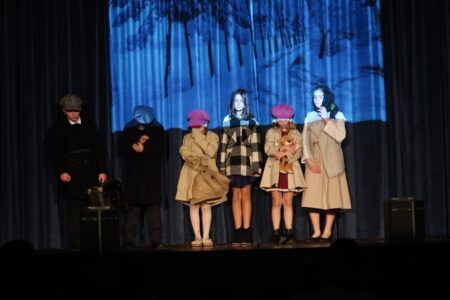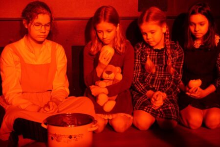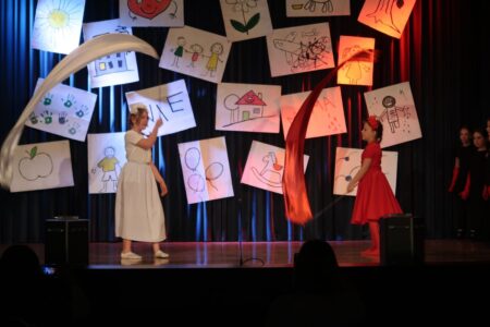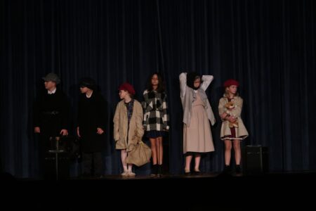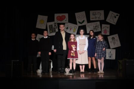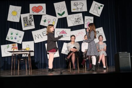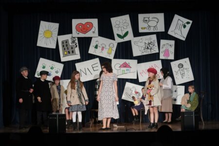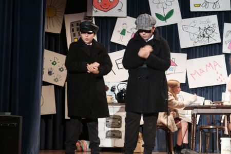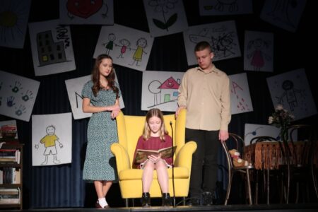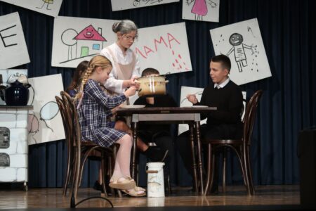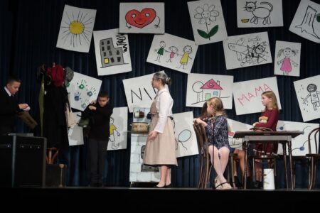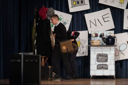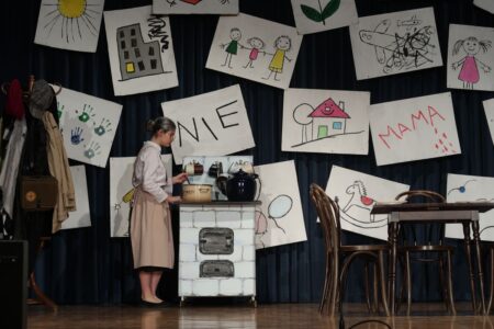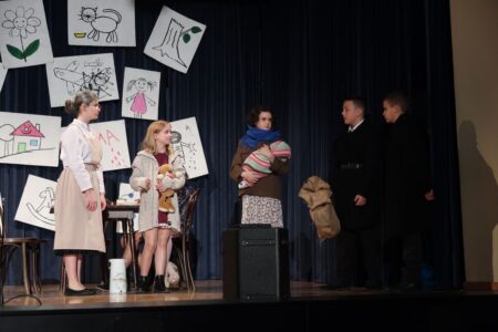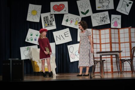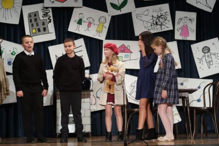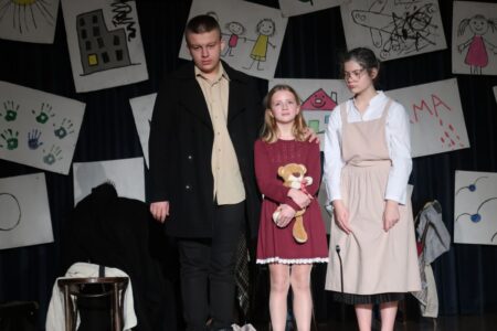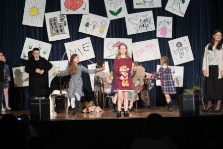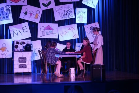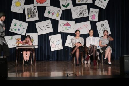 W tym roku obchodzimy również 80. rocznicę zakończenia drugiej wojny światowej. I z tej właśnie okazji szkolne koło teatralne przygotowało sceniczną adaptację „Asiuni” Joanny Papuzińskiej. To poruszająca książeczka autobiograficzna dla dzieci, opowiadająca o wojennych doświadczeniach autorki, kiedy miała zaledwie pięć lat. Historia ukazana jest z perspektywy małej dziewczynki – Asiuni – która nagle traci poczucie bezpieczeństwa i rodzinny dom w wyniku wojny. Jej  mamę aresztują Niemcy, tata znika na początku wojny, a dziewczynka musi zamieszkać u obcych ludzi. Bardzo przeżywa rozłąkę z rodziną.
