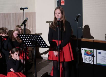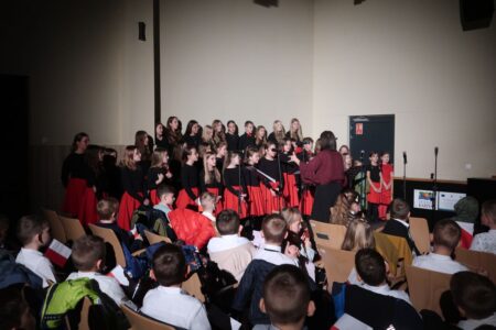 Spektakl nie mógłby się obyć bez muzyki, dlatego 11 przepięknych, wzruszających piosenek usłyszeliśmy w wykonaniu szkolnego chóru pod batutą pani Bernadety Stawowczyk – Zemanek. Swoimi głosami zachwycili nas soliści: Maja Januszewska, Zuzanna Żądło oraz Dominik Michalak.