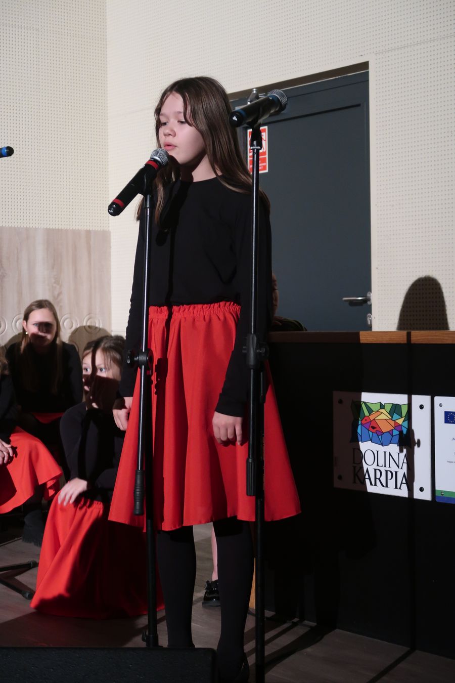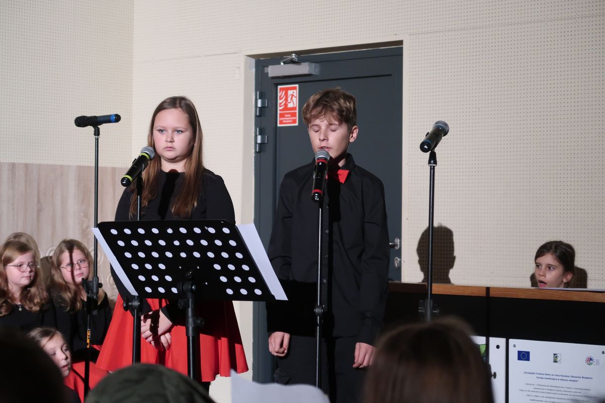 Spektakl nie mógłby się obyć bez muzyki, dlatego 11 przepięknych, wzruszających piosenek usłyszeliśmy w wykonaniu szkolnego chóru pod batutą pani Bernadety Stawowczyk – Zemanek. Swoimi głosami zachwycili nas soliści: Maja Januszewska, Zuzanna Żądło oraz Dominik Michalak.