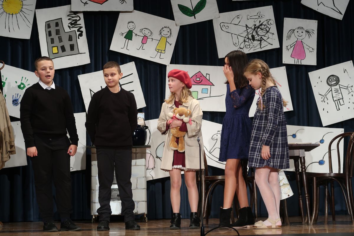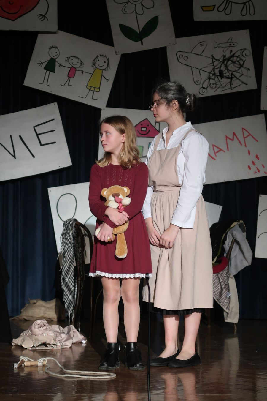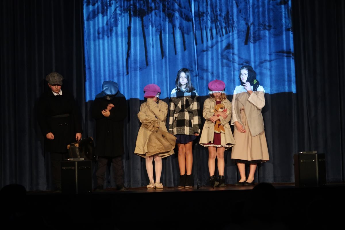 W tym roku obchodzimy również 80. rocznicę zakończenia drugiej wojny światowej. I z tej właśnie okazji szkolne koło teatralne przygotowało sceniczną adaptację „Asiuni” Joanny Papuzińskiej. To poruszająca książeczka autobiograficzna dla dzieci, opowiadająca o wojennych doświadczeniach autorki, kiedy miała zaledwie pięć lat. Historia ukazana jest z perspektywy małej dziewczynki – Asiuni – która nagle traci poczucie bezpieczeństwa i rodzinny dom w wyniku wojny. Jej  mamę aresztują Niemcy, tata znika na początku wojny, a dziewczynka musi zamieszkać u obcych ludzi. Bardzo przeżywa rozłąkę z rodziną.