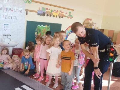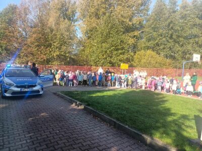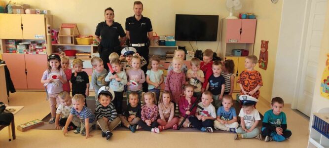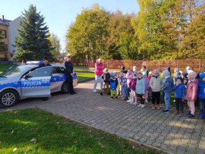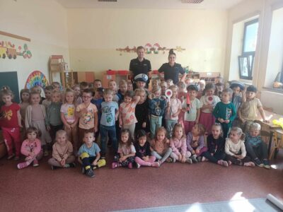 W poniedziałek 21 października nasze przedszkolaki odwiedzili policjanci z Komendy Powiatowej Policji w Oświęcimiu. Przypomnieli dzieciom zasady bezpiecznego poruszania się w ruchu drogowym, a w szczególności przechodzenia przez jezdnię. Ponadto zaprezentowali charakterystyczne elementy policyjnego stroju. Największą atrakcją był pokaz radiowozu policyjnego wraz z jego sygnałami dźwiękowymi.