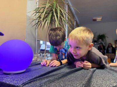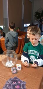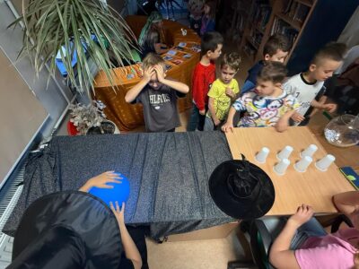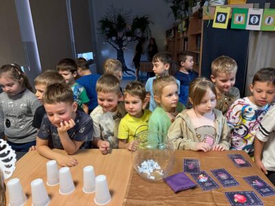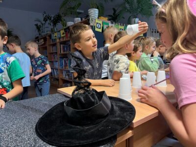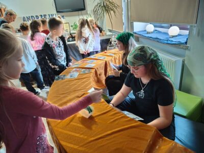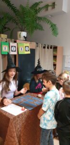 We środę biblioteka szkolna gościła klasy młodsze na tradycyjnych wróżbach andrzejkowych. Zmieniła więc swój wystrój kolejny raz – zaciemnione okna, świecące kule, lampa czarownicy tworzyły nastrój tajemnicy.