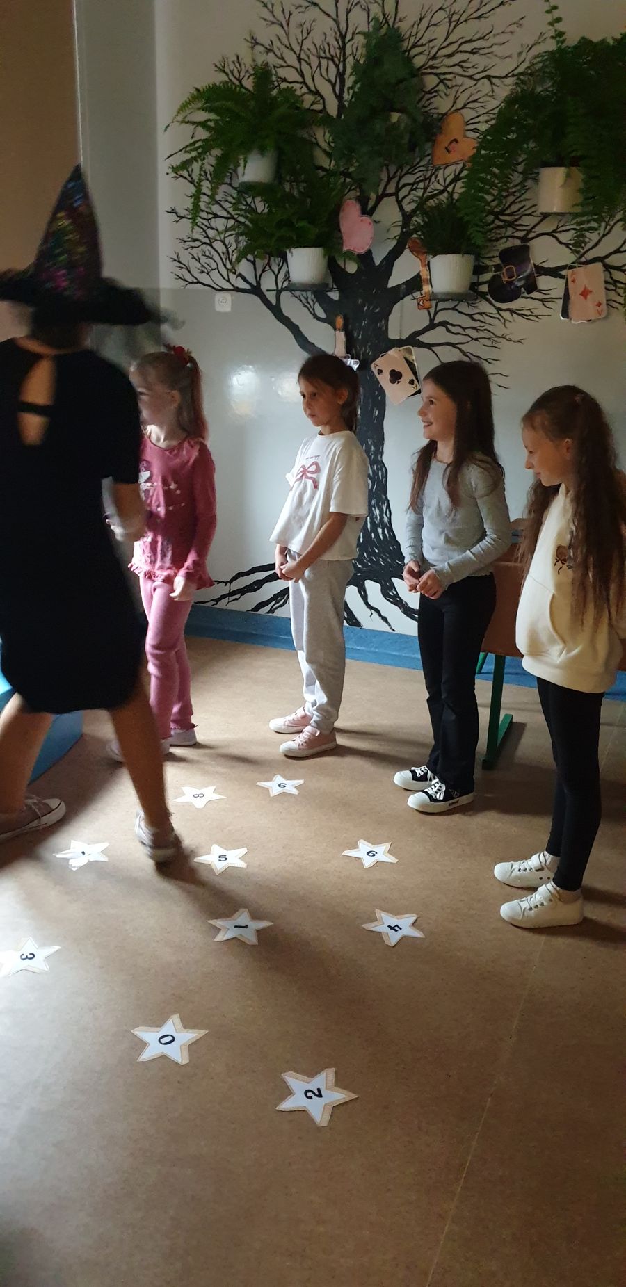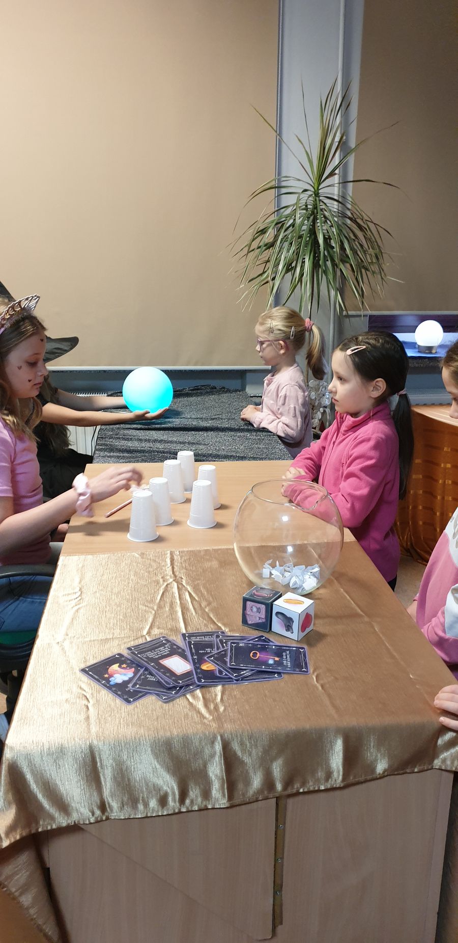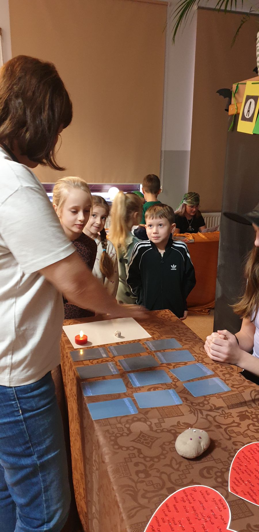 We środę biblioteka szkolna gościła klasy młodsze na tradycyjnych wróżbach andrzejkowych. Zmieniła więc swój wystrój kolejny raz – zaciemnione okna, świecące kule, lampa czarownicy tworzyły nastrój tajemnicy.