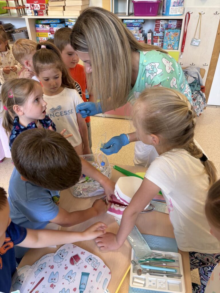 W dniu 27 maja odwiedziła nasze przedszkole pani Wiola, która jest asystentką stomatologa. Spotkała się z dziećmi z najstarszych grup “Motylków” i “Biedronek”. Przedszkolaki miały okazję zapoznać się tym zawodem, a także poznały sposoby dbania o zęby – higiena, zdrowe odżywianie i regularne wizyty u stomatologa. Na zakończenie warsztatów dzieci otrzymały drobne upominki.
