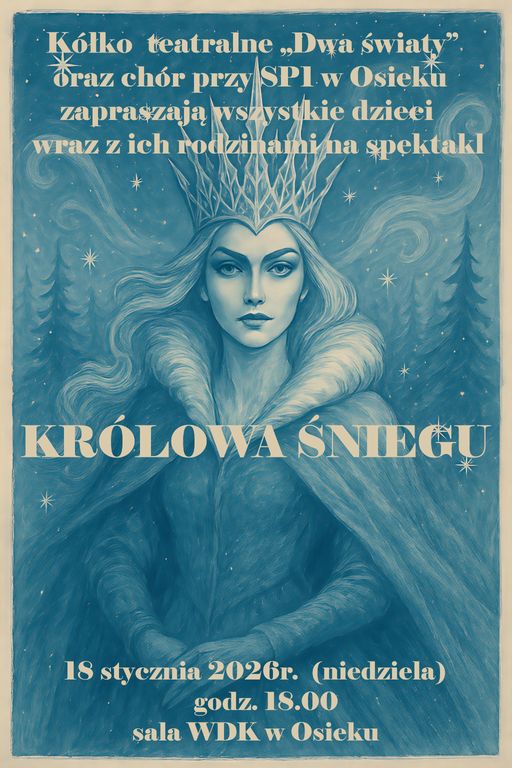 Dwoje dzieci, lustro rozbite na tysiące drobnych kawałków i zła królowa. Zapraszamy na opowieść o walce dobra ze złem, o sile miłości i przyjaźni, która jest w stanie przezwyciężyć największe zło i chłód uczuć. „Królowa Śniegu” 18.01.2026r. godz.18.00 sala WDK w Osieku