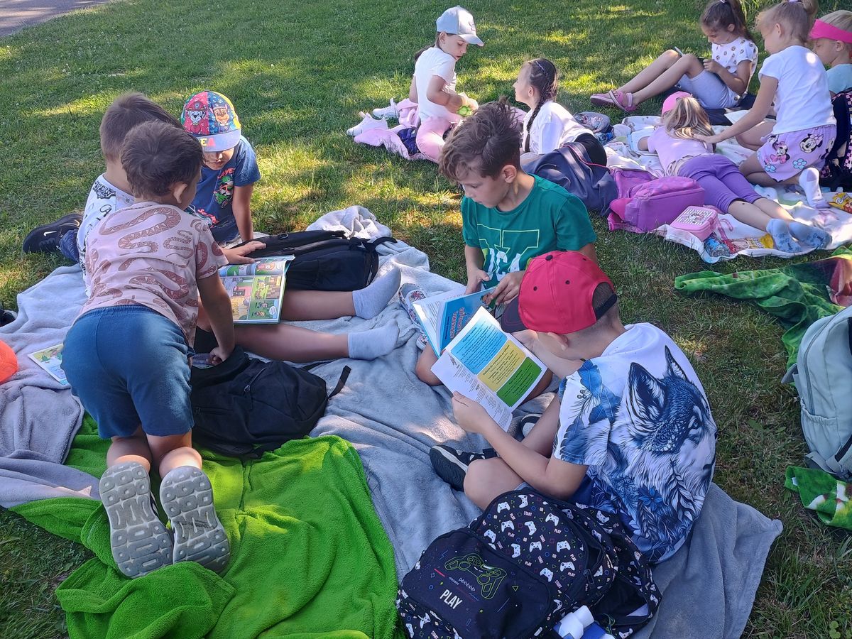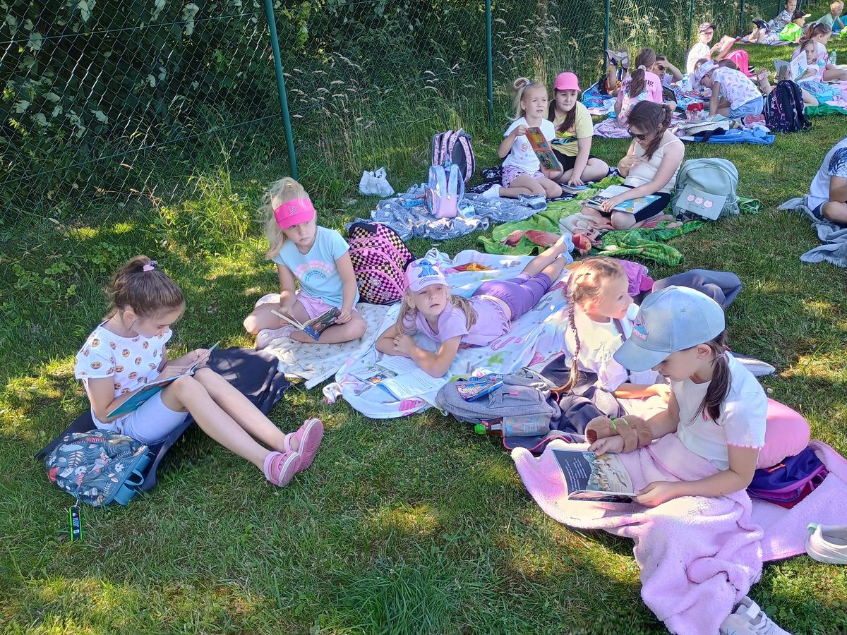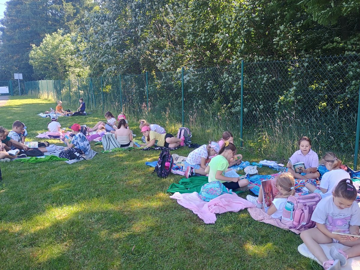 25 czerwca uczniowie klas Ia i Ib aktywnie włączyli się w ogólnopolską akcję promującą czytelnictwo. W tym dniu wspólnie czytali swoje ulubione książki w plenerze, łącząc przyjemność lektury z aktywnym spędzaniem czasu na świeżym powietrzu. Wyjście na wycieczkę było doskonałą okazją nie tylko do promocji czytania, ale również do integracji, zabawy i cieszenia się piękną pogodą.