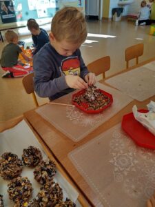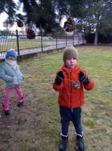 Misie i Sarenki wykonały dla ptaszków szyszki ze smalcem i ziarnami uwielbianymi przez naszych skrzydlatych przyjaciół. Z pomocą pań zwiesiły je na drzewach w przedszkolnym ogrodzie. Mamy nadzieje, że ptaki przylecą do nas i poczęstują się przygotowanymi smakołykami.
