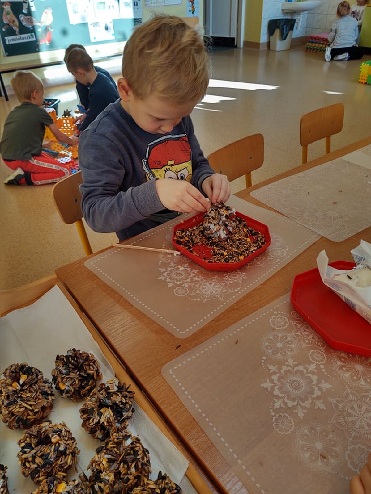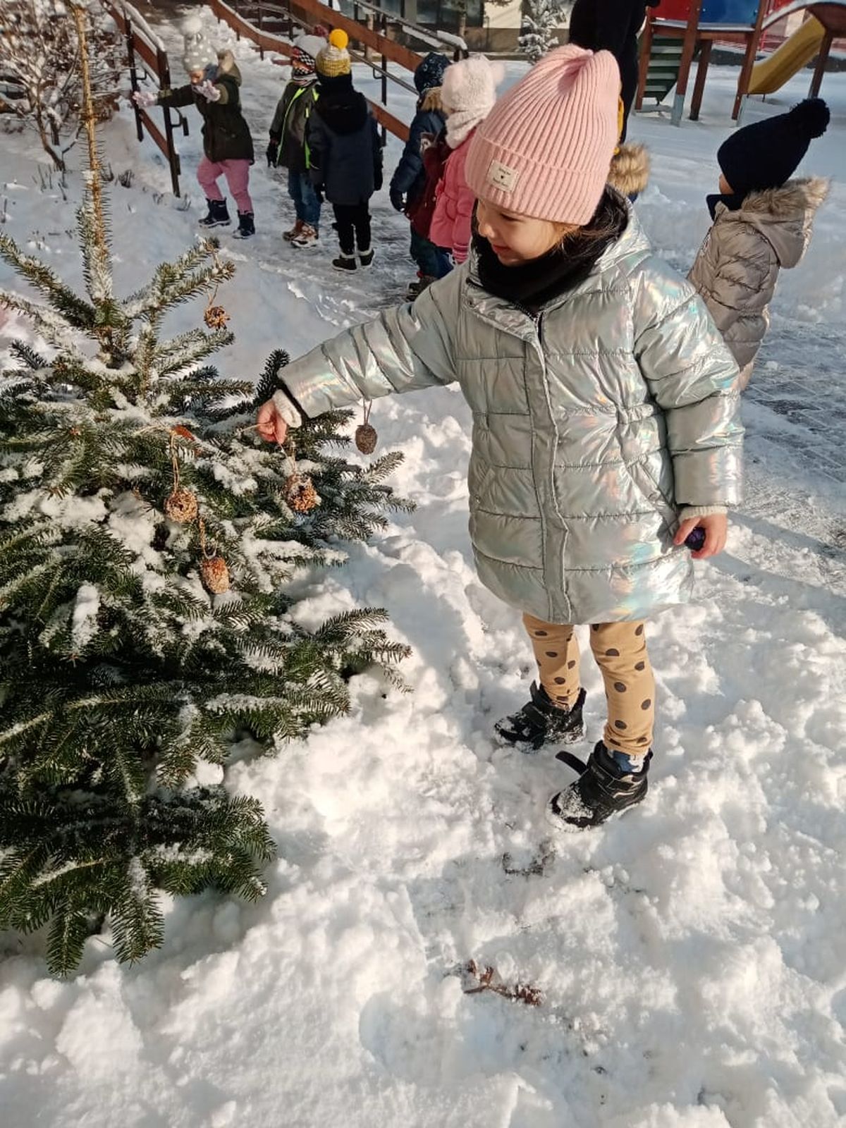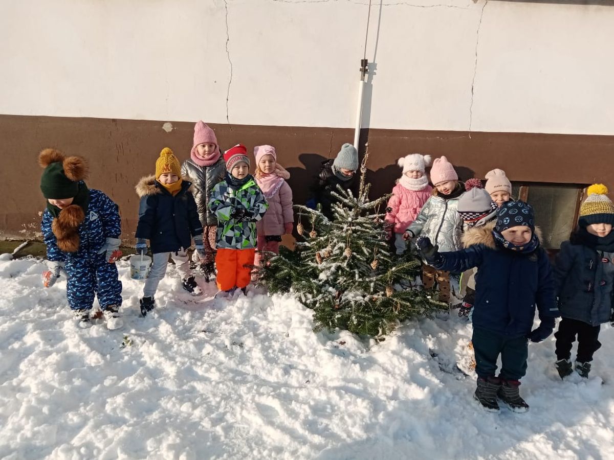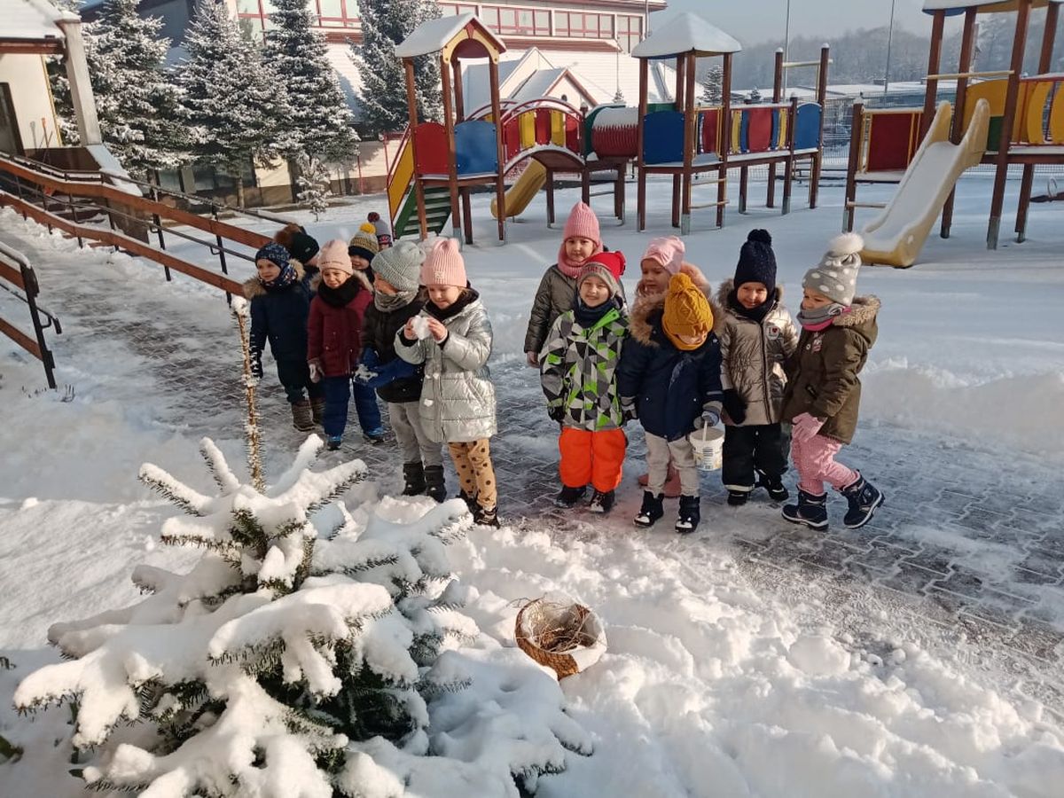 Przyszła zima, a w raz z nią nastały ciężkie czasy dla ptaków. Na szczęście w naszym przedszkolu dzieci dbają o zwierzęta i przygotowały dla nich prawdziwą ucztę.