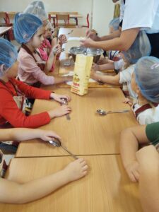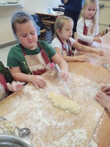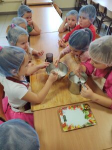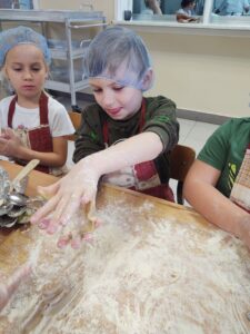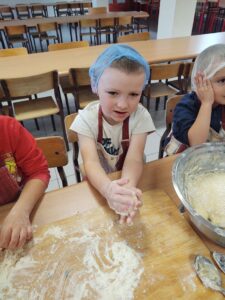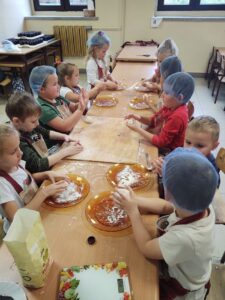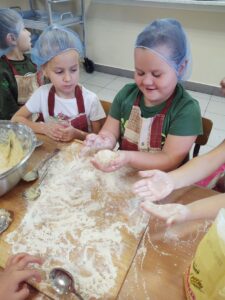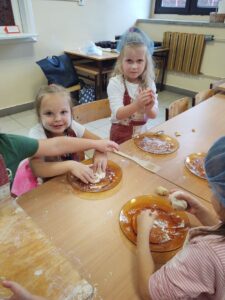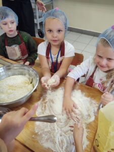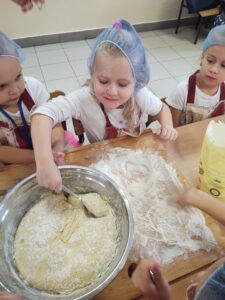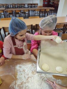 16 października obchodzony jest Światowy Dzień Chleba. Z tej okazji przedszkolaki z grupy Biedronek, w ramach innowacji „Podróż do krainy zmysłów”, zamieniły się w prawdziwych piekarzy. Podczas zajęć dzieci obejrzały film edukacyjny „Od ziarenka do bochenka”, który zaznajomił je z etapami powstawania chleba. Przedszkolaki dowiedziały się jak długą drogę musi pokonać ziarno zboża, by mogło zamienić się w pyszny chleb. Ponadto film uświadomił dzieciom jak dawniej wyglądała produkcja mąki, jak ciążka to była praca. W tym roku zamiast chleba postanowiliśmy upiec dwa rodzaje bułeczek – pszenne i drożdżowe. Proces wypieku pieczywa niej jest łatwy i wymaga czasu. Najpierw przedszkolaki poznały wszystkie składniki potrzebne do przygotowania ciasta, po czym własnoręcznie sporządziły zaczyn, który musiał przez pewien czas się odstać. W między czasie dzieci uformowały swoje pierwsze bułeczki z ciasta drożdżowego, przygotowanego wcześniej przez panie kucharki. Następnie przedszkolaki razem zarabiały ciasto na bułki pszenne. Dodawały kolejno składniki, mieszały, zagniatały, a przy okazji mogły poczuć jak pachnie zaczyn i wyrabiane ciasto. Przyrządzanie własnych bułeczek dostarczyło naszym milusińskim wielu bodźców sensorycznych, a także ogrom radości i uśmiechu na twarzy. Na koniec, kiedy bułki już się upiekły, nadszedł czas na degustację. Każdy przedszkolak spróbował własnoręcznie zrobionych bułeczek, a także zabrał je do domu, by poczęstować nimi rodzinę.