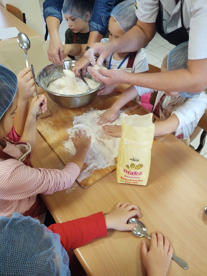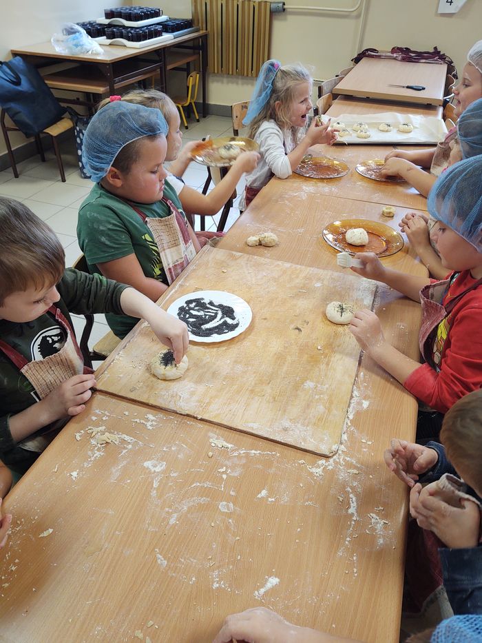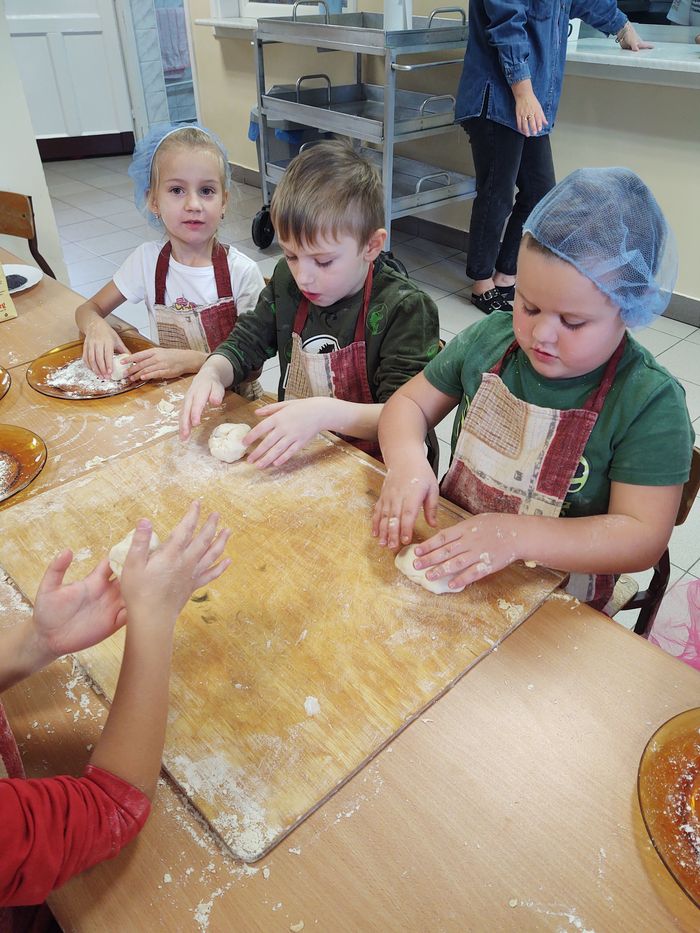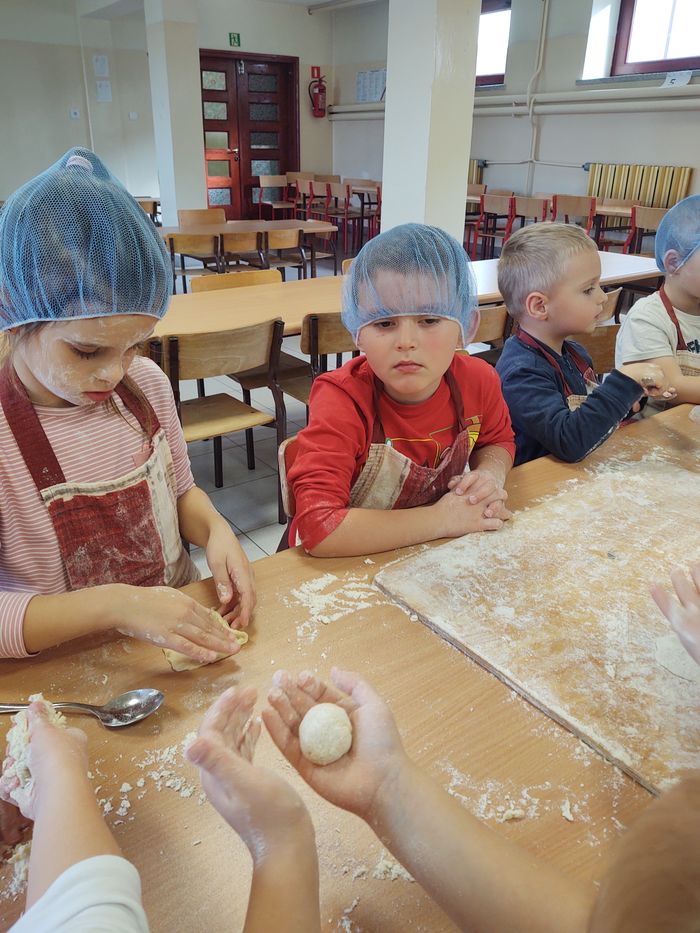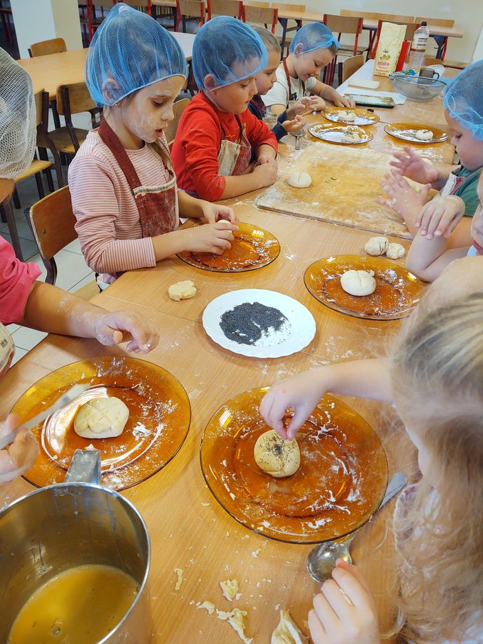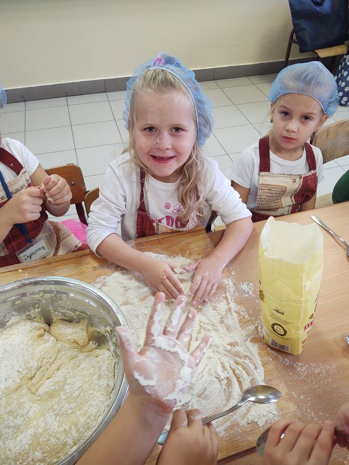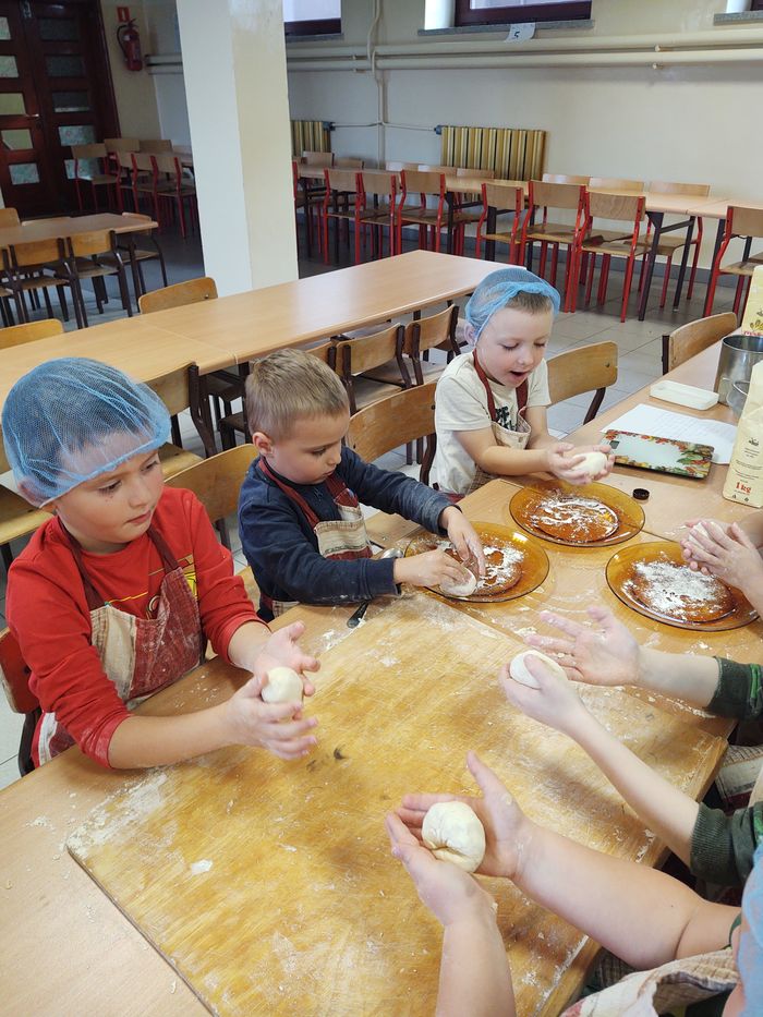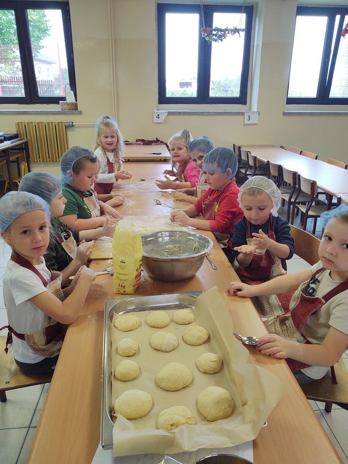 16 października obchodzony jest Światowy Dzień Chleba. Z tej okazji przedszkolaki z grupy Biedronek, w ramach innowacji „Podróż do krainy zmysłów”, zamieniły się w prawdziwych piekarzy. Podczas zajęć dzieci obejrzały film edukacyjny „Od ziarenka do bochenka”, który zaznajomił je z etapami powstawania chleba. Przedszkolaki dowiedziały się jak długą drogę musi pokonać ziarno zboża, by mogło zamienić się w pyszny chleb. Ponadto film uświadomił dzieciom jak dawniej wyglądała produkcja mąki, jak ciążka to była praca. W tym roku zamiast chleba postanowiliśmy upiec dwa rodzaje bułeczek – pszenne i drożdżowe. Proces wypieku pieczywa niej jest łatwy i wymaga czasu. Najpierw przedszkolaki poznały wszystkie składniki potrzebne do przygotowania ciasta, po czym własnoręcznie sporządziły zaczyn, który musiał przez pewien czas się odstać. W między czasie dzieci uformowały swoje pierwsze bułeczki z ciasta drożdżowego, przygotowanego wcześniej przez panie kucharki. Następnie przedszkolaki razem zarabiały ciasto na bułki pszenne. Dodawały kolejno składniki, mieszały, zagniatały, a przy okazji mogły poczuć jak pachnie zaczyn i wyrabiane ciasto. Przyrządzanie własnych bułeczek dostarczyło naszym milusińskim wielu bodźców sensorycznych, a także ogrom radości i uśmiechu na twarzy. Na koniec, kiedy bułki już się upiekły, nadszedł czas na degustację. Każdy przedszkolak spróbował własnoręcznie zrobionych bułeczek, a także zabrał je do domu, by poczęstować nimi rodzinę.
