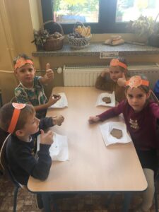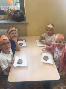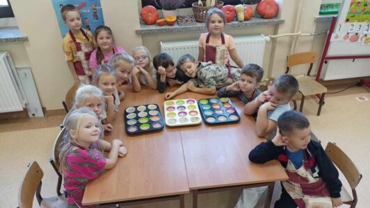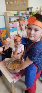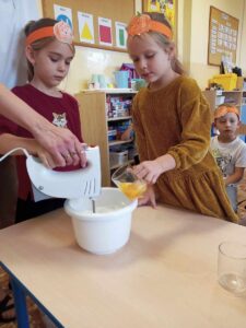 Bez wątpienia jedną z największych atrakcji podczas zajęć było robienie ciasta dyniowego. Dzieci ochoczo odmierzały składniki, mieszały je, a po upieczeniu dumnie degustowały swoich własnych wypieków.