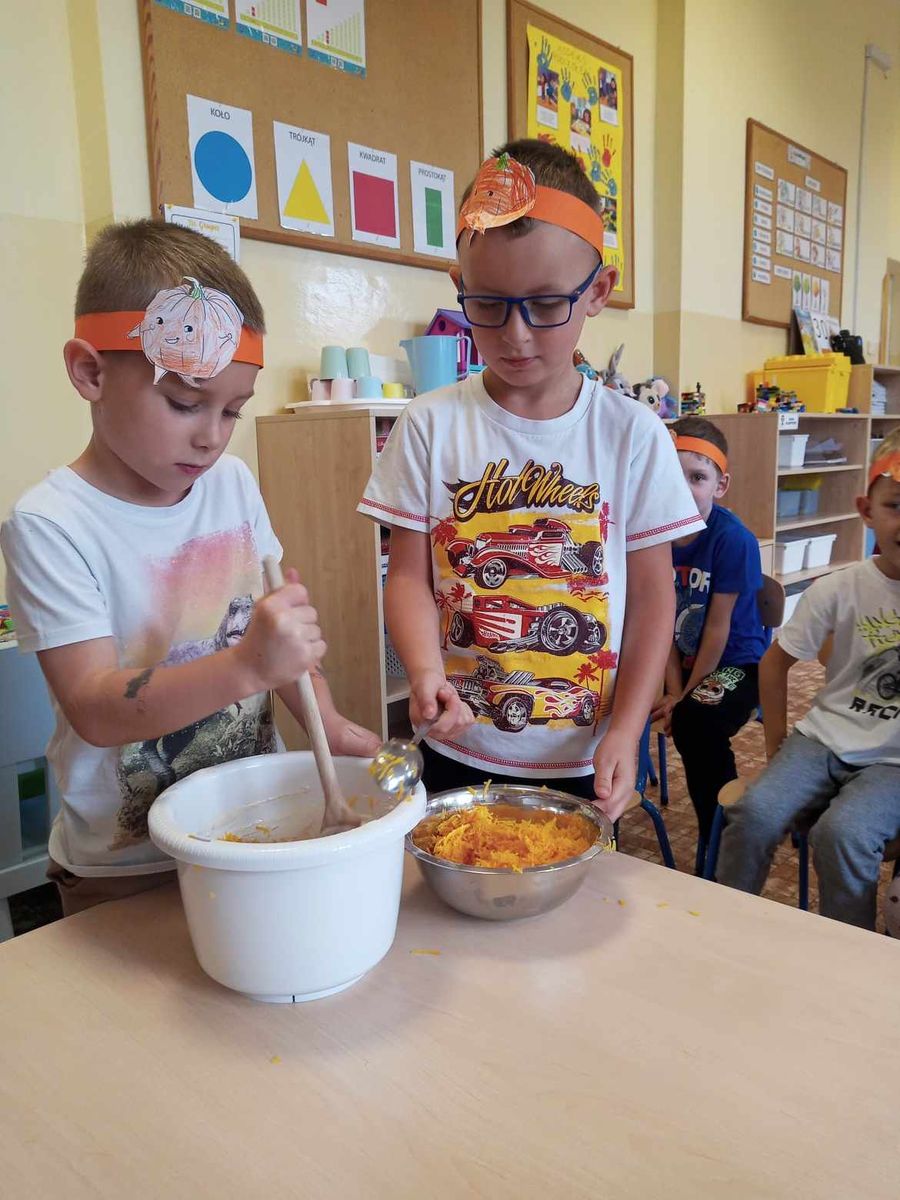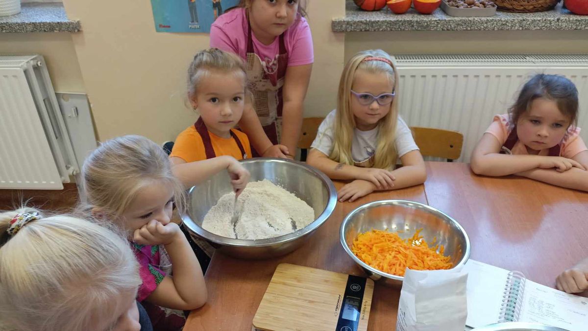 Bez wątpienia jedną z największych atrakcji podczas zajęć było robienie ciasta dyniowego. Dzieci ochoczo odmierzały składniki, mieszały je, a po upieczeniu dumnie degustowały swoich własnych wypieków.