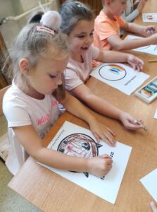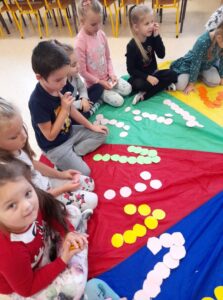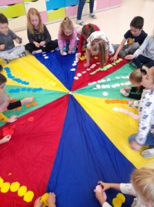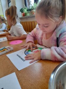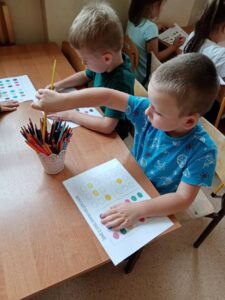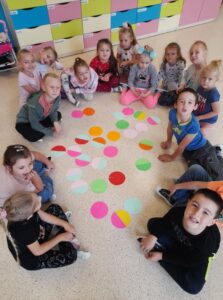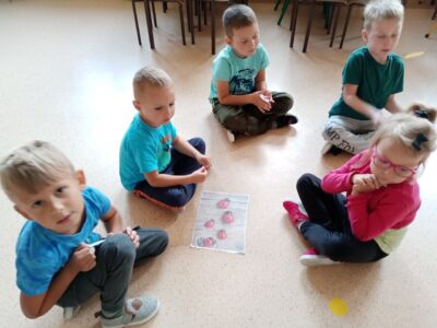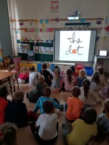Międzynarodowy Dzień Kropki to święto obchodzone 15 września w 196 krajach na całym świecie. Jego głównym celem jest wzbudzenie u dzieci kreatywności, pomysłowości oraz zachęcenie ich do tworzenia, działania. Tego dnia Motylki i Biedronki obejrzały film pt. „The Dot”. Bohaterką opowiadania jest mała dziewczynka o imieniu Vashti, która dzięki zwykłej kropce i mądrej nauczycielce plastyki, odkryła w sobie talent i odzyskała wiarę w swoje możliwości. Historia ta uświadomiła naszym przedszkolakom, że każdy z nas ma jakieś ukryte zdolności. Dzień upłynął wszystkim pod znakiem wspaniałej twórczej zabawy. Dzieci dostrzegły kropki tam, gdzie wcześniej nikt nie zwracał na nie uwagi. Okazało się, że kropki towarzyszą nam w naszym codziennym życiu. Przedszkolaki uczestniczyły w zabawach ruchowych oraz manipulacjach matematycznych z wykorzystaniem kropek i kółek. Na koniec dnia powstały również pomysłowe prace plastyczne oczywiście z kropką w roli głównej.