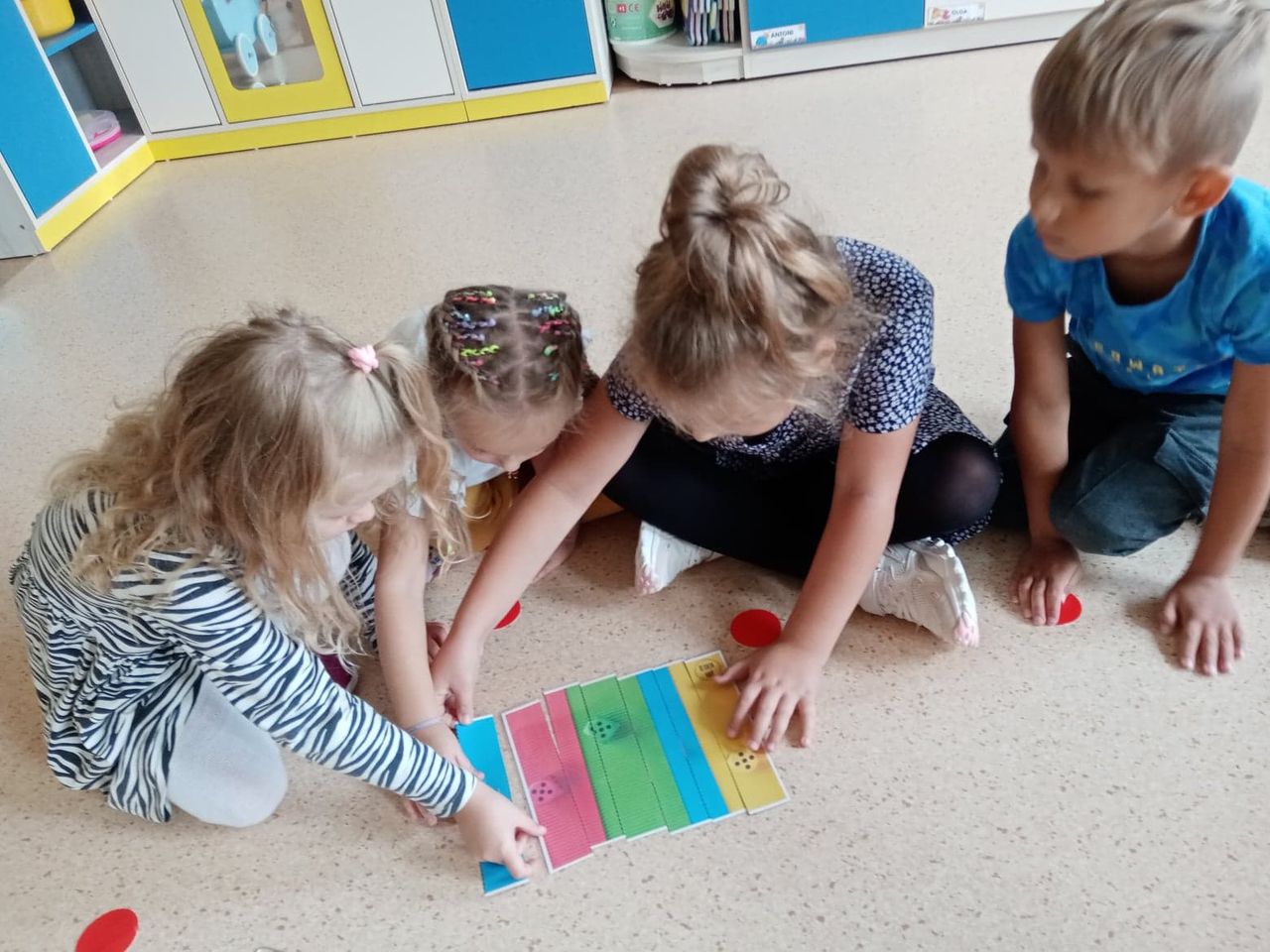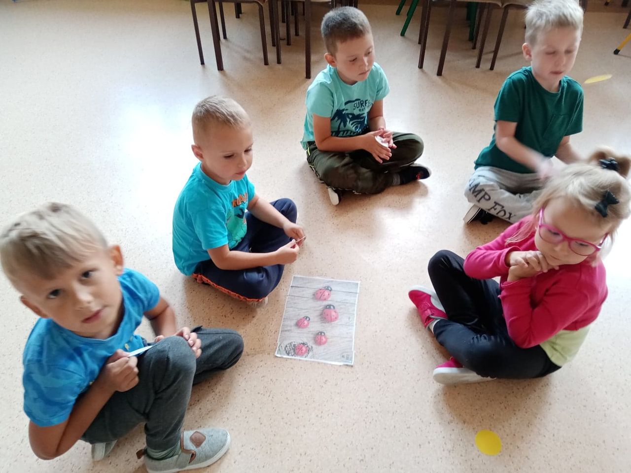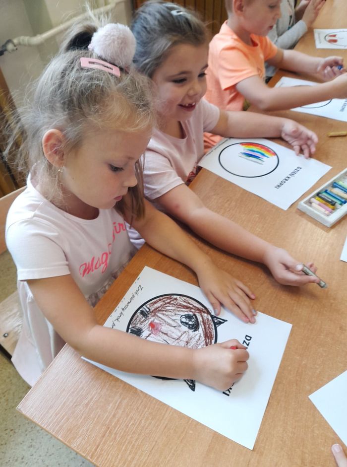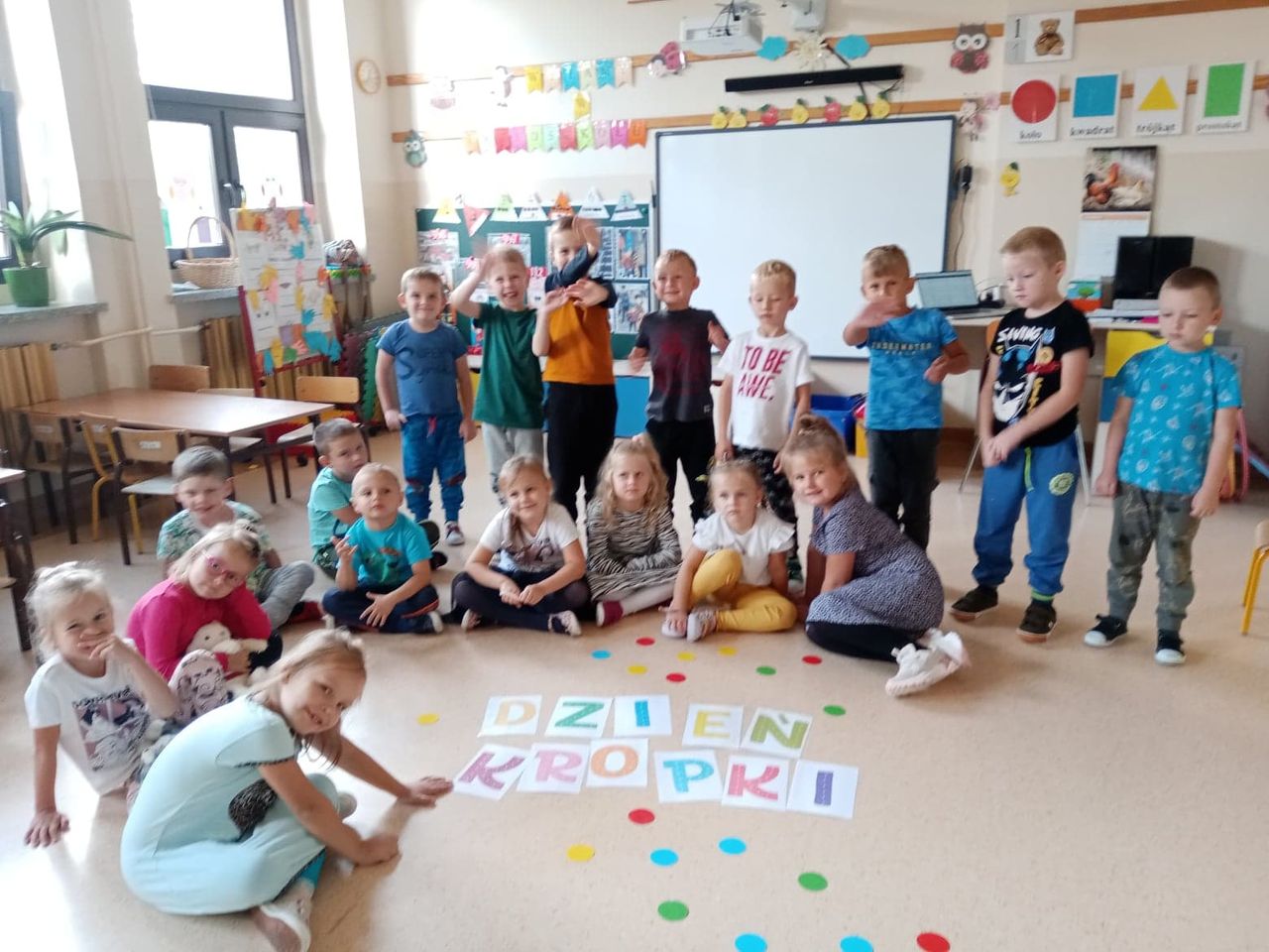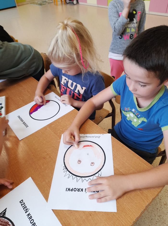 Międzynarodowy Dzień Kropki to święto obchodzone 15 września w 196 krajach na całym świecie. Jego głównym celem jest wzbudzenie u dzieci kreatywności, pomysłowości oraz zachęcenie ich do tworzenia, działania. Tego dnia Motylki i Biedronki obejrzały film pt. „The Dot”. Bohaterką opowiadania jest mała dziewczynka o imieniu Vashti, która dzięki zwykłej kropce i mądrej nauczycielce plastyki, odkryła w sobie talent i odzyskała wiarę w swoje możliwości. Historia ta uświadomiła naszym przedszkolakom, że każdy z nas ma jakieś ukryte zdolności. Dzień upłynął wszystkim pod znakiem wspaniałej twórczej zabawy. Dzieci dostrzegły kropki tam, gdzie wcześniej nikt nie zwracał na nie uwagi. Okazało się, że kropki towarzyszą nam w naszym codziennym życiu. Przedszkolaki uczestniczyły w zabawach ruchowych oraz manipulacjach matematycznych z wykorzystaniem kropek i kółek. Na koniec dnia powstały również pomysłowe prace plastyczne oczywiście z kropką w roli głównej.