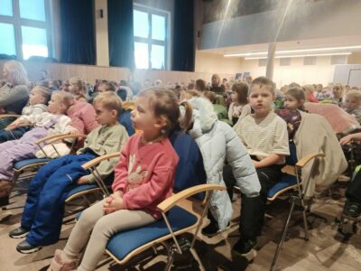 Dzieci razem z chórem zaśpiewały najpiękniejsze polskie kolędy, poznając ich słowa, melodie oraz znaczenie świątecznych tradycji. Wspólne kolędowanie pozwoliło przedszkolakom rozwijać zdolności muzyczne, poczucie rytmu, a także kształtować wrażliwość na kulturę i radość z bycia razem.