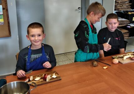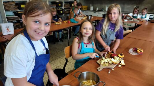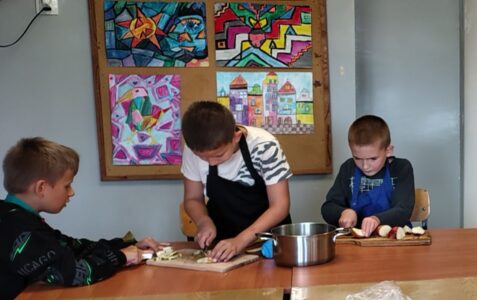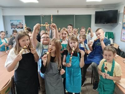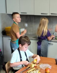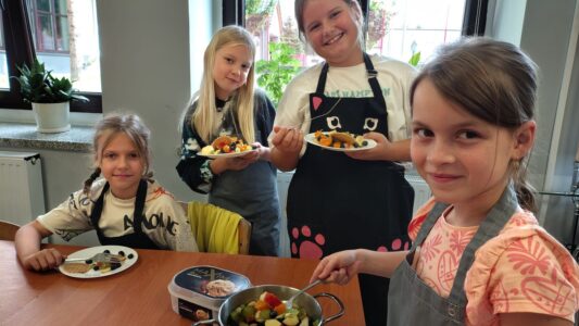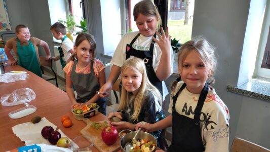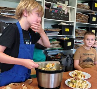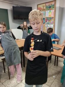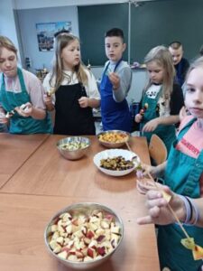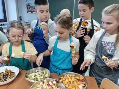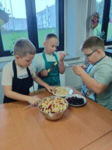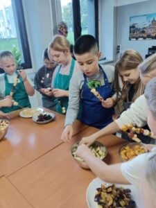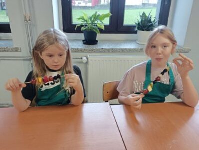 Dzieci odziane w fartuszki, korzystając ze szkolnych przyborów kuchennych, samodzielnie przygotowywały zdrowe przekąski – kolorowe szaszłyki owocowe oraz pyszną sałatkę. Podczas zajęć uczyły się nie tylko bezpiecznego posługiwania się narzędziami, ale także zasad higieny, pracy zespołowej i… odpowiedzialności za swoje stanowisko.