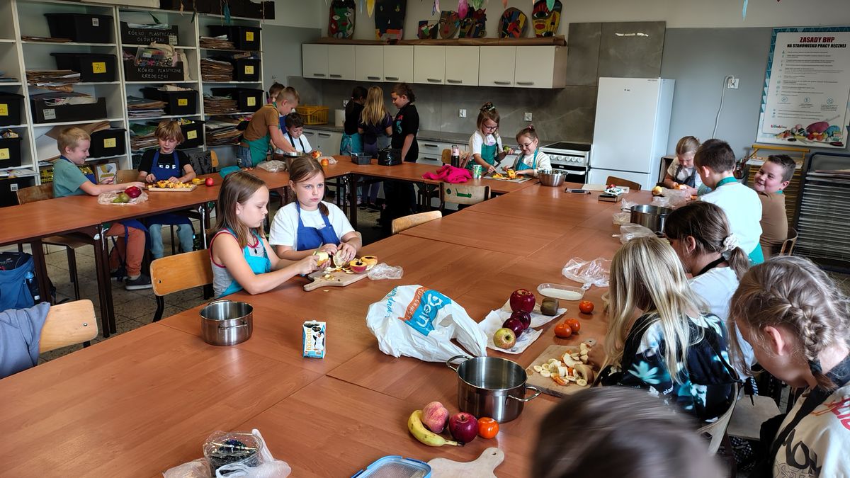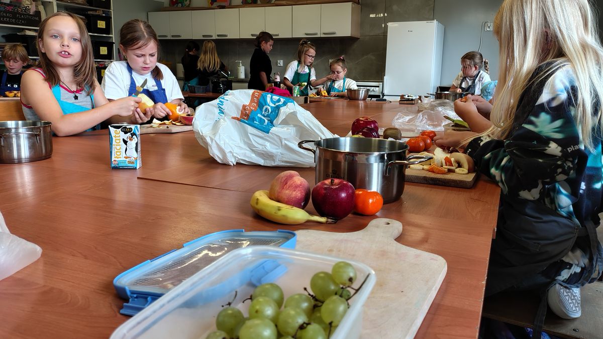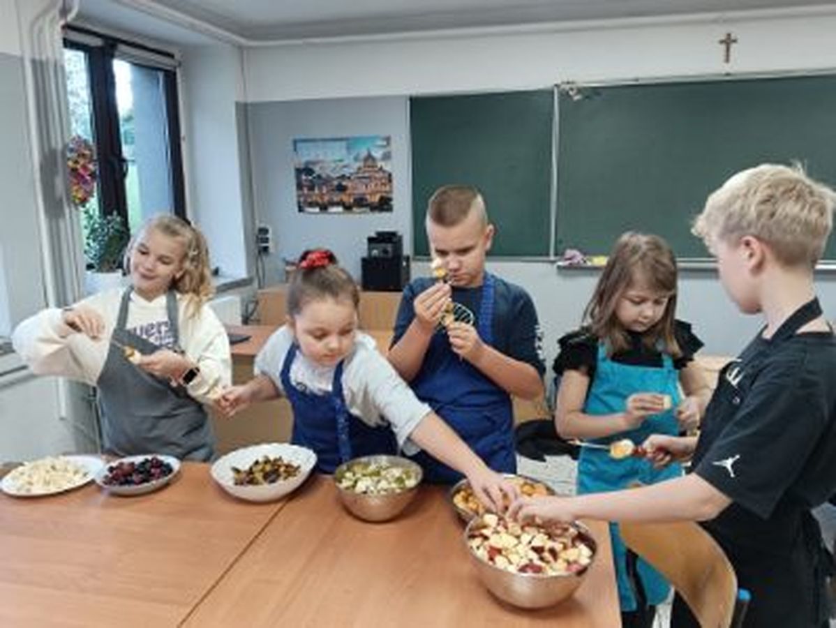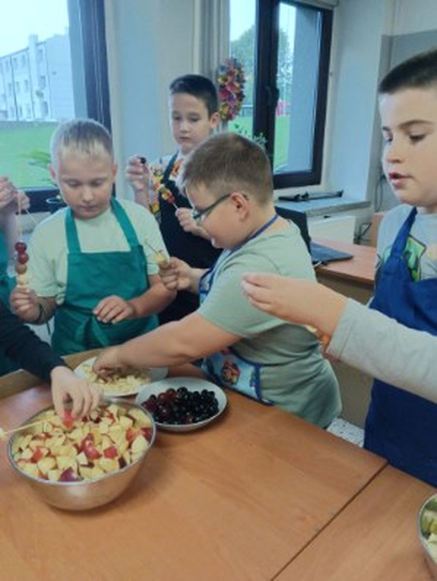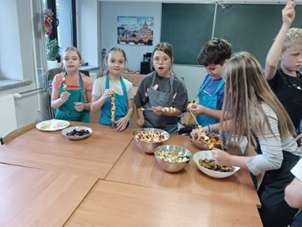 Dzieci odziane w fartuszki, korzystając ze szkolnych przyborów kuchennych, samodzielnie przygotowywały zdrowe przekąski – kolorowe szaszłyki owocowe oraz pyszną sałatkę. Podczas zajęć uczyły się nie tylko bezpiecznego posługiwania się narzędziami, ale także zasad higieny, pracy zespołowej i… odpowiedzialności za swoje stanowisko.