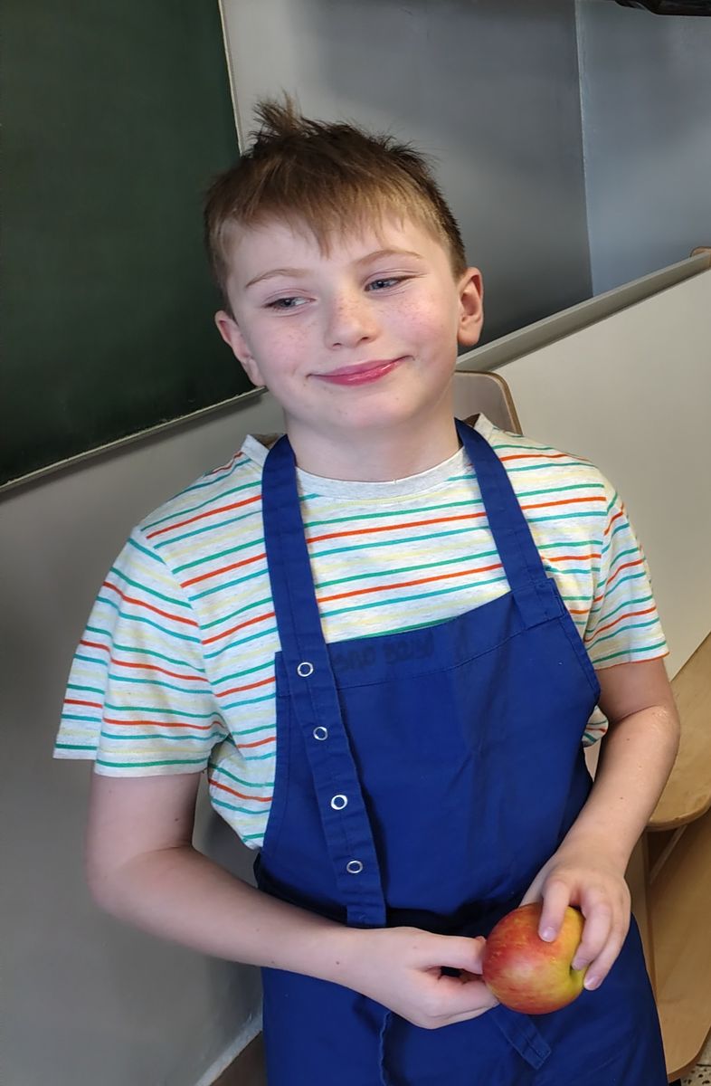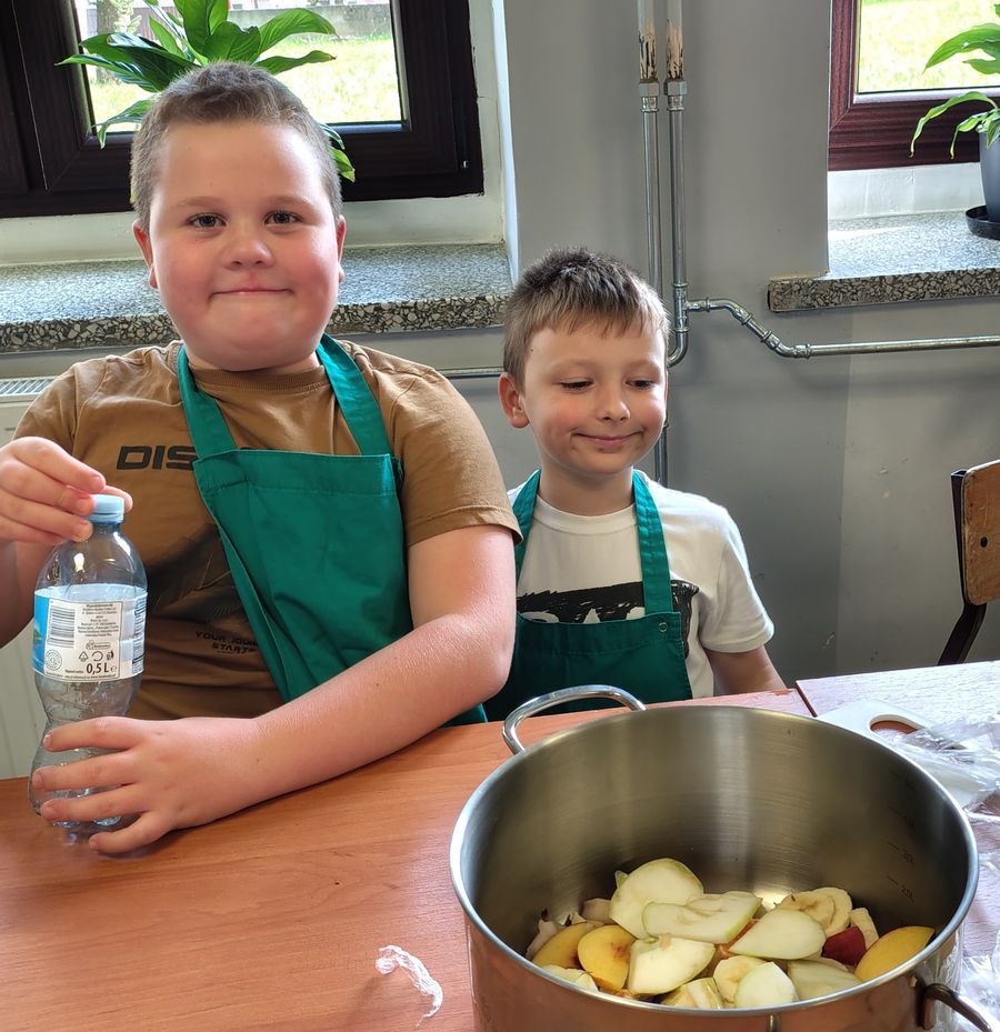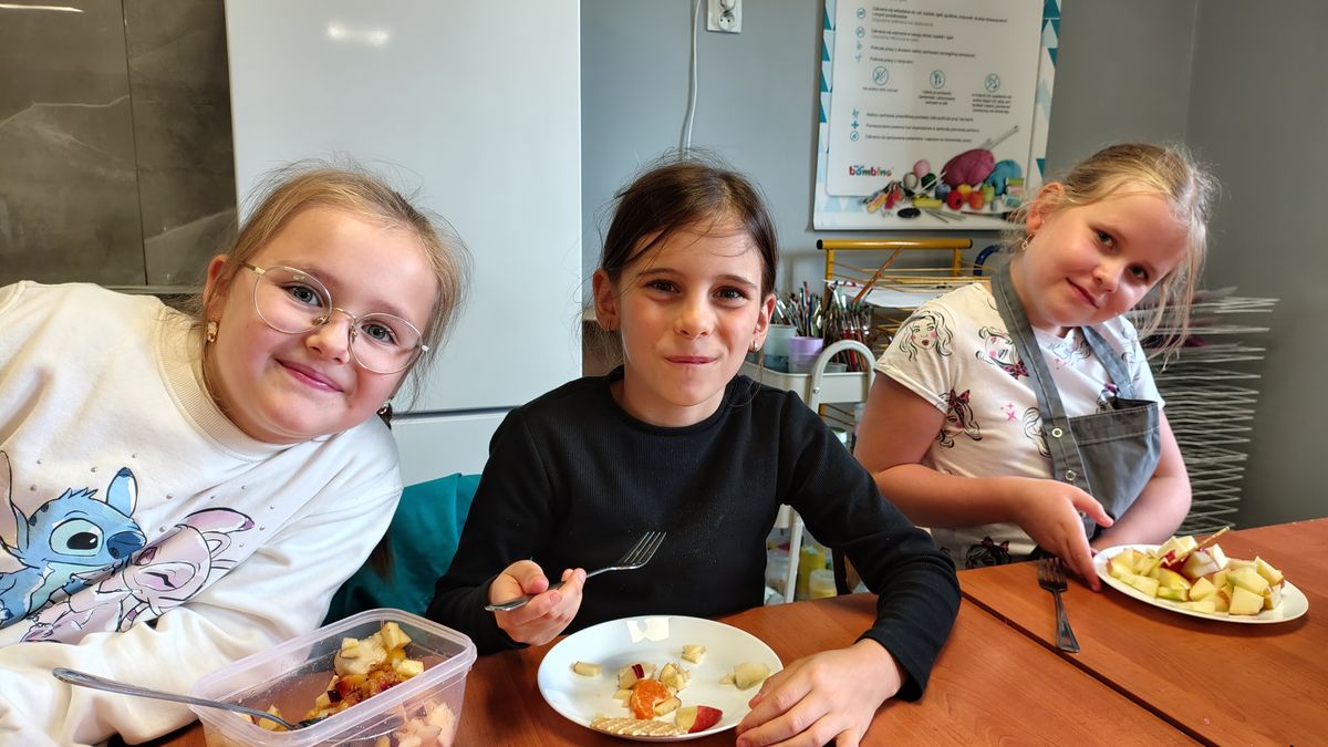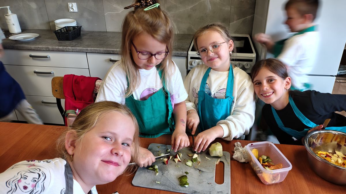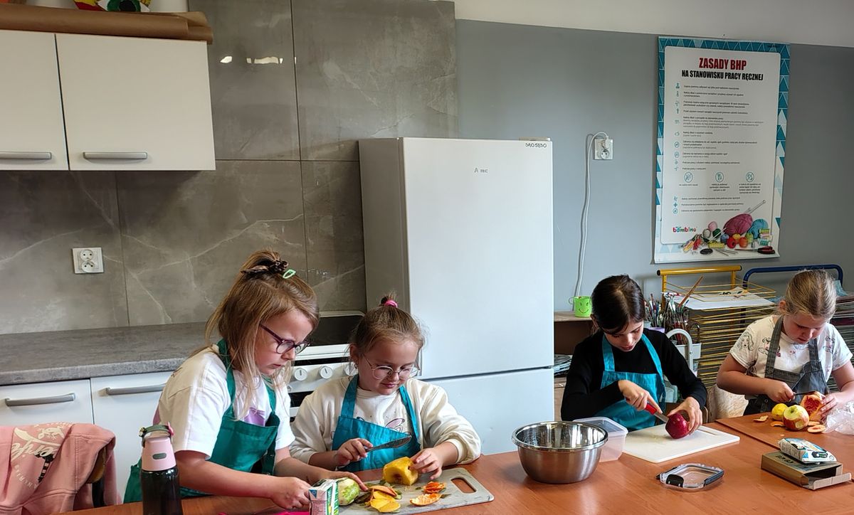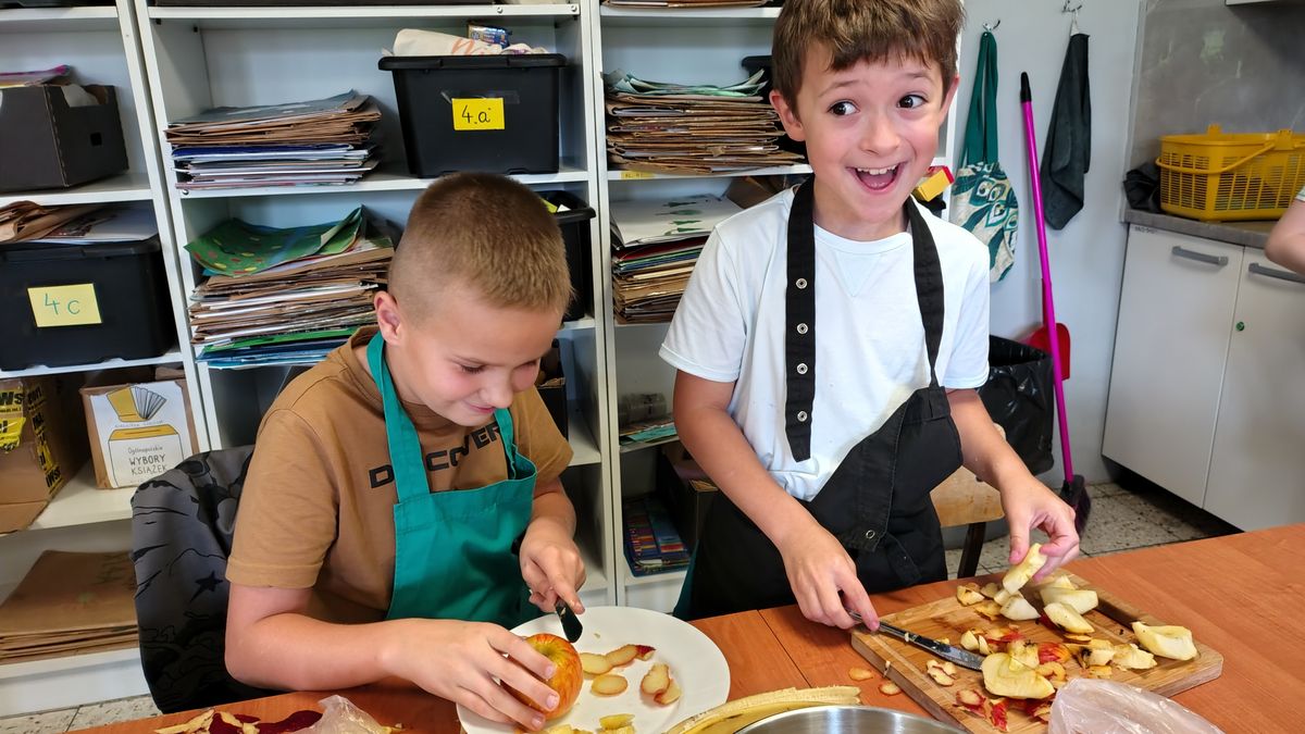 Dzieci odziane w fartuszki, korzystając ze szkolnych przyborów kuchennych, samodzielnie przygotowywały zdrowe przekąski – kolorowe szaszłyki owocowe oraz pyszną sałatkę. Podczas zajęć uczyły się nie tylko bezpiecznego posługiwania się narzędziami, ale także zasad higieny, pracy zespołowej i… odpowiedzialności za swoje stanowisko.