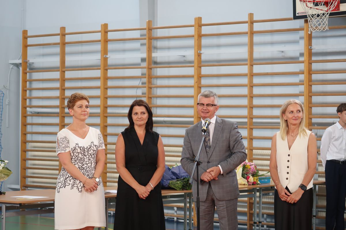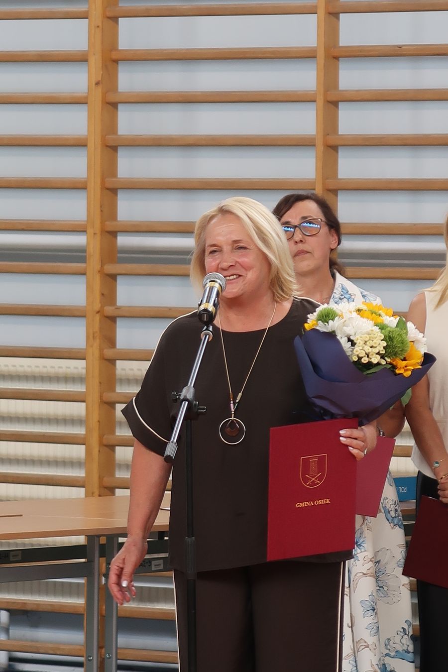 Następnie głos zabrał wójt Gminy Osiek, pan Marek Jasiński, który wyraził uznanie dla osiągnięć uczniów, nazywając ich ambasadorami gminy. Podziękował nauczycielom, dyrekcji, Radzie Rodziców i wszystkim pracownikom szkoły za ich trud, zaangażowanie i codzienną pracę. Na zakończenie złożył wszystkim życzenia bezpiecznych, radosnych wakacji oraz zaprosił na zbliżające się Dni Osieka – coroczne święto lokalnej społeczności.