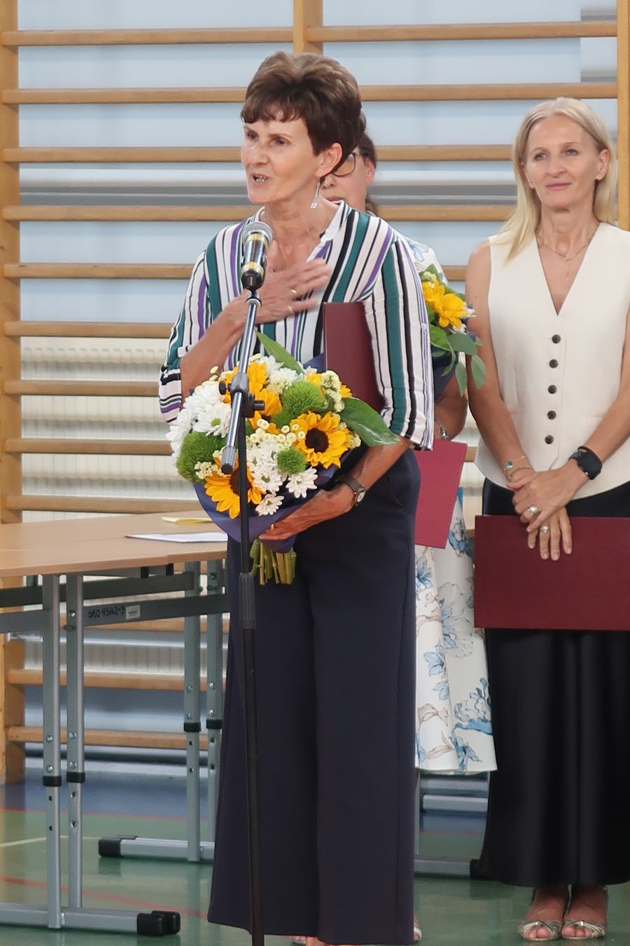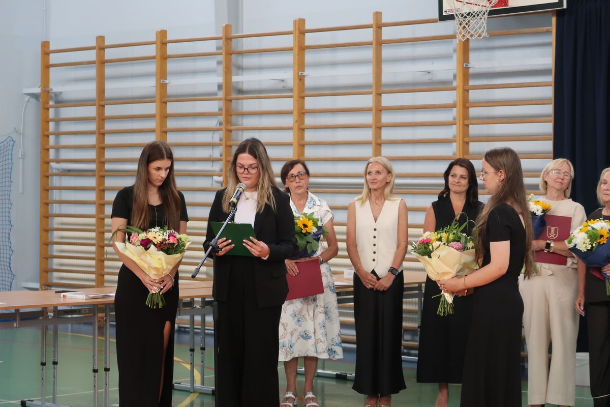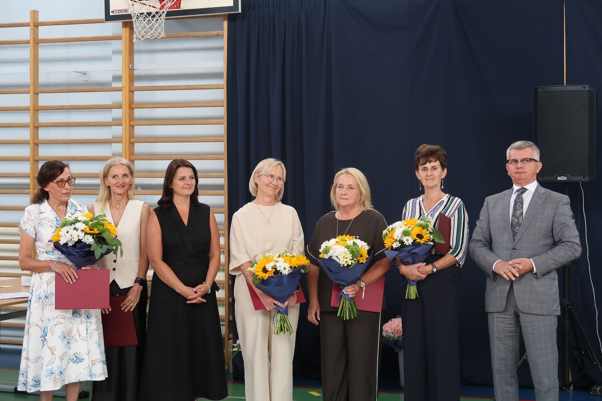Nie zabrakło także pożegnań. Ze wzruszeniem i ogromną wdzięcznością pożegnano nauczycieli i pracowników szkoły, którzy w tym roku przeszli na zasłużoną emeryturę: panią Katarzynę Matlak, panią Jadwigę Szałajko, panią Małgorzatę Sikorę, panią Lucynę Drabczyk oraz pana Aleksandra Piaseckiego. Ich wieloletnia praca, oddanie uczniom i wkład w rozwój szkoły pozostaną na zawsze w pamięci całej społeczności.