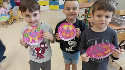 Przedszkolaki wykonały torbę na zakupy wielokrotnego użytku, samodzielnie zrobiły zakupy w przedszkolnym sklepie, oraz wykonały „Talerz zdrowego żywienia”.
