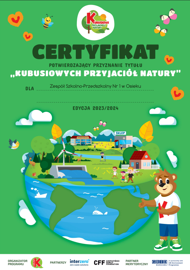 Po przeprowadzeniu programu nasze przedszkole nabyło prawo do posługiwania się Certyfikatem „Kubusiowi Przyjaciele Natury”.