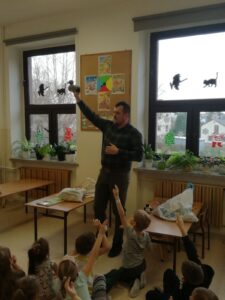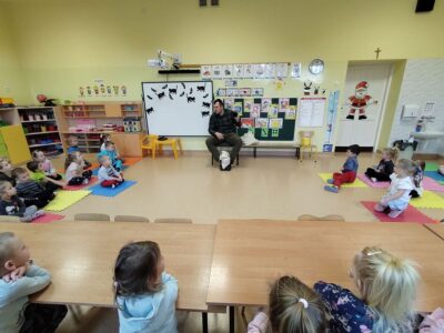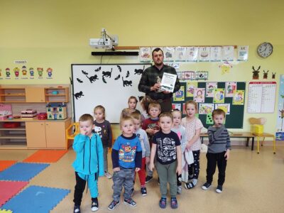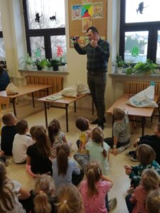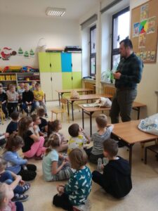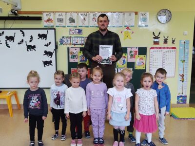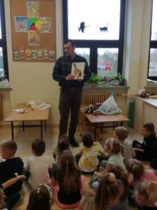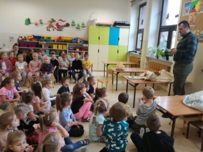 1 grudnia 2021r przedszkolaki odwiedził pan leśniczy z nadleśnictwa w Andrychowie, który przybliżył dzieciom tajniki swojej pracy. Opowiedział im o ptakach i innych zwierzętach, które mogą spotkać w naszych lasach. Przedstawił różne ciekawostki na ich temat. Dzieci z zainteresowaniem słuchały przedstawianych informacji, a na koniec przekazały leśniczemu nazbierane jesienią żołędzie i kasztany, które staną się pożywieniem dla zwierząt podczas nadchodzącej zimy.