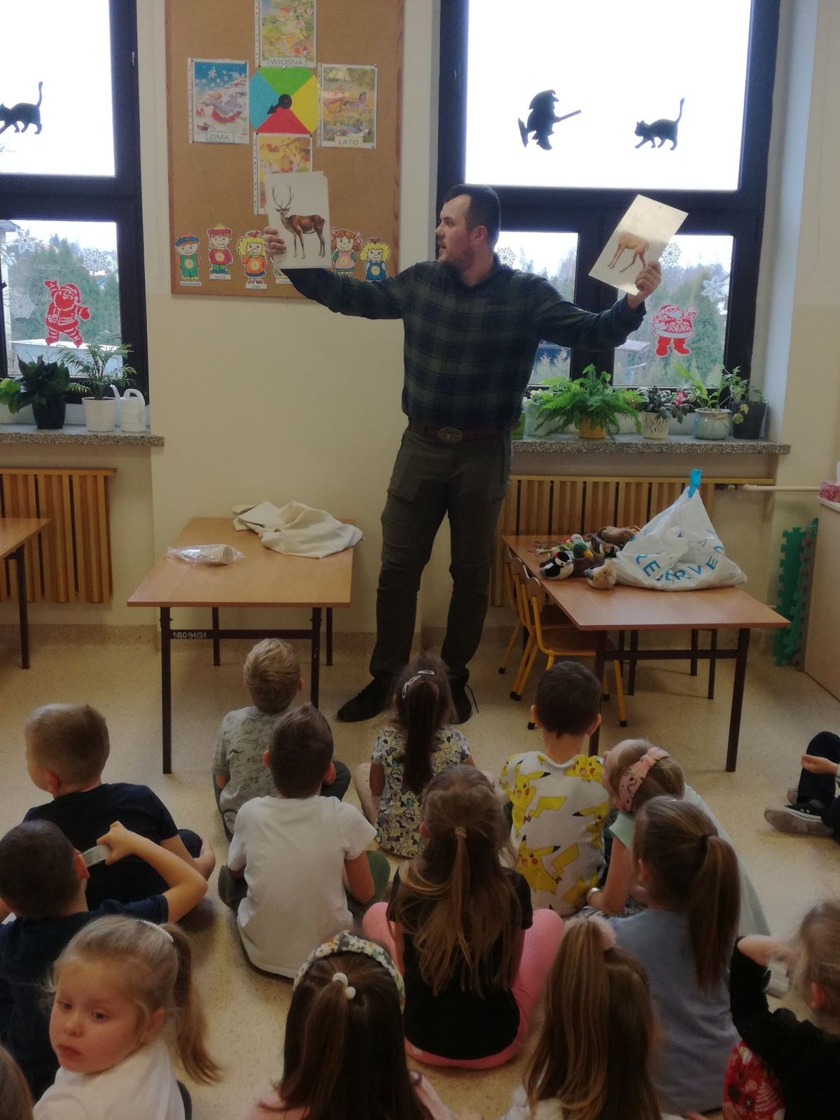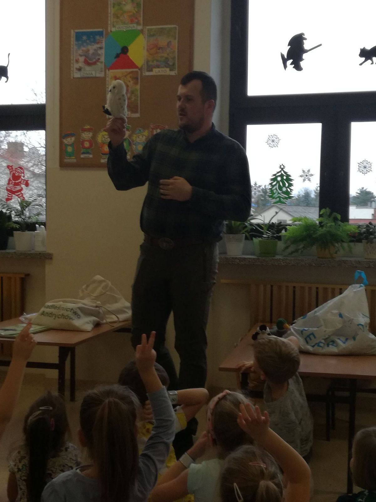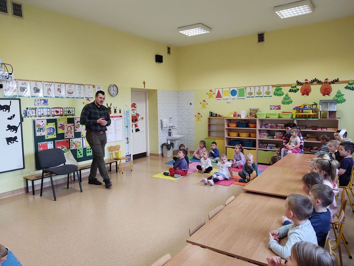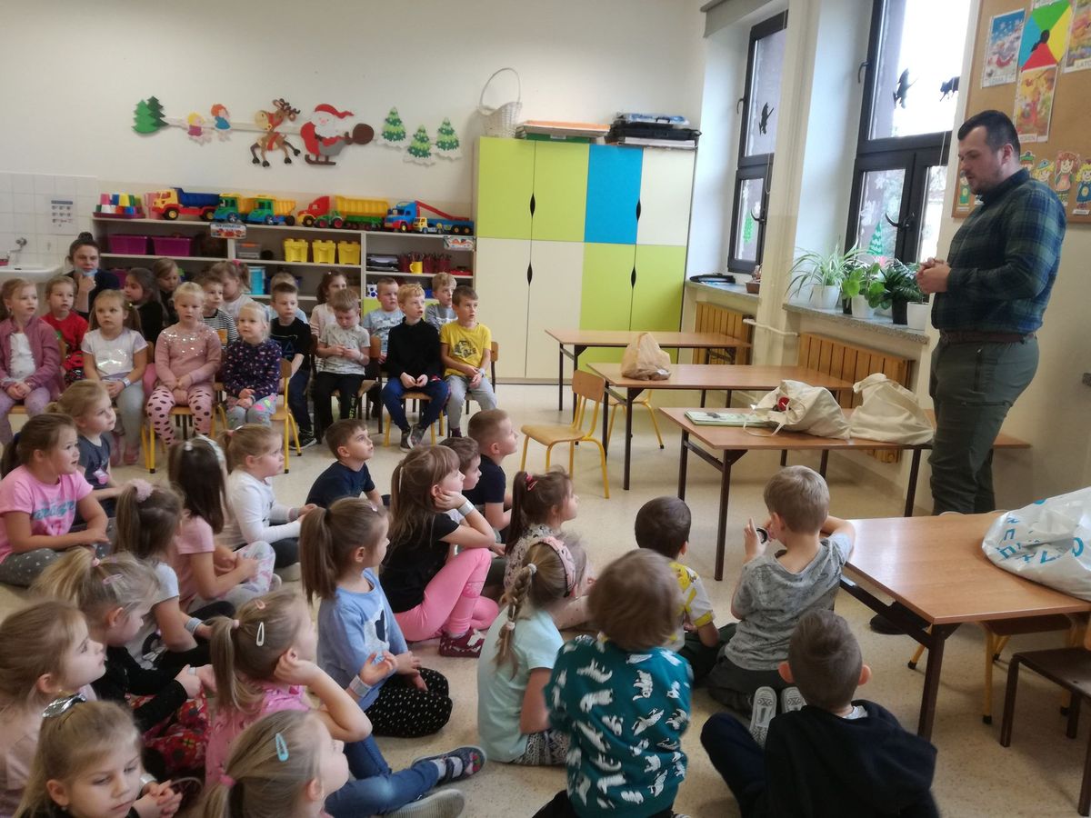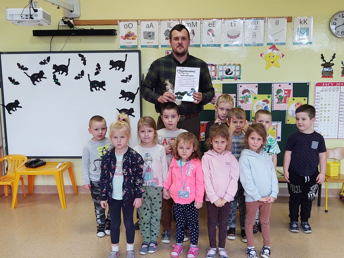 1 grudnia 2021r przedszkolaki odwiedził pan leśniczy z nadleśnictwa w Andrychowie, który przybliżył dzieciom tajniki swojej pracy. Opowiedział im o ptakach i innych zwierzętach, które mogą spotkać w naszych lasach. Przedstawił różne ciekawostki na ich temat. Dzieci z zainteresowaniem słuchały przedstawianych informacji, a na koniec przekazały leśniczemu nazbierane jesienią żołędzie i kasztany, które staną się pożywieniem dla zwierząt podczas nadchodzącej zimy.