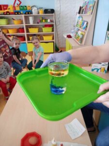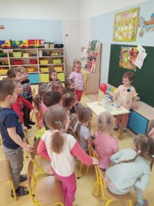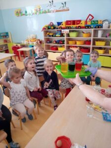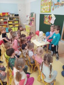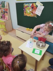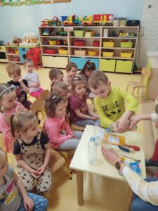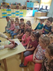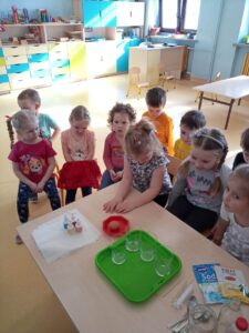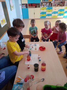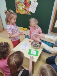 W myśl chińskiego filozofa Konfucjusza w grupie Zajączków odbyły się bardzo ciekawe zajęcia badawcze. Zajęcia o charakterze eksperymentu, zwane również zabawami badawczymi są niezwykle istotne w wielokierunkowym rozwoju dziecka oraz zaspokajaniu naturalnej ciekawości poznawania otaczającego je świata. Tego typu zabawy pozwalają na doświadczanie nowych wrażeń, odkrywanie nieznanych dotychczas właściwości przedmiotów i zjawisk, prowadzenie obserwacji oraz wyciąganie trafnych wniosków z przeprowadzonych eksperymentów. Na zajęciach dzieci wykonywały różnorodne doświadczenia z wodą. Była lawa w butelce, kolorowe wulkany, tańczący olej i burza w szklance wody. Oprócz tego przedszkolaki eksperymentowały z jajkami. Oddzielały żółtka od białek za pomocą butelki oraz ubijały białka. Jakież było zdziwienie dzieci, gdy okazało się, że ubite białka nie spadną nam na głowę! Zajączki wykonały również doświadczenie „gumowe jajko” z octem, a także dowiedziały się jak można nadmuchać balony przy użyciu octu oraz sody oczyszczonej. Zabawy te przyniosły dzieciom mnóstwo radości.