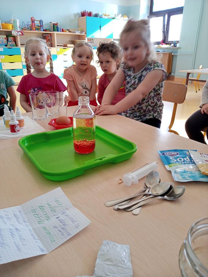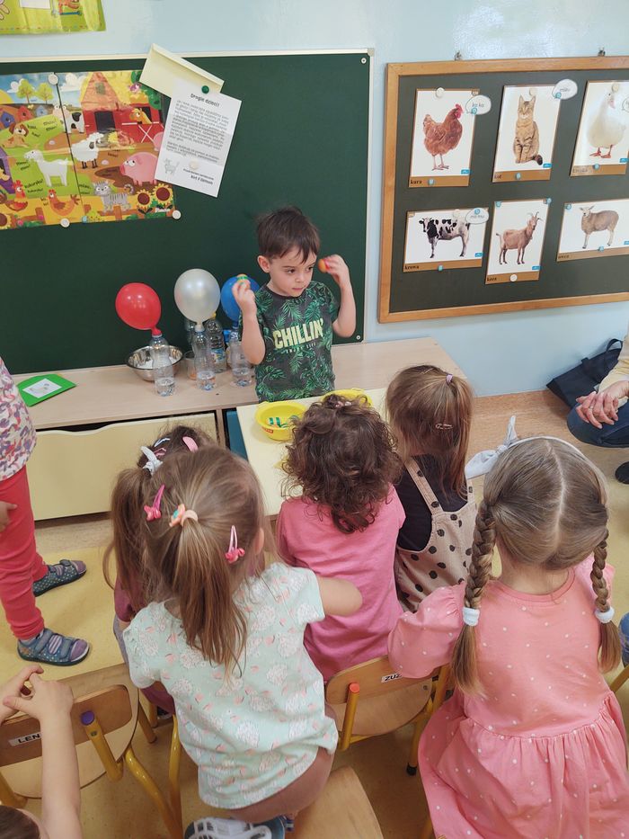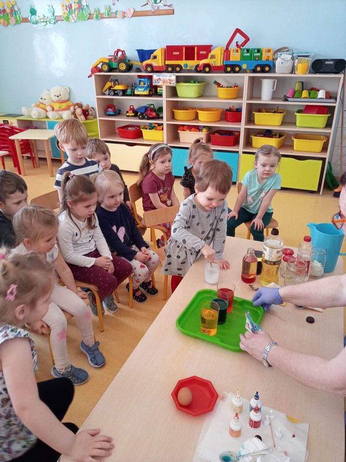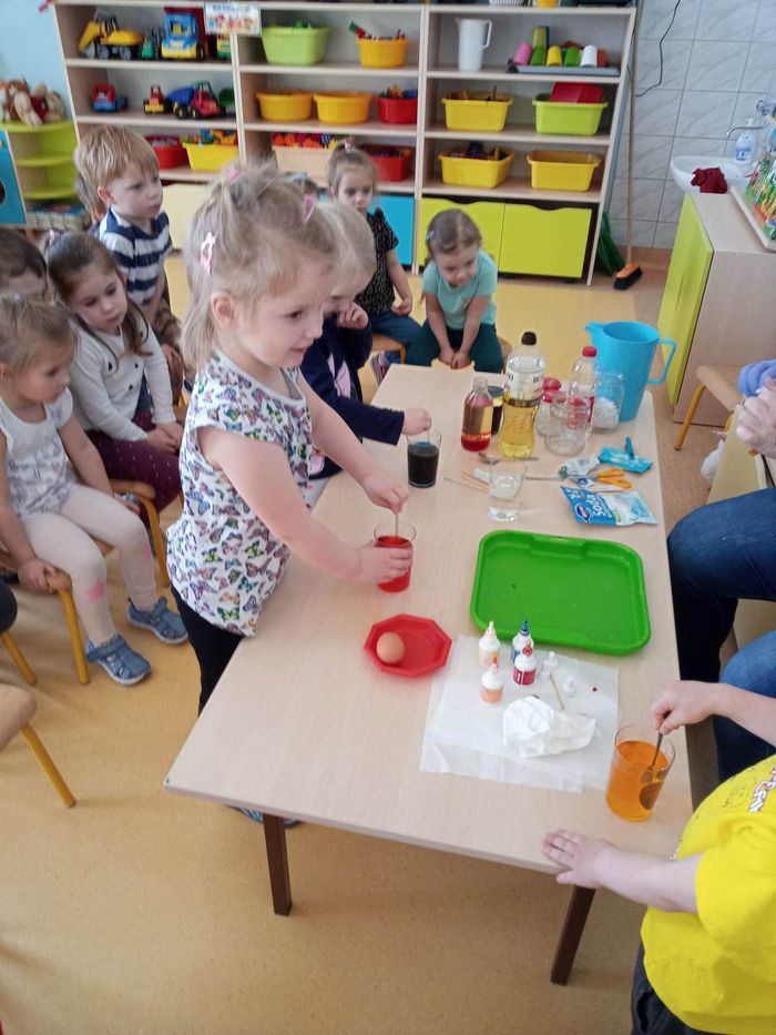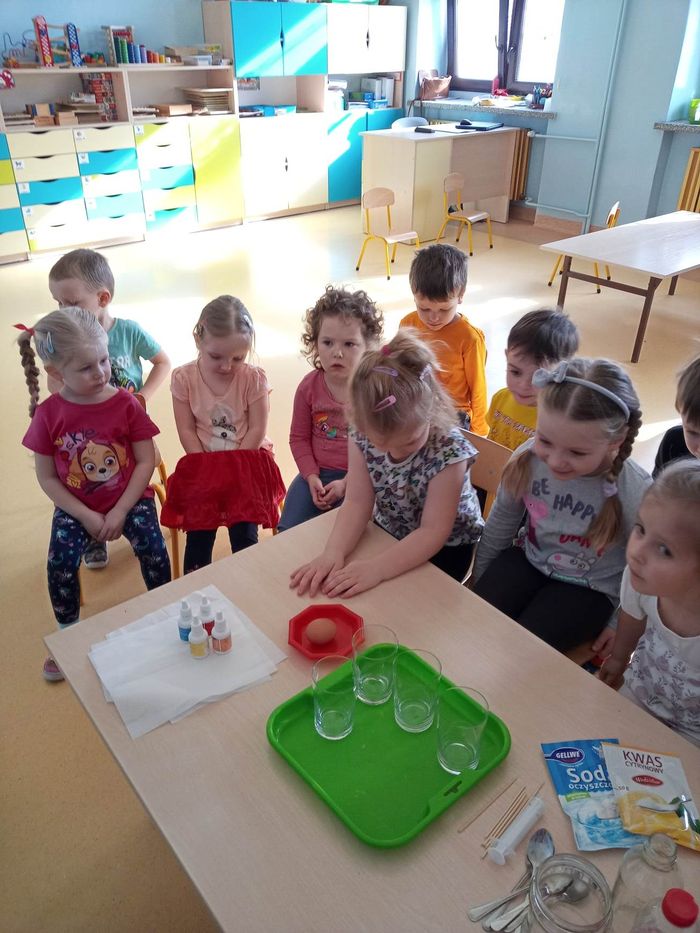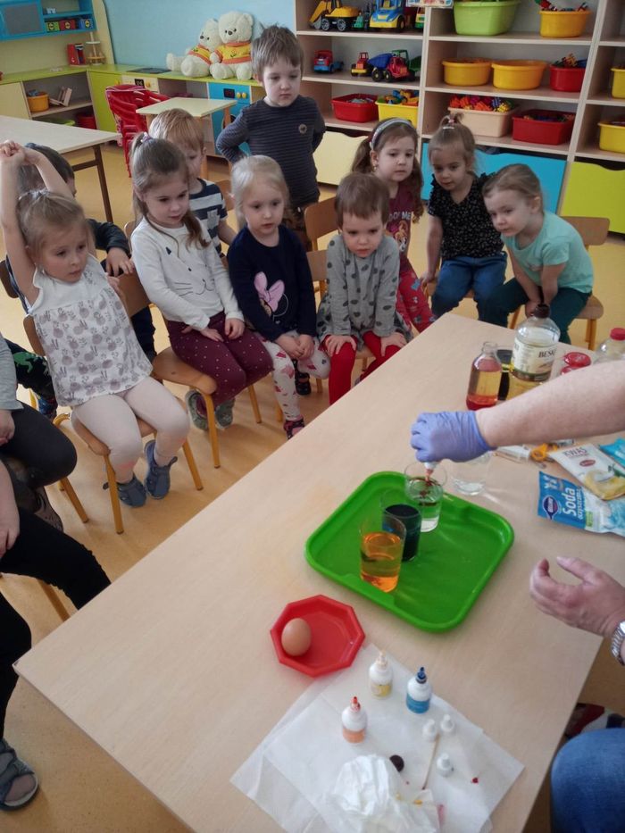 W myśl chińskiego filozofa Konfucjusza w grupie Zajączków odbyły się bardzo ciekawe zajęcia badawcze. Zajęcia o charakterze eksperymentu, zwane również zabawami badawczymi są niezwykle istotne w wielokierunkowym rozwoju dziecka oraz zaspokajaniu naturalnej ciekawości poznawania otaczającego je świata. Tego typu zabawy pozwalają na doświadczanie nowych wrażeń, odkrywanie nieznanych dotychczas właściwości przedmiotów i zjawisk, prowadzenie obserwacji oraz wyciąganie trafnych wniosków z przeprowadzonych eksperymentów. Na zajęciach dzieci wykonywały różnorodne doświadczenia z wodą. Była lawa w butelce, kolorowe wulkany, tańczący olej i burza w szklance wody. Oprócz tego przedszkolaki eksperymentowały z jajkami. Oddzielały żółtka od białek za pomocą butelki oraz ubijały białka. Jakież było zdziwienie dzieci, gdy okazało się, że ubite białka nie spadną nam na głowę! Zajączki wykonały również doświadczenie „gumowe jajko” z octem, a także dowiedziały się jak można nadmuchać balony przy użyciu octu oraz sody oczyszczonej. Zabawy te przyniosły dzieciom mnóstwo radości.