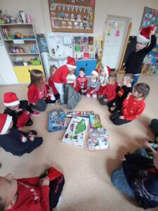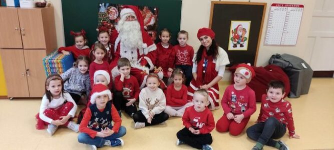 5 grudnia na sali WDK w Osieku wszystkie przedszkolaki oglądały przedstawienie pt. „Zimowe igraszki ze św. Mikołajem” w wykonaniu Teatru Skrzat z Krakowa. Dzieci były zachwycone spektaklem, ale największa niespodzianka czekała na nie dopiero na końcu. Do Osieka zawitał bowiem Mikołaj z workiem pełnym prezentów dla wszystkich przedszkolaków! Na ten dzień dzieci czekały już od dawna. Z niecierpliwością odliczaliśmy dni do spotkania z Mikołajem, a kiedy w końcu nastał ten dzień, radości nie było końca. Mikołaj wręczył dzieciom prezenty dla każdej grupy przedszkolnej, a także paczuszkę pełną łakoci dla każdego z osobna. Wszystkie dzieci ochoczo śpiewały piosenki dla Mikołaja, których uczyły się już od dłuższego czasu, a także zrobiły sobie z Mikołajem pamiątkowe zdjęcia. W workach czekały na przedszkolaki wspaniałe prezenty. Zachwycone dzieci od razu przystąpiły do zabawy nowymi zabawkami.