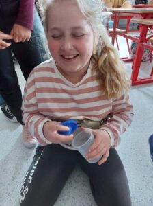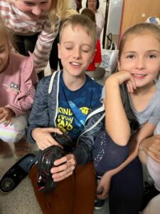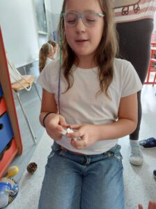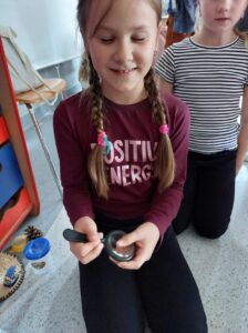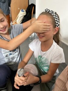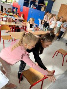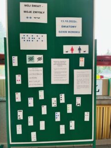 Pierwsze zajęcia dotyczyły zmysłu wzroku. Uczniowie poznali zasady dbania o swój wzrok; dowiedzieli się  jakie trudności towarzyszą  osobom z niepełnosprawnością wzrokową w ich funkcjonowaniu; wysłuchali ciekawych informacji dotyczących psa przewodnika oraz oglądali krótki, tematyczny film edukacyjny dla dzieci. Wspólnie poznali zasady pomocy osobie niewidomej w  Jej  życiu codziennym. Dzieci uczestniczyły także w tematycznej zabawie sensorycznej. Zapoznały się   z alfabetem Braille’a oraz wypełniły swój ,,sześcio punkt”.