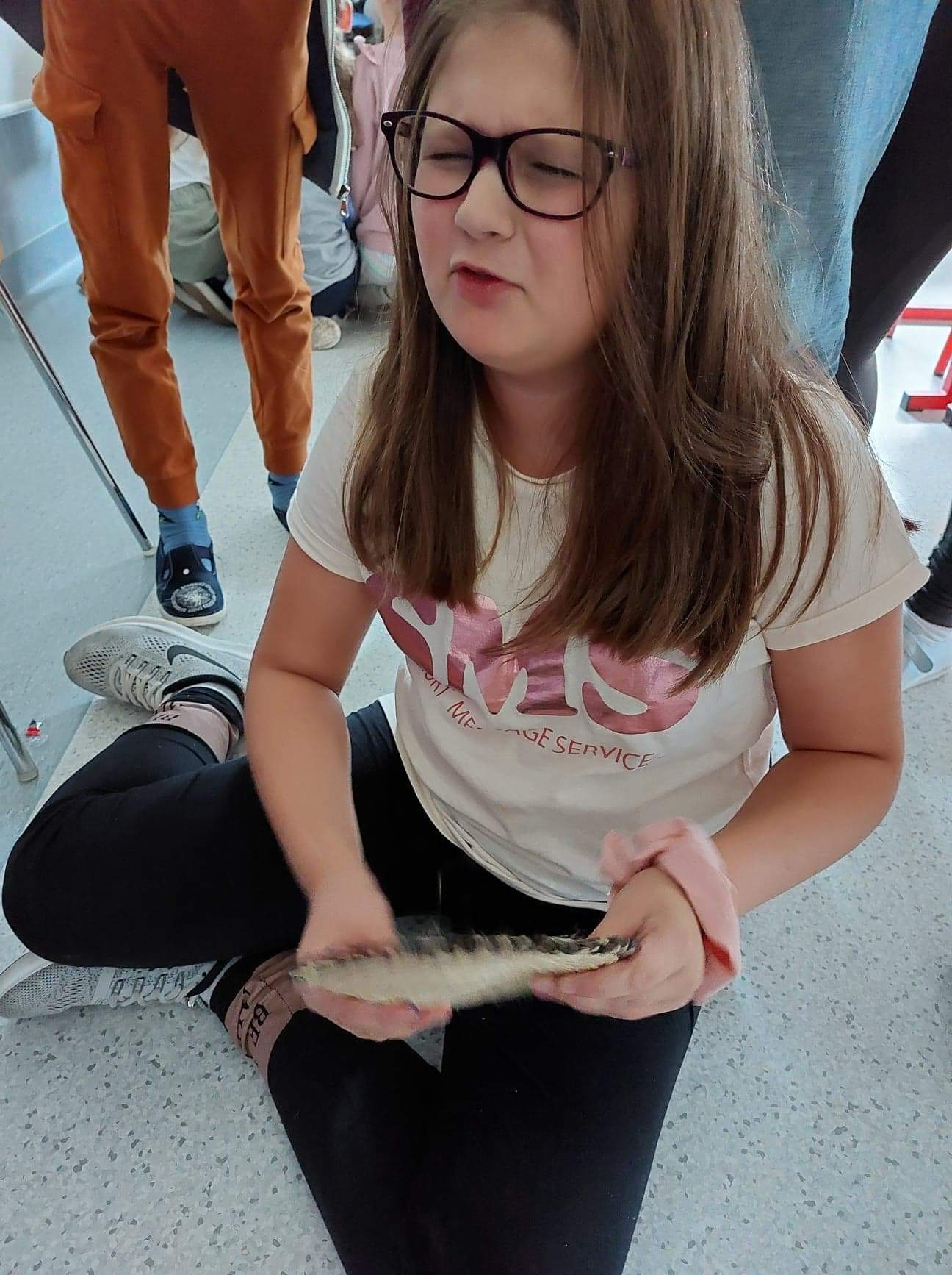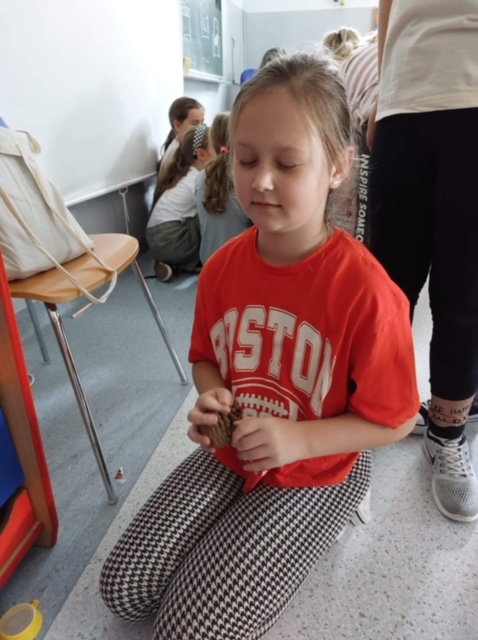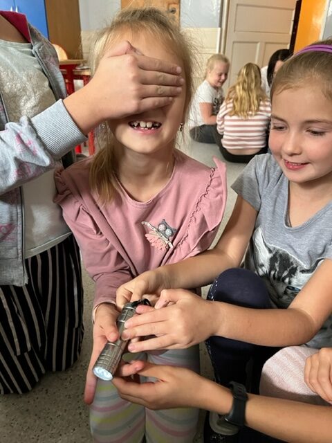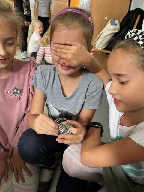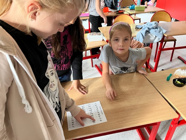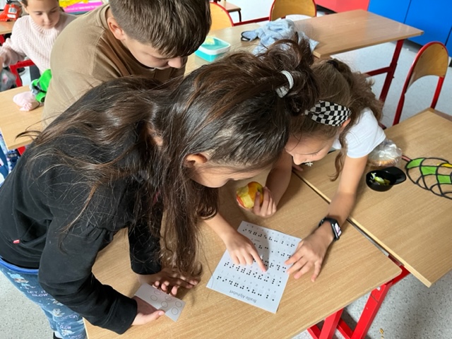 Pierwsze zajęcia dotyczyły zmysłu wzroku. Uczniowie poznali zasady dbania o swój wzrok; dowiedzieli się  jakie trudności towarzyszą  osobom z niepełnosprawnością wzrokową w ich funkcjonowaniu; wysłuchali ciekawych informacji dotyczących psa przewodnika oraz oglądali krótki, tematyczny film edukacyjny dla dzieci. Wspólnie poznali zasady pomocy osobie niewidomej w  Jej  życiu codziennym. Dzieci uczestniczyły także w tematycznej zabawie sensorycznej. Zapoznały się   z alfabetem Braille’a oraz wypełniły swój ,,sześcio punkt”.