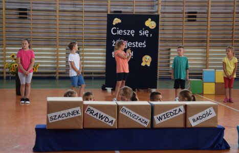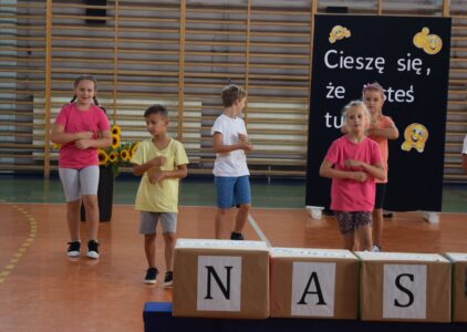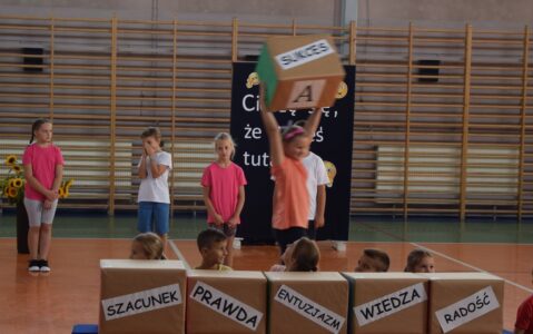 Po części oficjalnej nastąpiła część artystyczna w wykonaniu uczniów klas 2 wraz z paniami Anną Kacorzyk i Anetą Kałą. Dzieci w radosny, energiczny i żywiołowy sposób zwróciły uwagę na ważne rzeczy, przede wszystkim uśmiech, który ociepli każde relacje. Przy pomocy świetnie przygotowanych rekwizytów zaprezentowały wartości naszej szkoły: szacunek, tolerancję, mądrość, dobro, radość, prawdę, entuzjazm, wiedzę, pasję, kreatywność, sukces. Wykonali także układ taneczny. Na uwagę zasługuje fakt, iż uczniowie poświęcili kilka ostatnich, wakacyjnych dni, by uczestniczyć w próbach do występu, który okazał się ich pierwszym sukcesem w tym roku szkolnym i został nagrodzony gromkimi brawami.