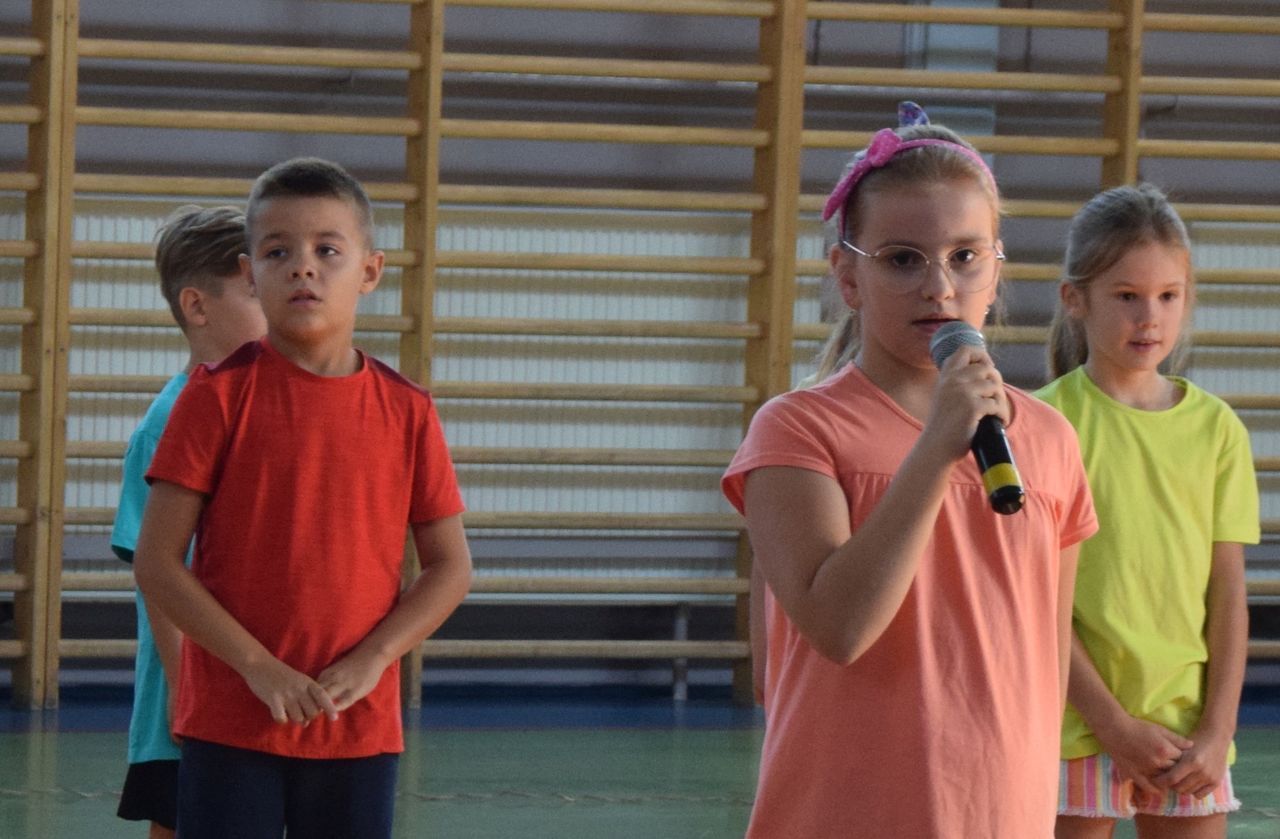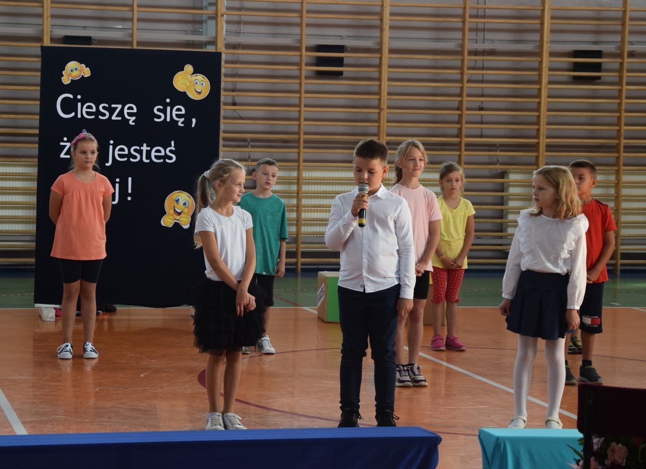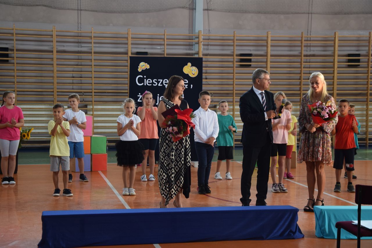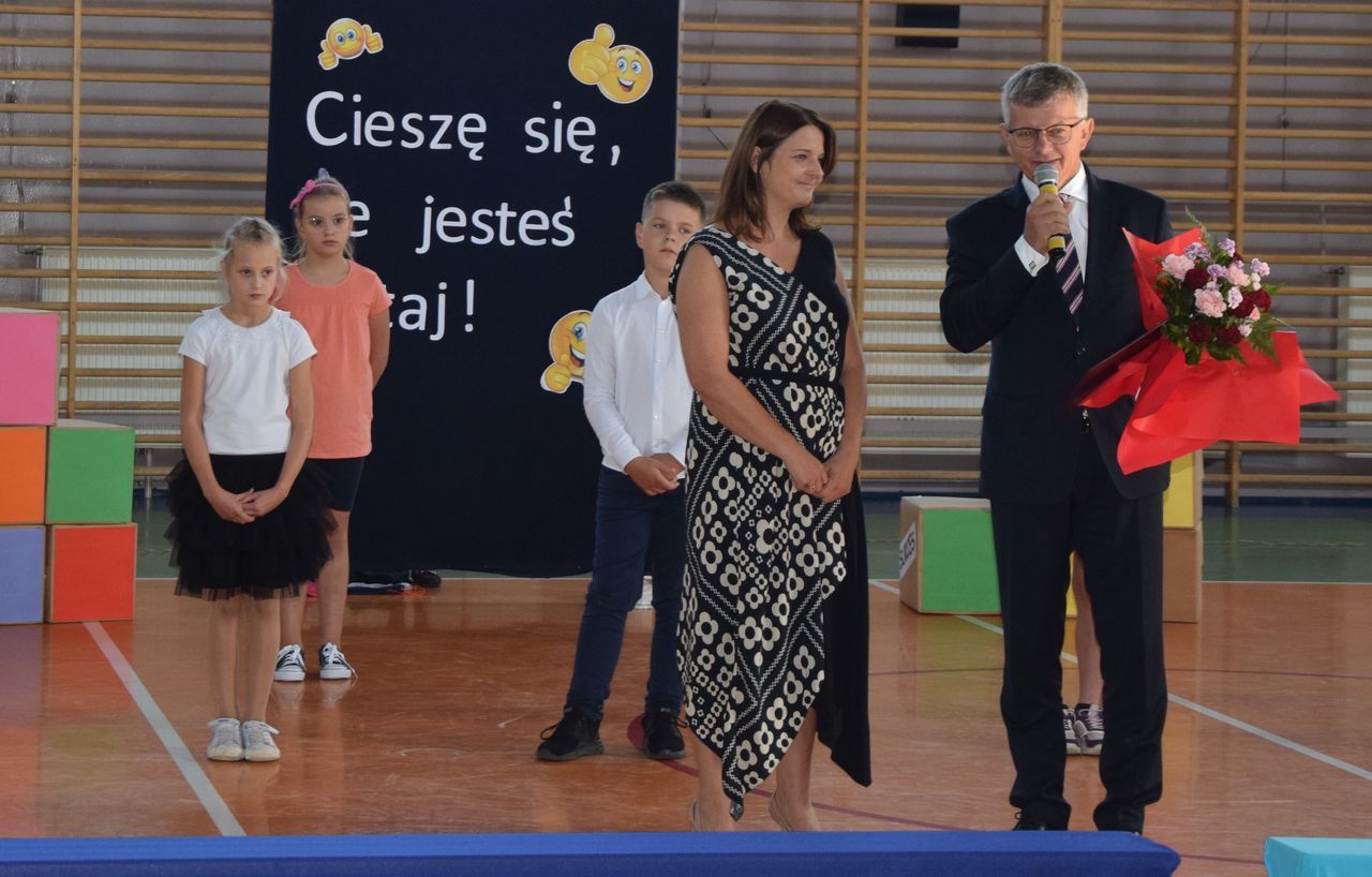 Pani Dyrektor Monika Rycerz powitała wszystkich uczniów na sali gimnastycznej, życząc im sukcesów i wyrażając przekonanie, że wszyscy ten sukces odniosą – sukces na własną miarę. Szkoła oferuje bowiem wiele możliwości do zaangażowania się oraz rozwijania swoich pasji. Uspokoiła także rodziców, że wszystkim nam zależy na dobru ich dzieci, dlatego liczy na współpracę i rzetelną rozmowę. Jak zwykle, z wielką radością witamy w progach szkolnych 3 oddziały pierwszoklasistów – niektórych zestresowanych, niektórych niemogących się doczekać, aż zajmą miejsce w szkolnej ławce. To dla nich wielkie przeżycie. Ale emocje i rok wytężonej pracy czekają przede wszystkim ósmoklasistów, przed którymi egzamin. Wynik zależy od nich samych, a nauczyciele na pewno posłużą pomocą. Pani Dyrektor powitała również uczniów z innych szkół, zagranicy, Ukrainy, którzy w tym roku szkolnym będą uczęszczać do naszej szkoły.