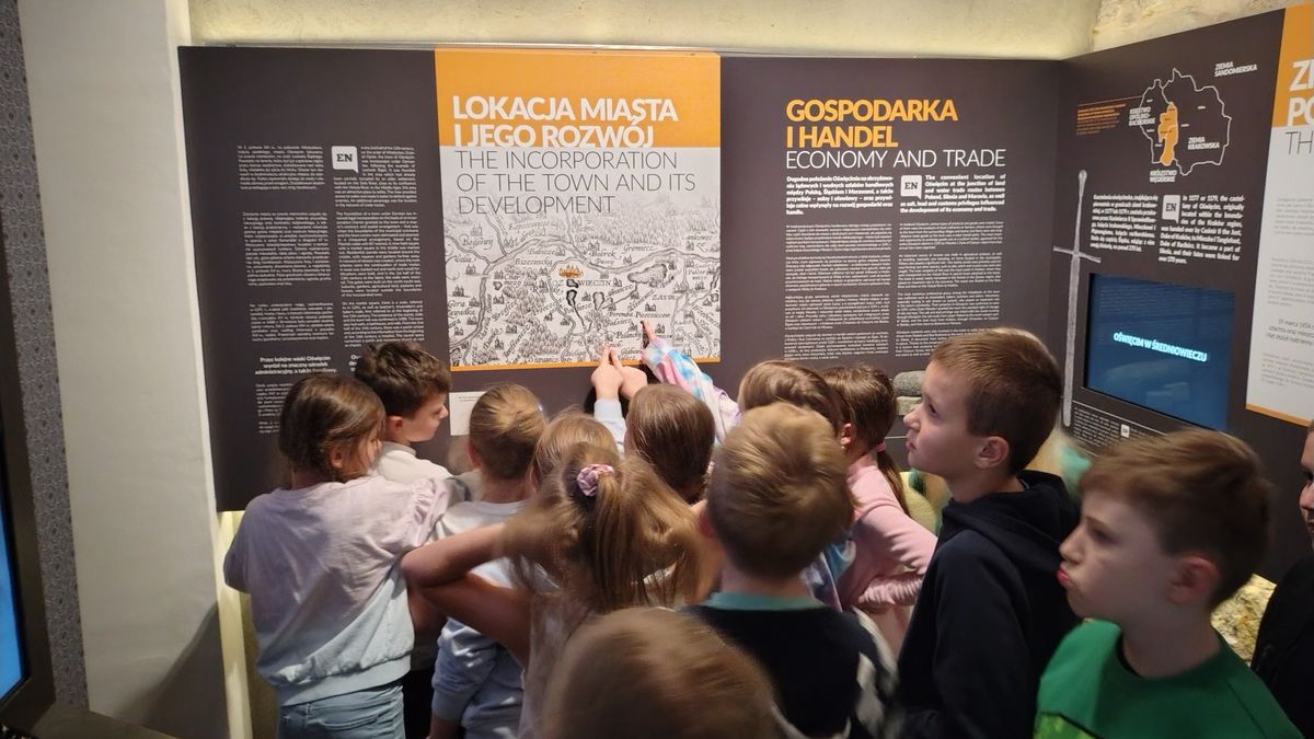 Opuszczając klimatyczne podziemia oświęcimskiego Zamku szybko przenieśliśmy się do imponującego Ratusza, który mieści się w XIX wiecznym budynku. Tam zwiedziliśmy wystawę „W przestrzeni historii. Dzieje miasta Oświęcimia”, ukazującą losy miasta od jego powstania do współczesności.