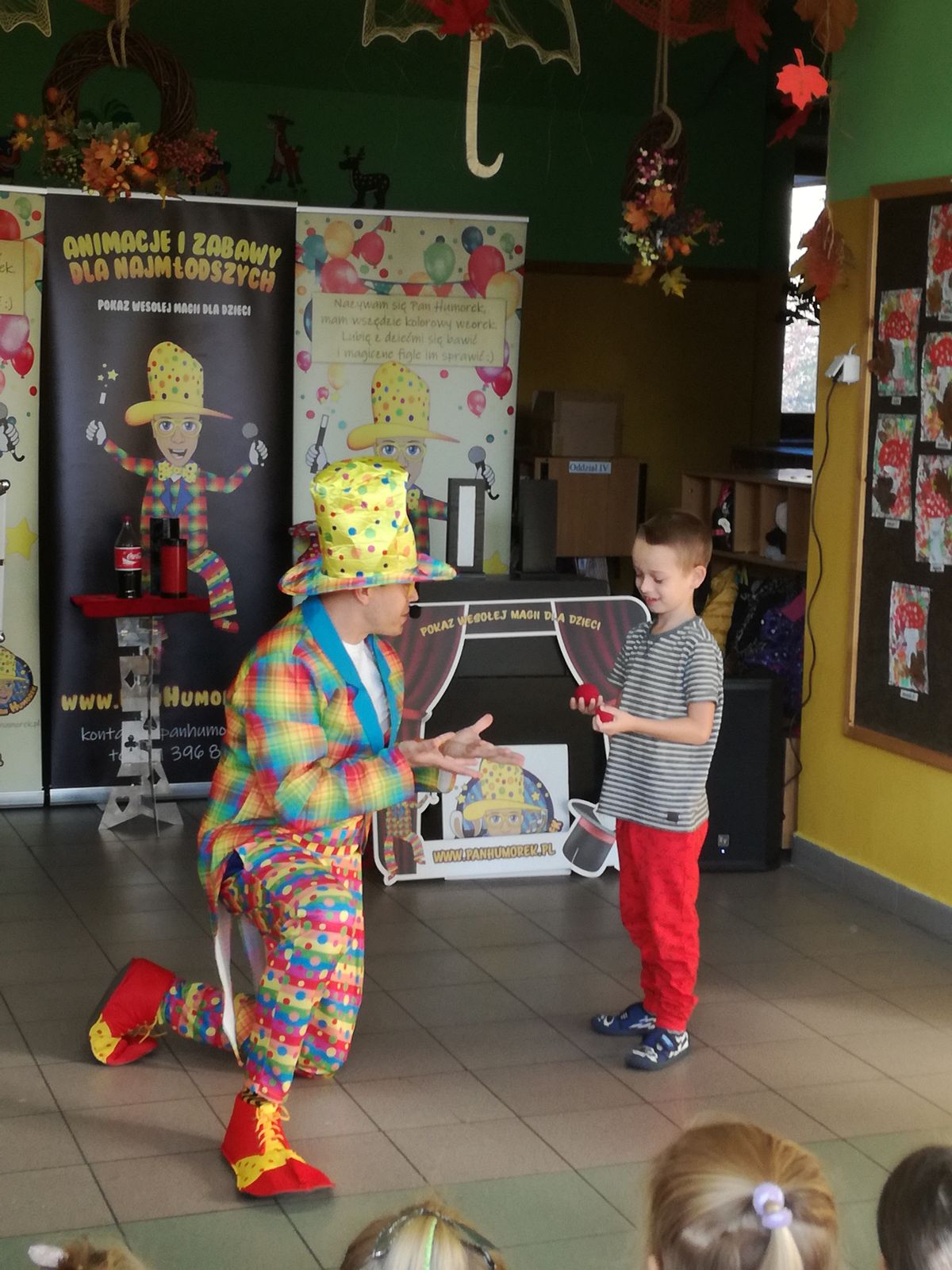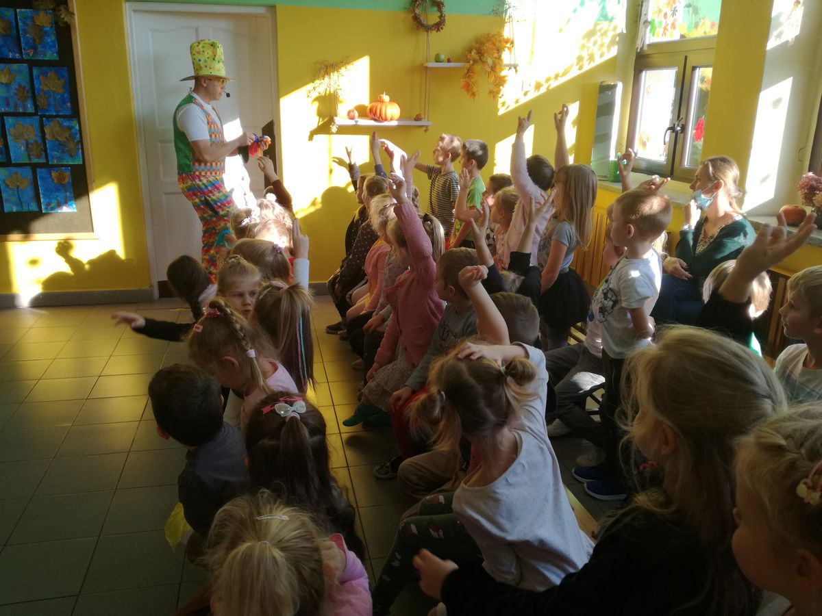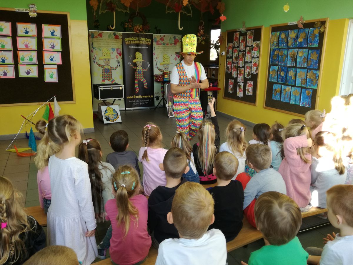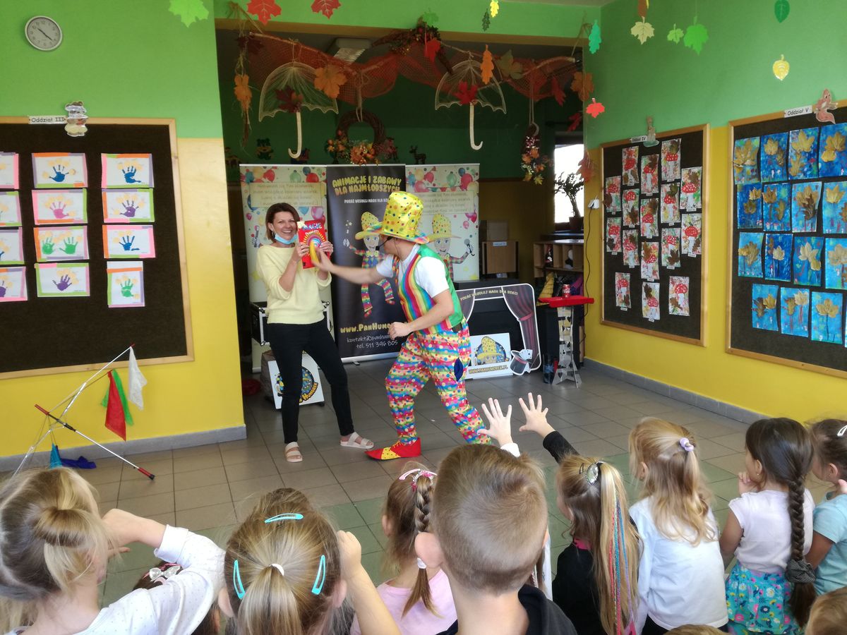 29. 10. 2021r. przedszkolaki miały okazję spotkać się z niezwykłym gościem – Panem Humorkiem. Zaprezentował on dzieciom bardzo atrakcyjny, pełen humoru, pokaz czarów i magii, do którego angażował także dzieci, a nawet panie. Swoim występem oczarował wszystkie przedszkolaki i nie tylko… Na ich buziach malowało się zdziwienie, zaskoczenie, entuzjazm, radość, a przede wszystkim śmiech. Mamy nadzieję, że to nie była ostatnia wizyta tego miłego gościa w naszym przedszkolu.