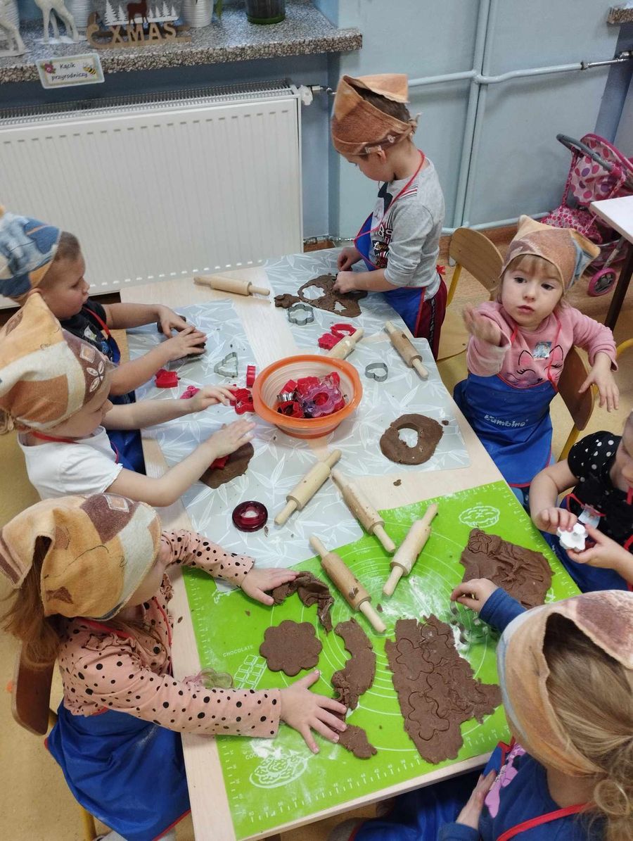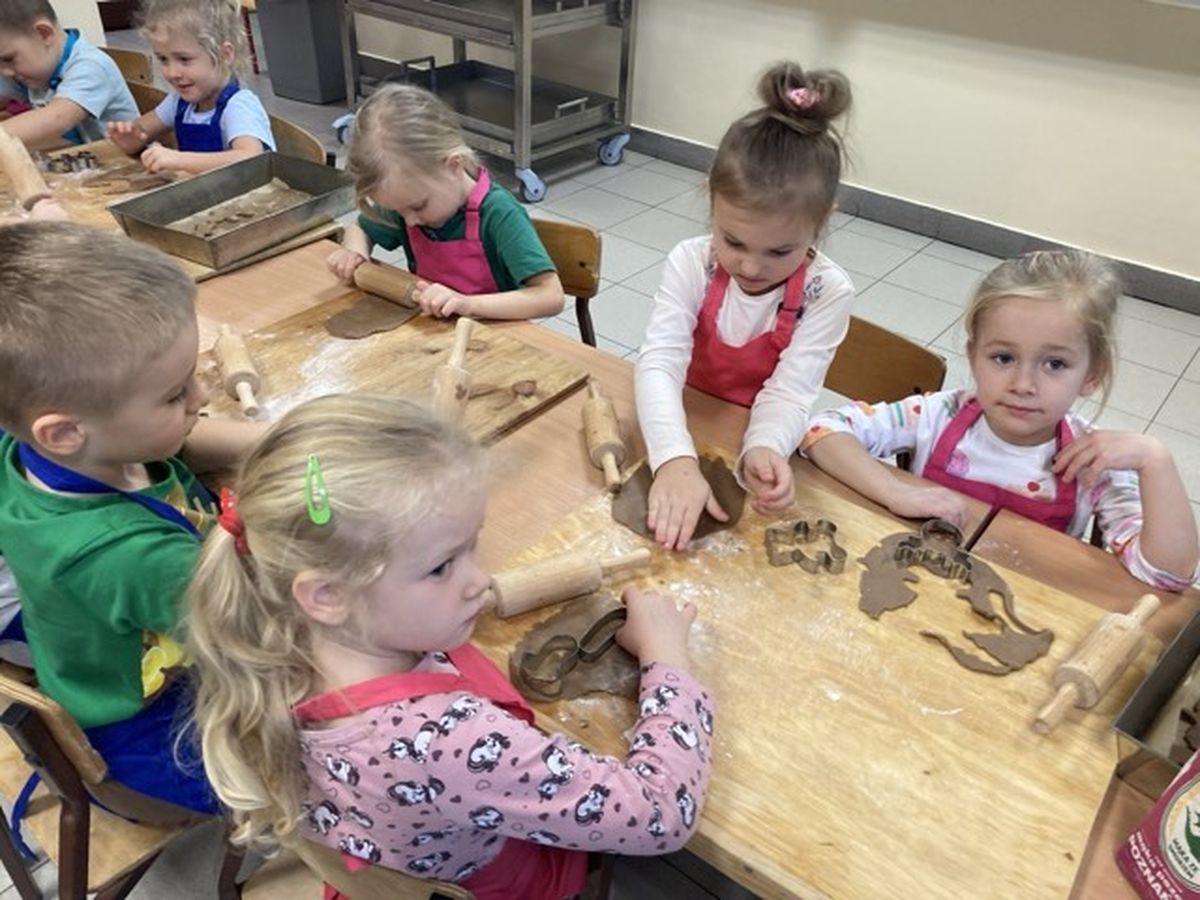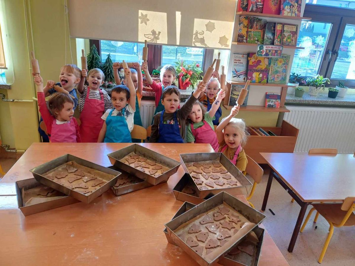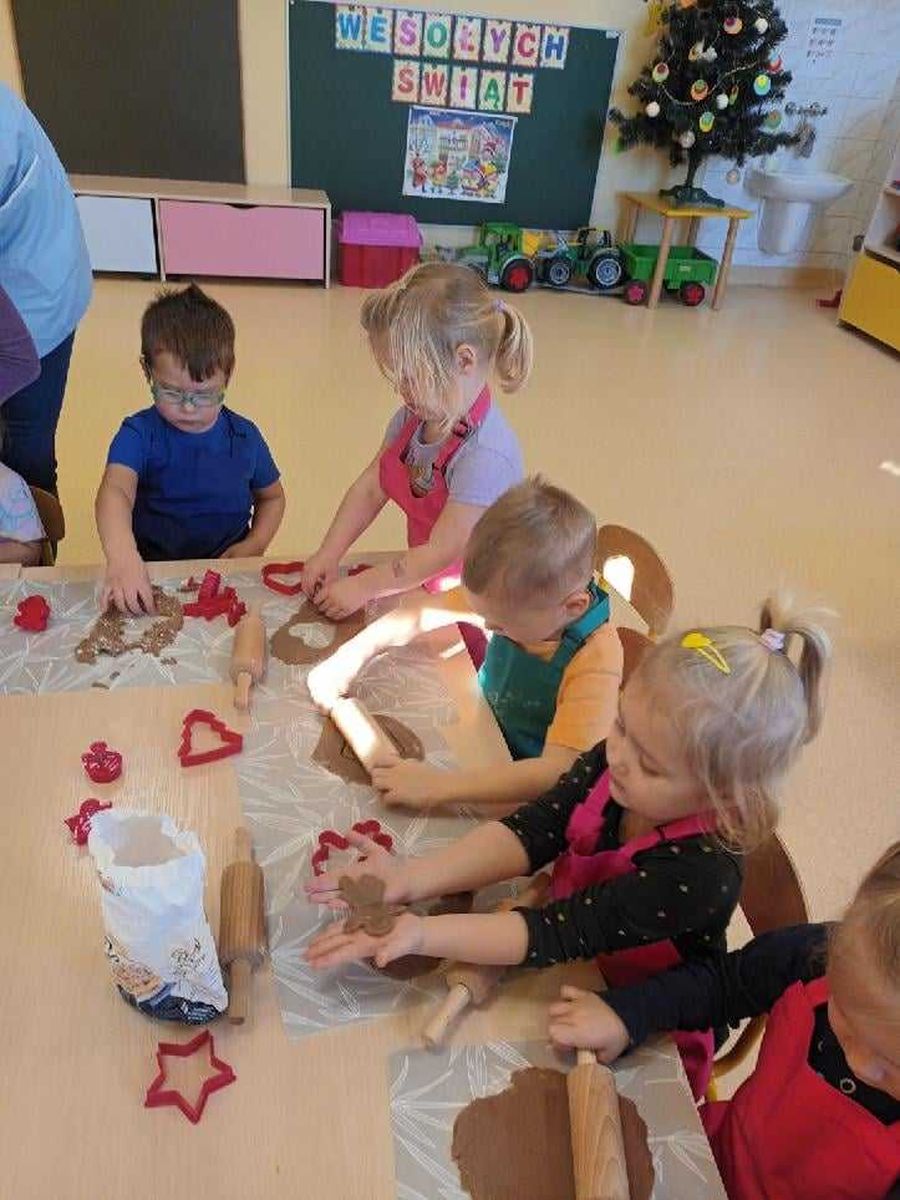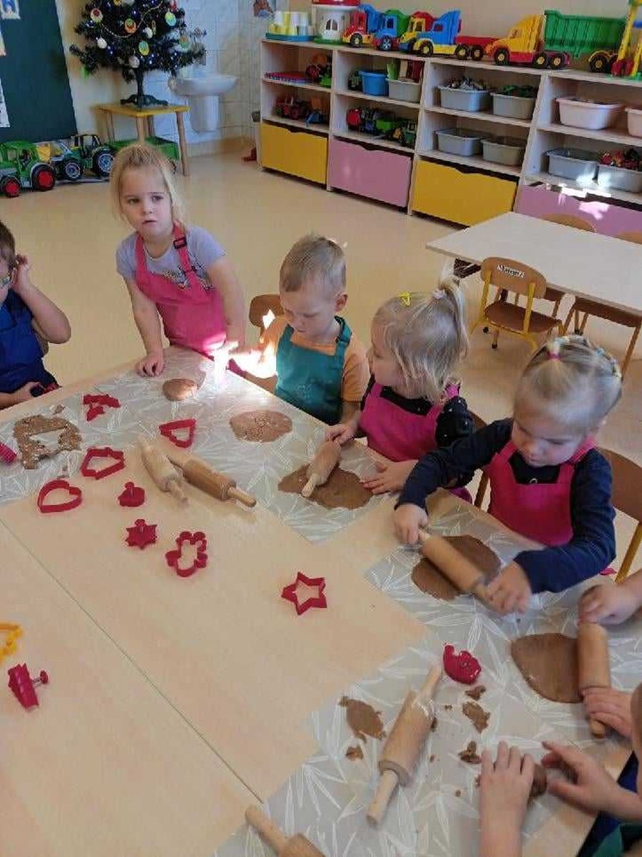 Najpierw dzieci poznały składniki i sposób wykonania ciasta, a następnie po dokładnym umyciu rąk dzieci ochoczo zabrały się do pracy. Z przygotowanego przez Panie ciasta, wykrawały foremkami w świątecznych kształtach pyszne ciasteczka.