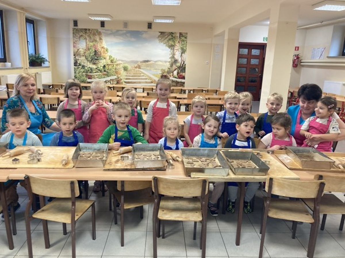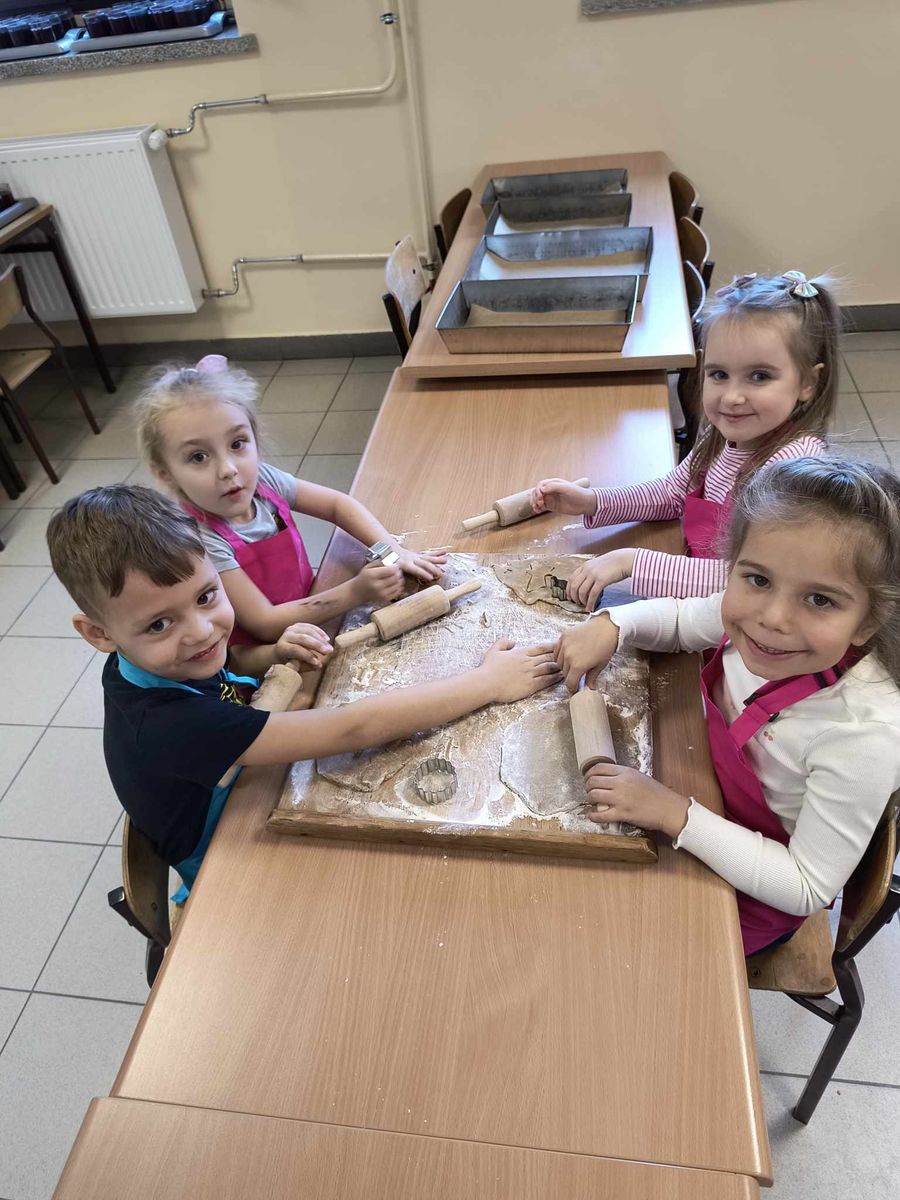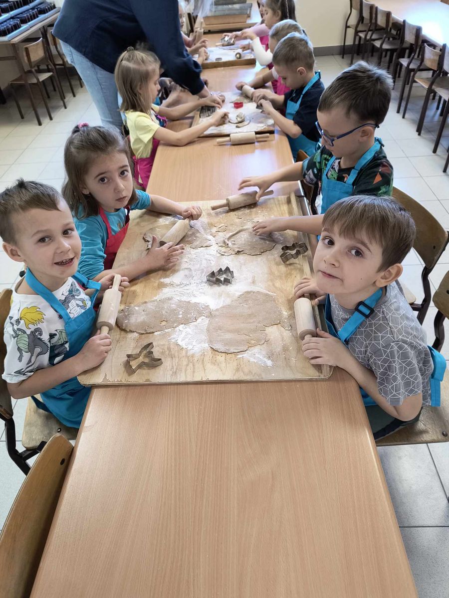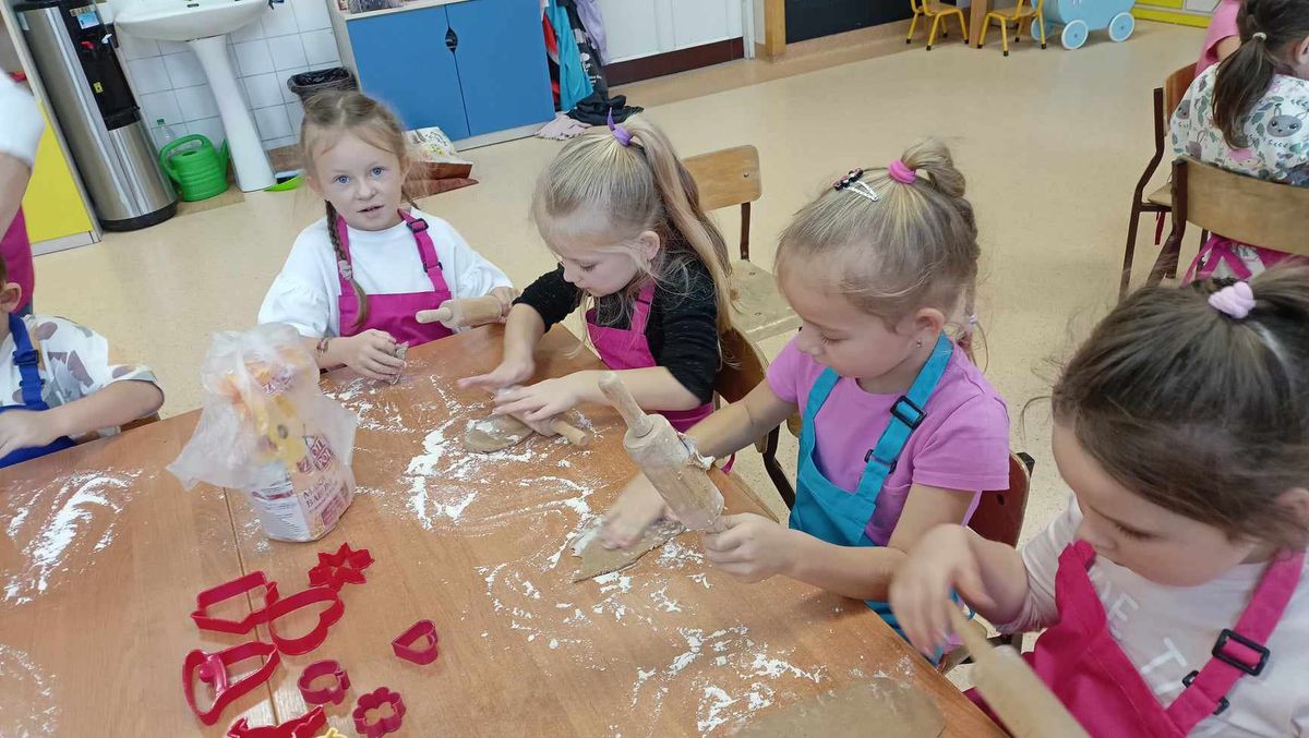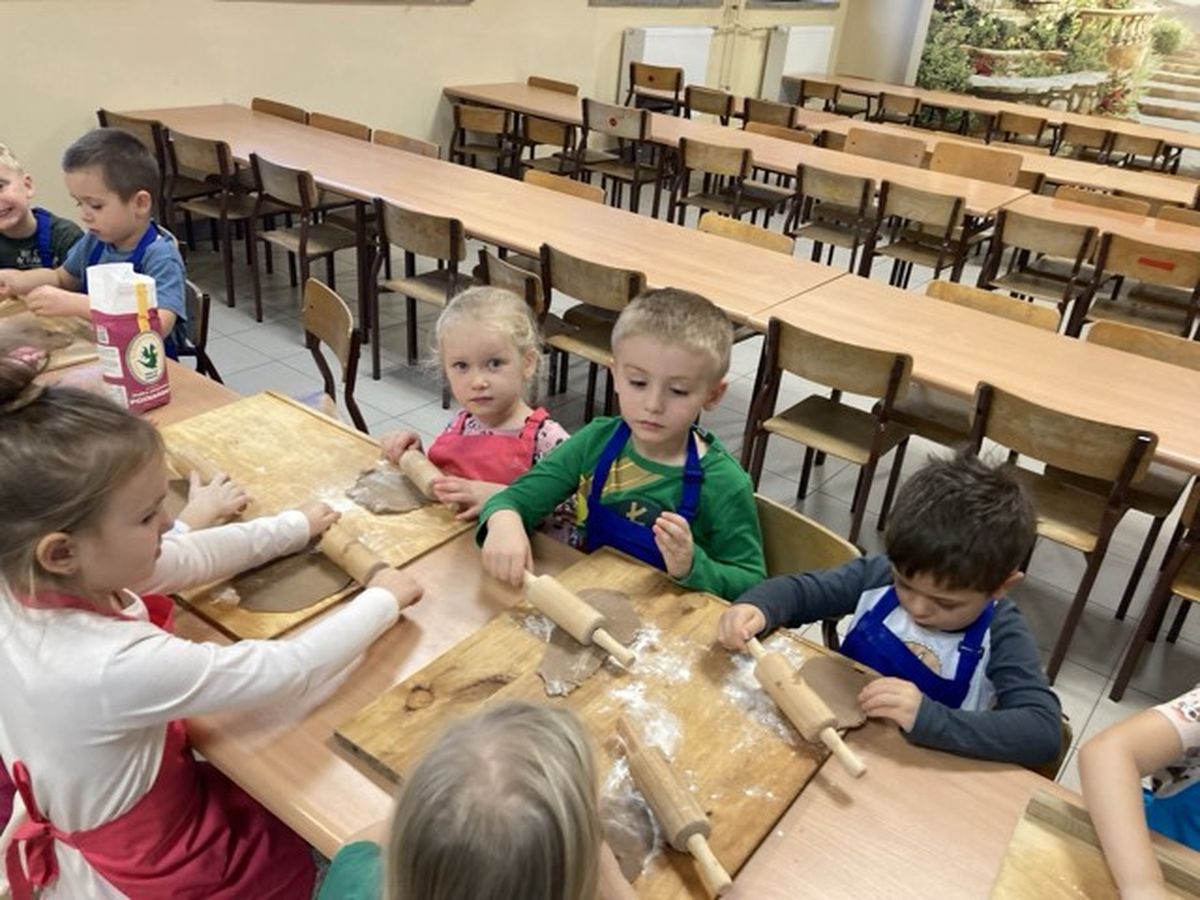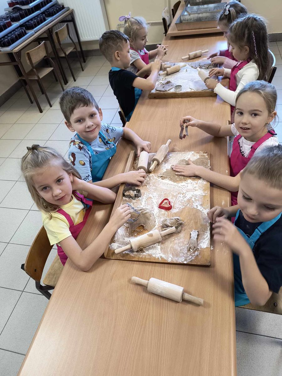 Najpierw dzieci poznały składniki i sposób wykonania ciasta, a następnie po dokładnym umyciu rąk dzieci ochoczo zabrały się do pracy. Z przygotowanego przez Panie ciasta, wykrawały foremkami w świątecznych kształtach pyszne ciasteczka.