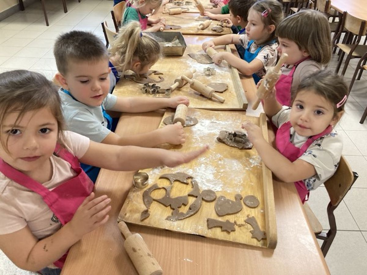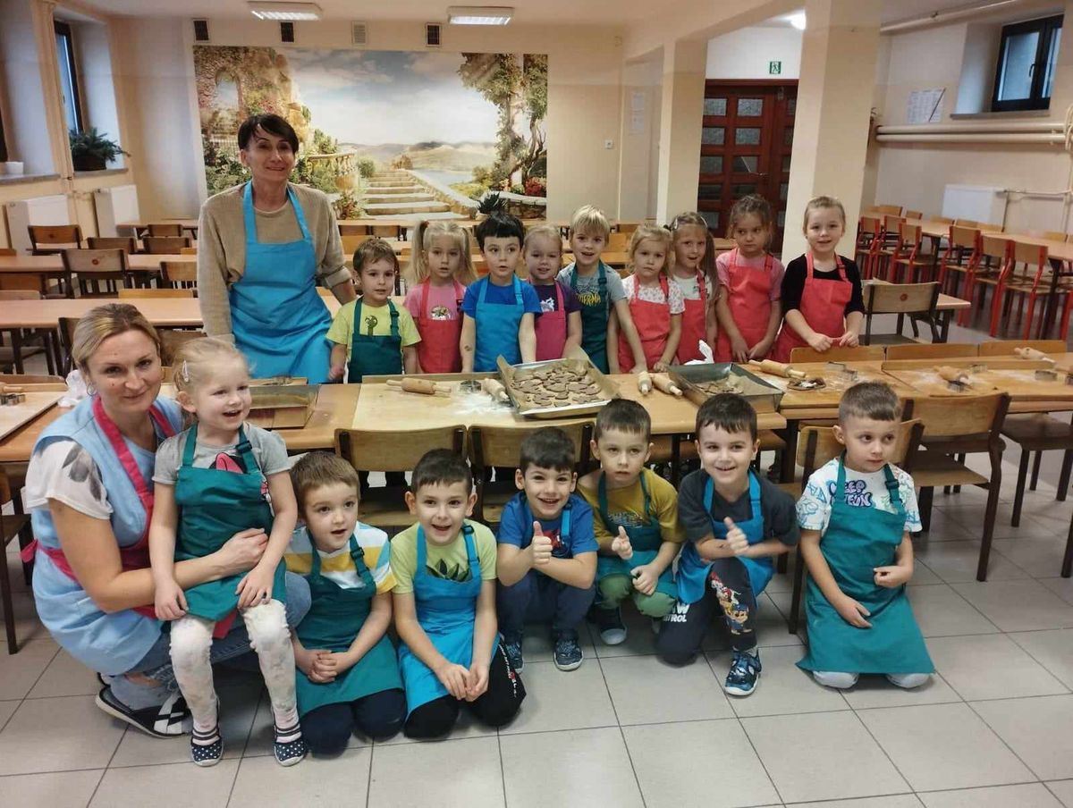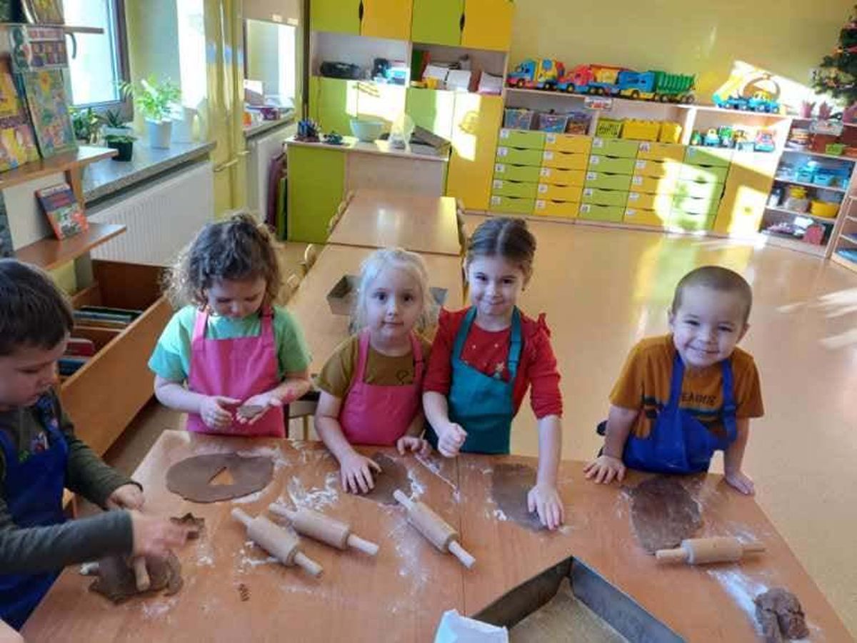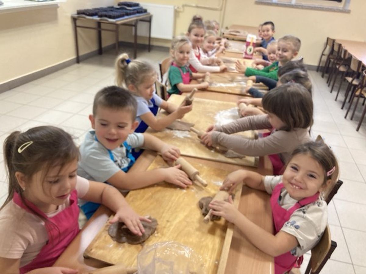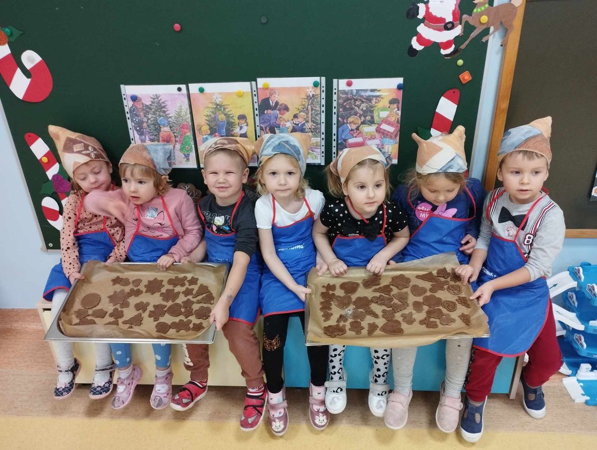 Najpierw dzieci poznały składniki i sposób wykonania ciasta, a następnie po dokładnym umyciu rąk dzieci ochoczo zabrały się do pracy. Z przygotowanego przez Panie ciasta, wykrawały foremkami w świątecznych kształtach pyszne ciasteczka.