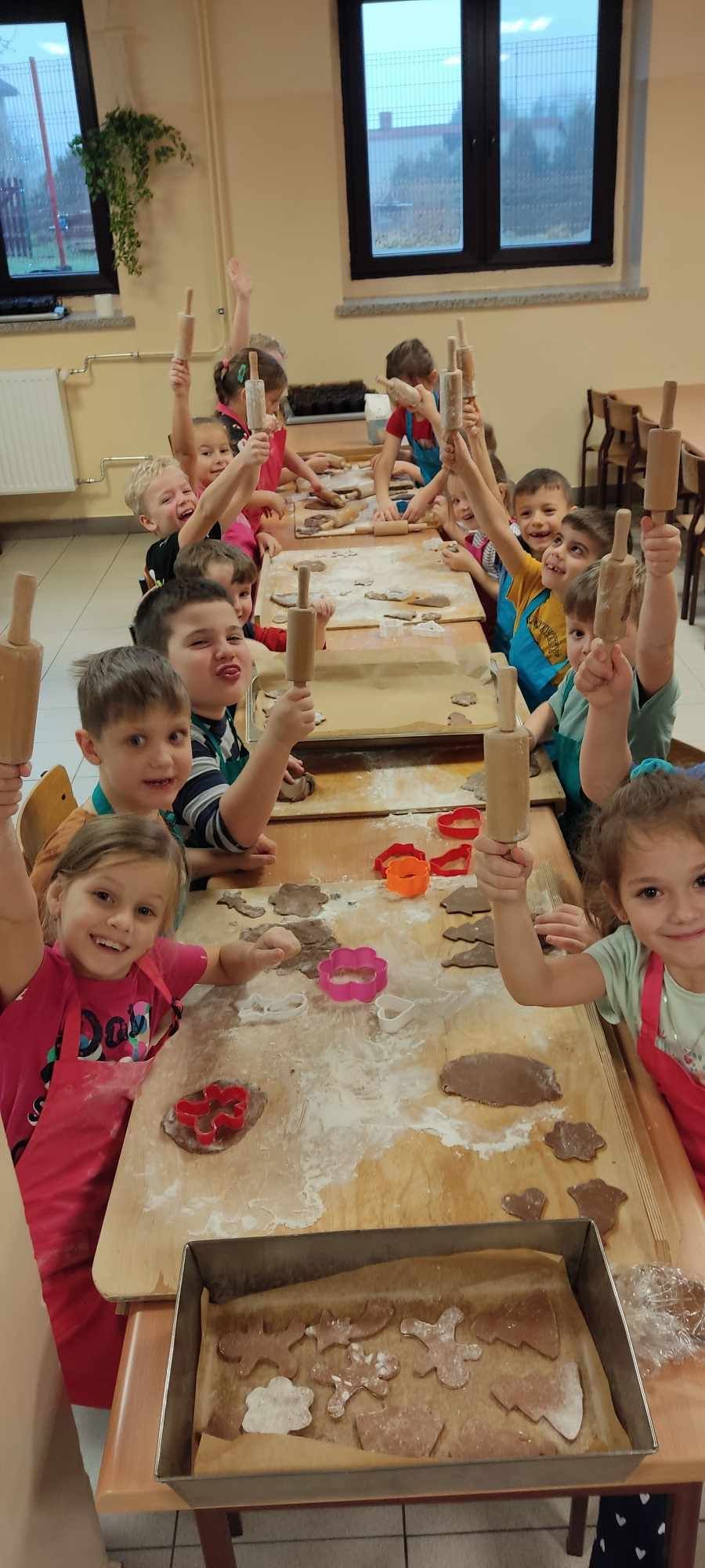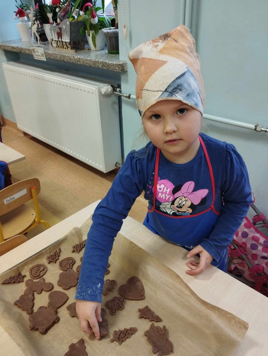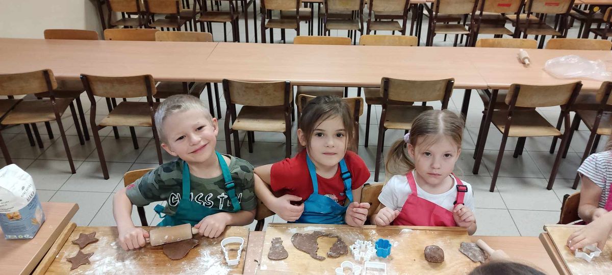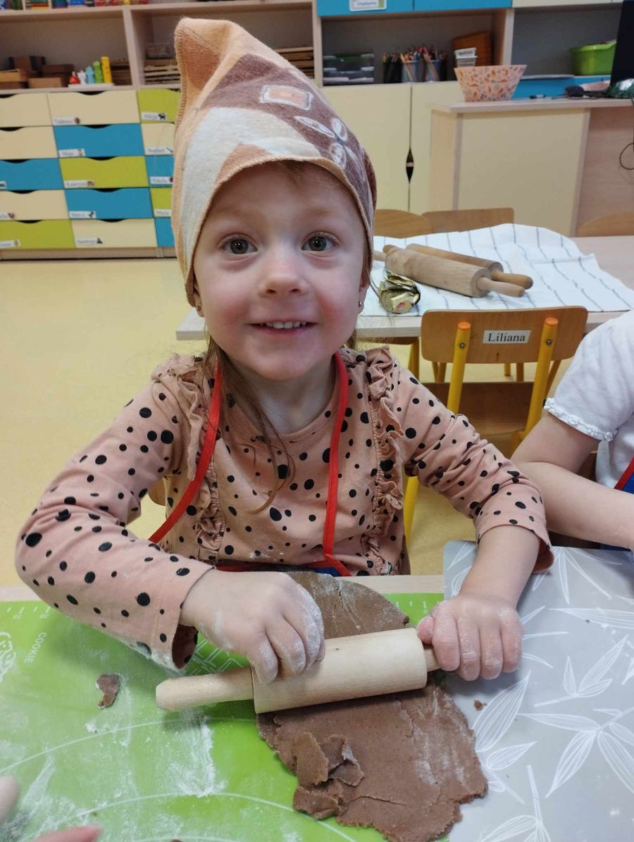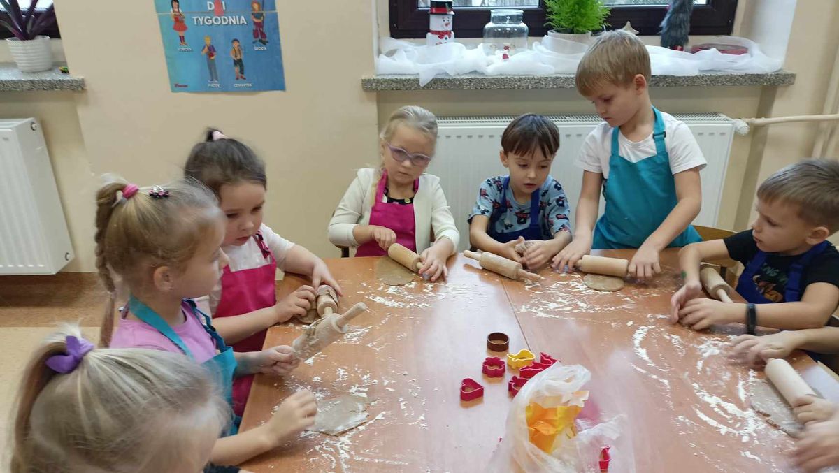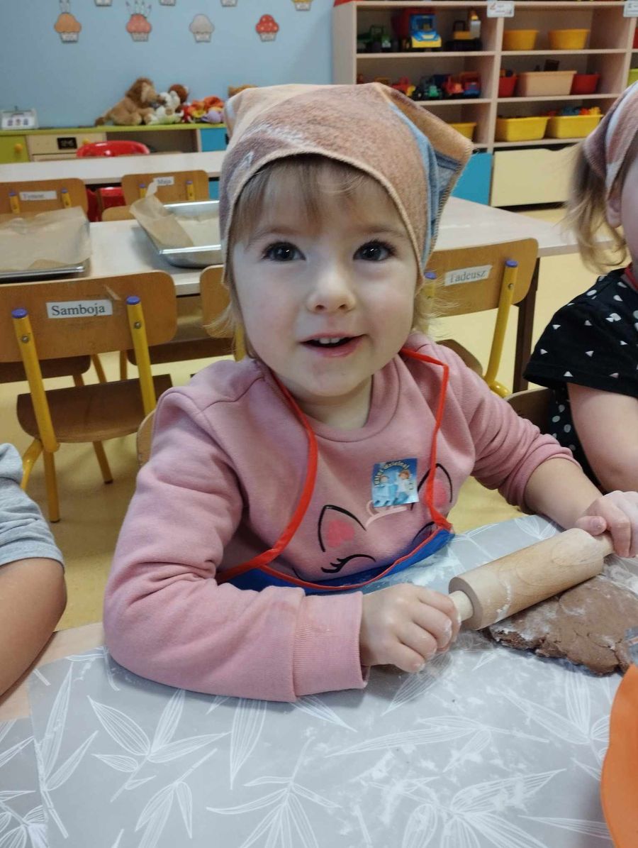 Najpierw dzieci poznały składniki i sposób wykonania ciasta, a następnie po dokładnym umyciu rąk dzieci ochoczo zabrały się do pracy. Z przygotowanego przez Panie ciasta, wykrawały foremkami w świątecznych kształtach pyszne ciasteczka.