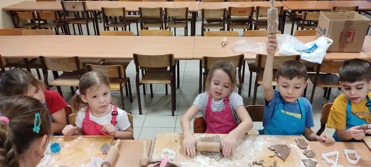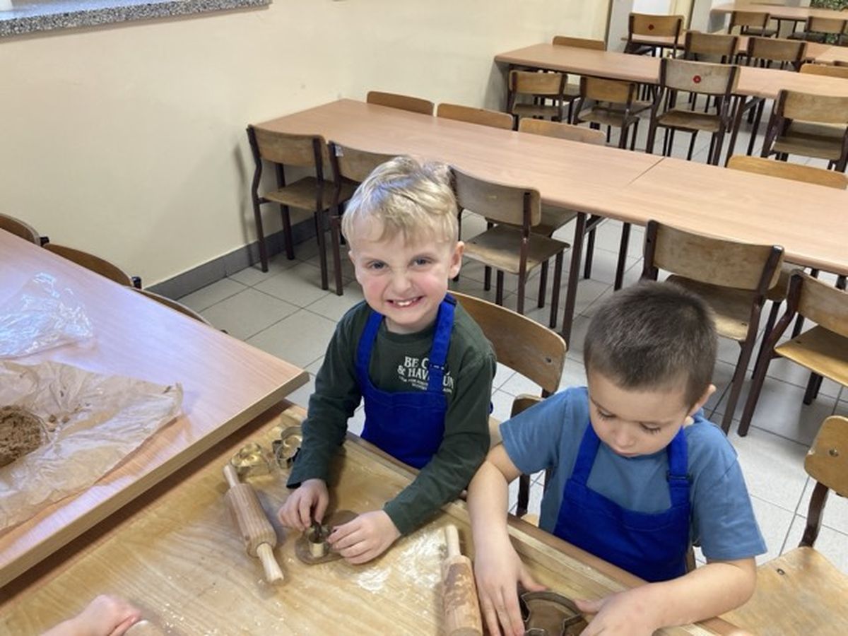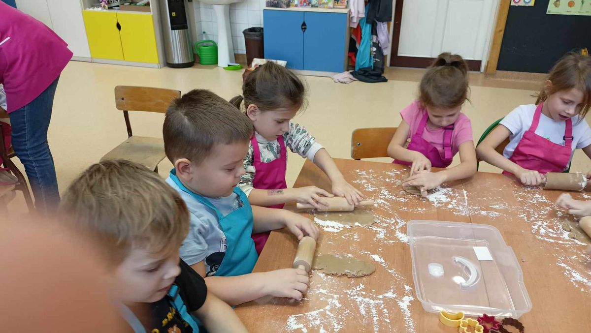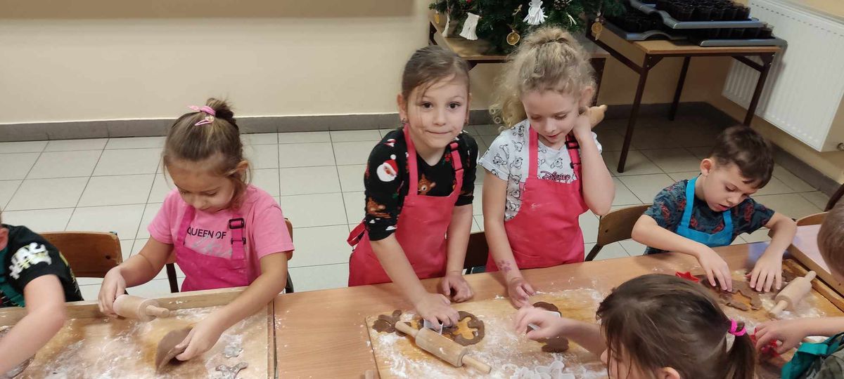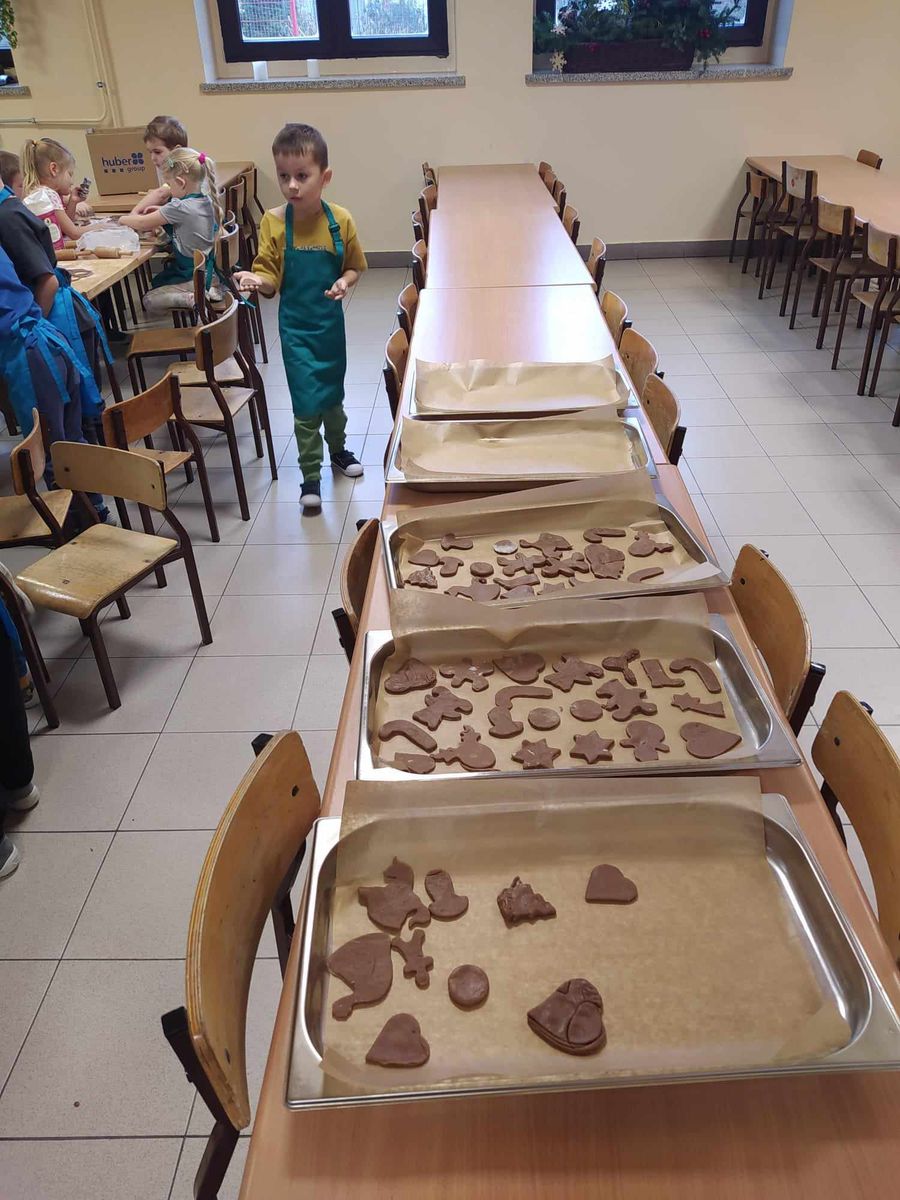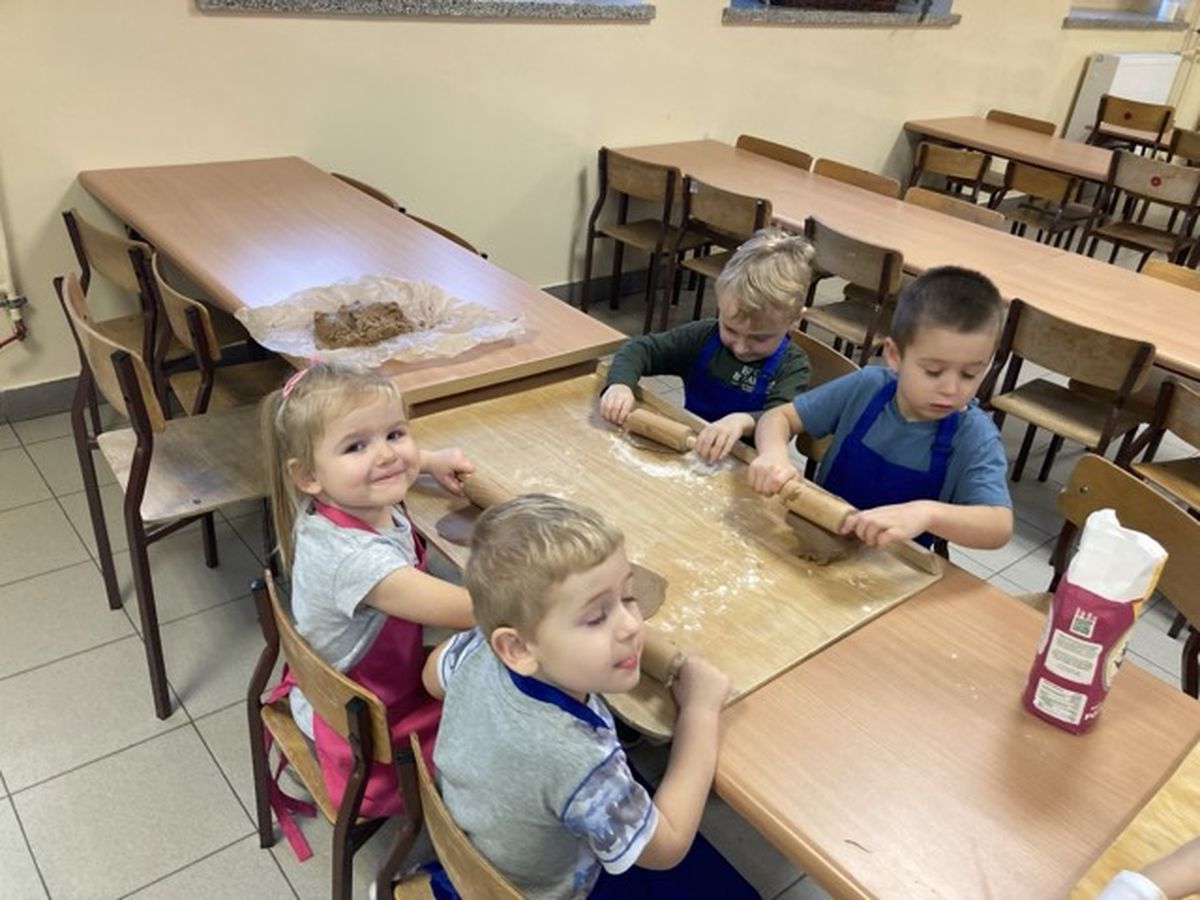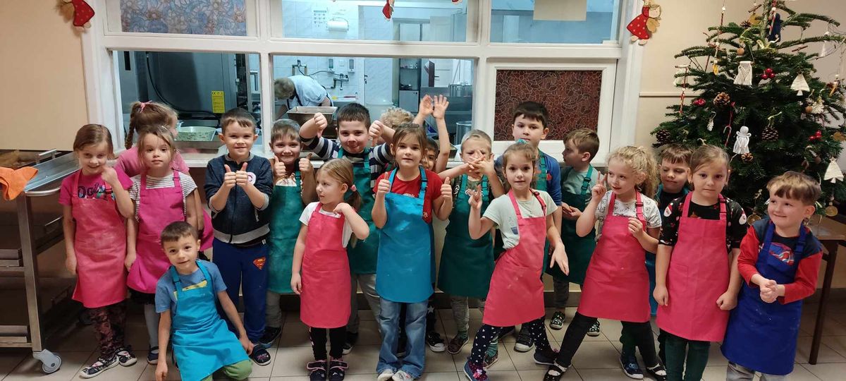 Najpierw dzieci poznały składniki i sposób wykonania ciasta, a następnie po dokładnym umyciu rąk dzieci ochoczo zabrały się do pracy. Z przygotowanego przez Panie ciasta, wykrawały foremkami w świątecznych kształtach pyszne ciasteczka.