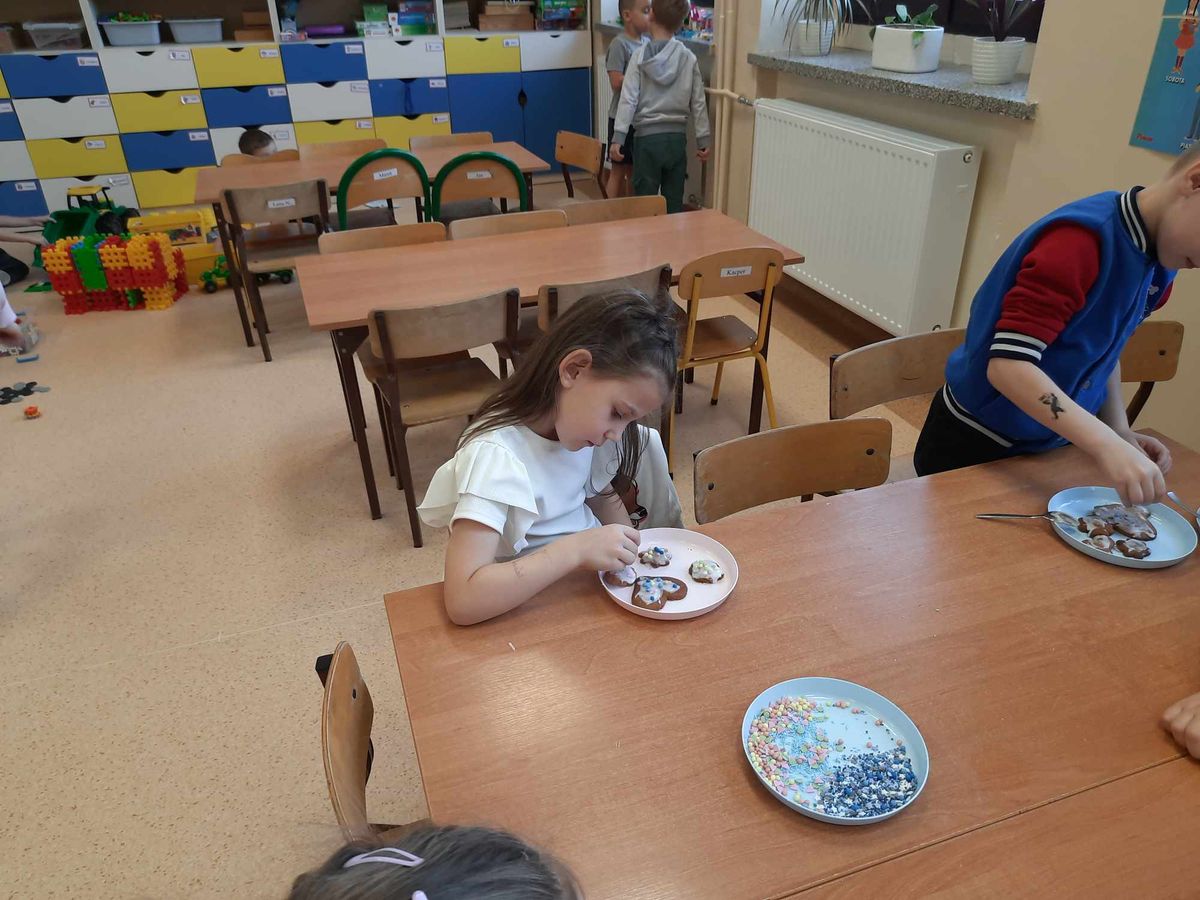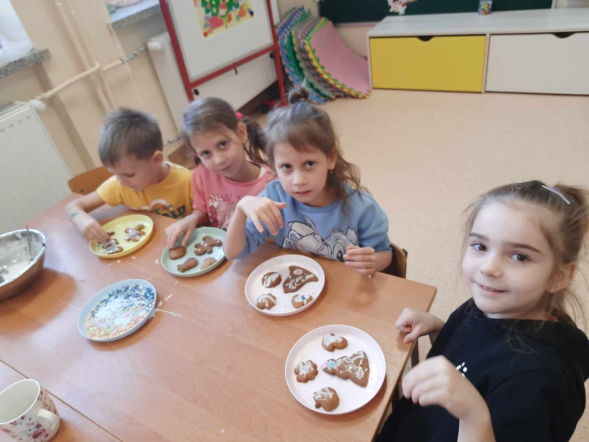Następnie pierniczki zostały upieczone. Wspaniały zapach unosił się w całym przedszkolu i wprawił wszystkich w świąteczny nastrój. Nie zabrakło również lukru, kolorowych posypek, którymi dzieci dopieściły świąteczne wypieki.