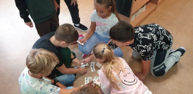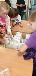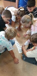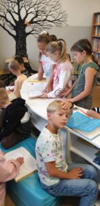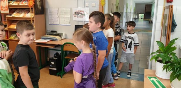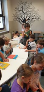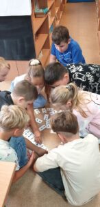 Z tym pytaniem przybyli do biblioteki uczniowie klasy 2 c. Poszukiwania odpowiedzi na to pytanie rozpoczęli od przypomnienia sobie alfabetu. Podzieleni na grupy układali kolejno kartoniki z literami. Potem zastanawiali się, czy w bibliotece ten alfabet jest koniecznie potrzebny. W kartach czytelniczych zauważyli, że nazwiska uczniów są ułożone kolejno wg alfabetu. Ale znowu pojawiło się pytanie: co wtedy, gdy kilka nazwisk zaczyna się na tę samą literę? Poradzili sobie wybornie – wiedzieli, że trzeba sprawdzić kolejną, a jeśli trzeba to jeszcze następną. Sprawdzali również słowniki – małe ilustrowane słowniki ortograficzne dla dzieci. Jednogłośnie wykrzyczeli, że tam też potrzebny jest alfabet! Na koniec wizyty ustaliśmy, że już wkrótce odkryjemy tajemnice alfabetu!