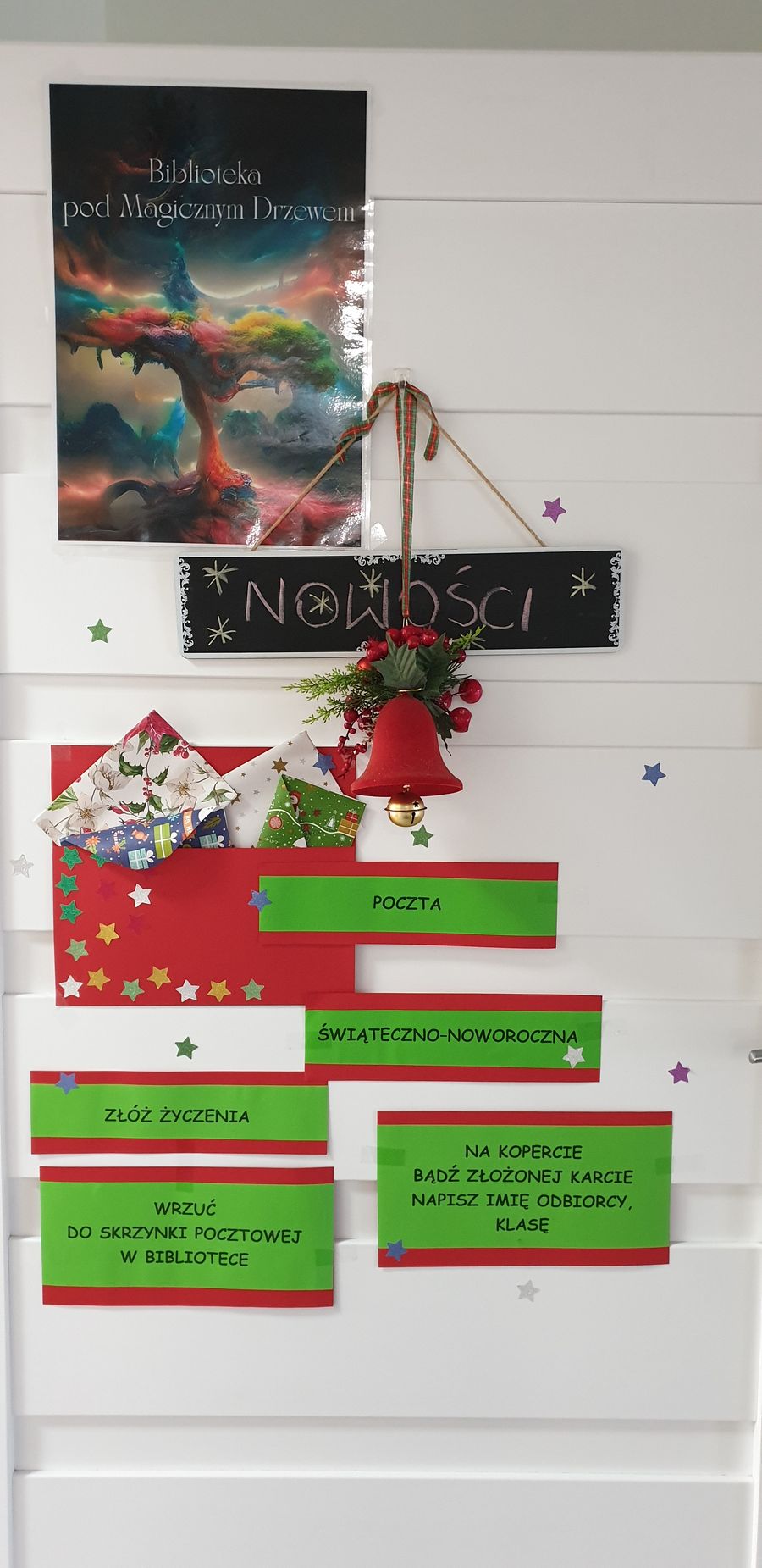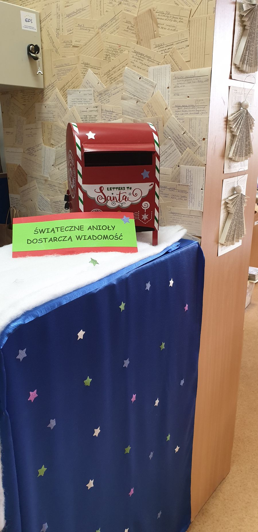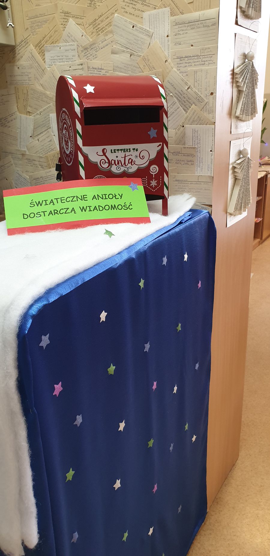 Samorząd uczniowski i szkolna biblioteka zorganizowali pocztę świąteczną. Każdego dnia można wrzucać do skrzynki świąteczne i noworoczne życzenia dla przyjaciół, kolegów, nauczycieli naszej szkoły. Świąteczne Anioły każdego dnia dostarczają przesyłki do adresatów.