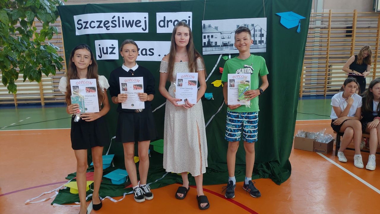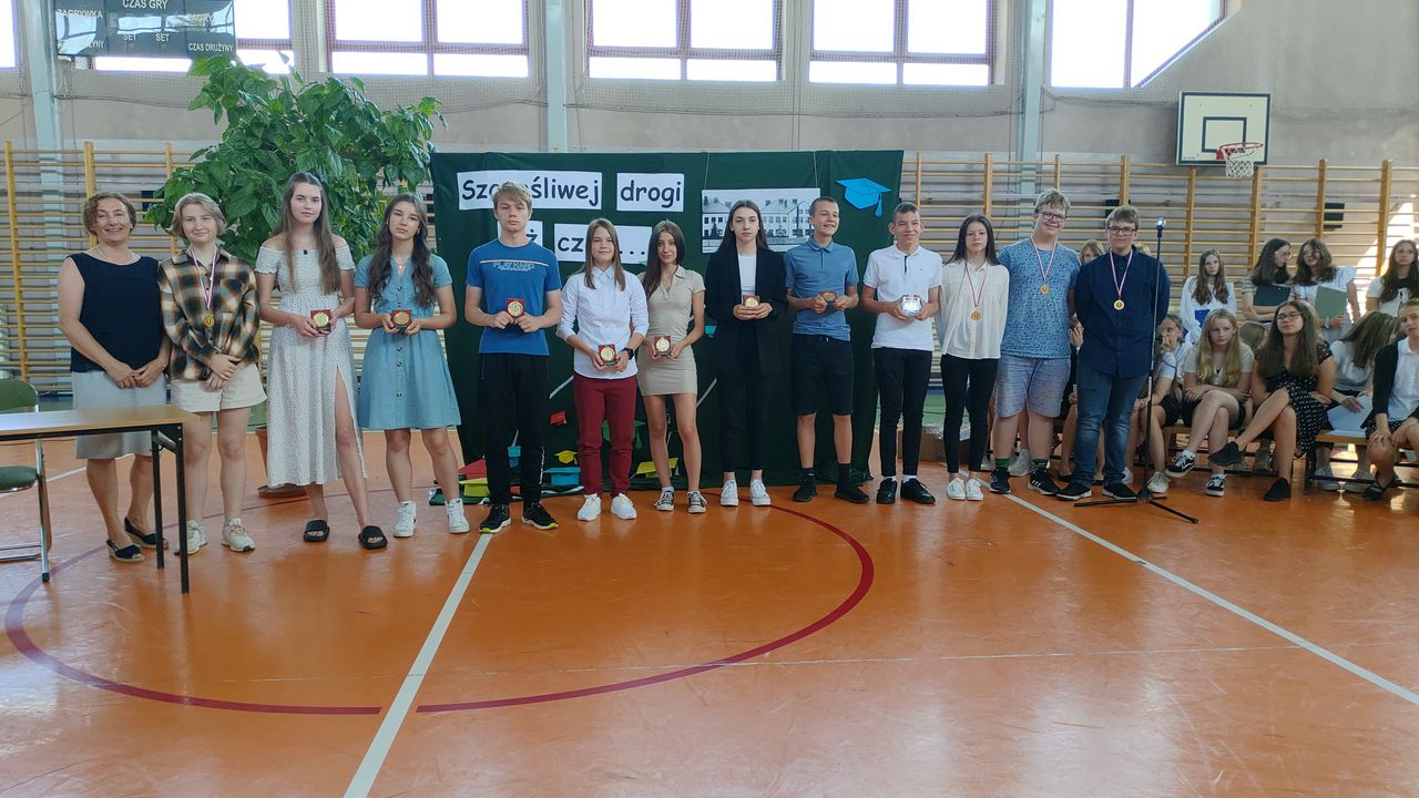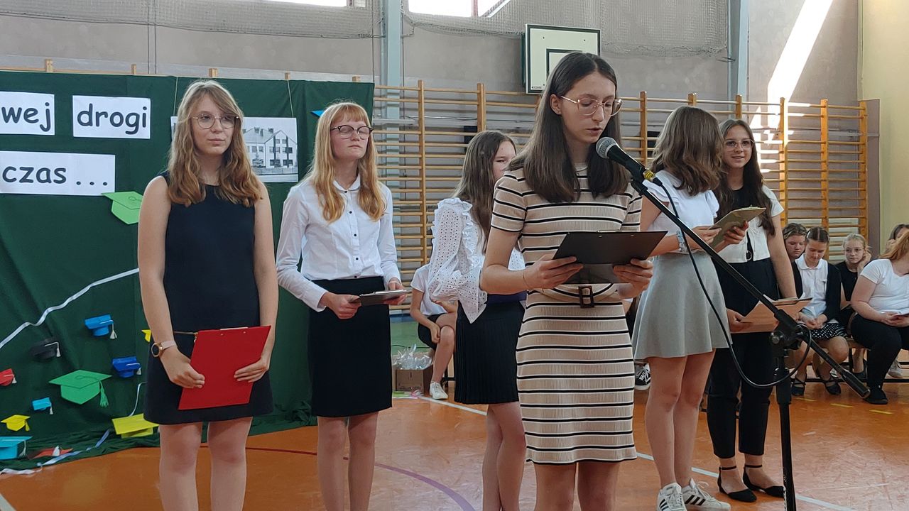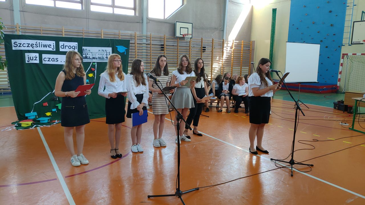 W dniu 23 czerwca 2022 r. klasy siódme pożegnały swoich starszych kolegów. Przypomnieli ich pierwsze chwile w szkole, pierwsze przyjaźnie, całe barwne szkolne życie. Ale dla ósmoklasistów wszystko w tej szkole było ju z ostatnie – sprawdziany i testy, wypad do kina i lekcje online, wyczekiwane wycieczki, ostatnia piątka i ostatnia jedynka. Ten szkolny czas już dla nich się skończył.