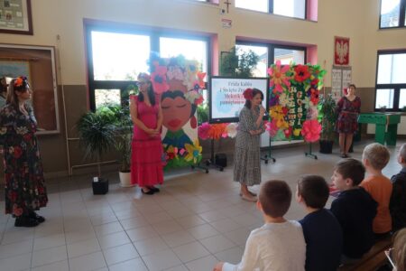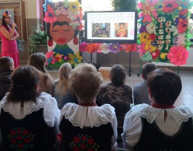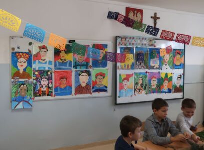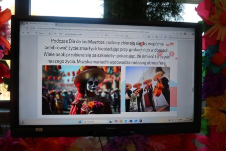 Nauczyciele prowadzący zaprezentowali sylwetkę jednej z najsłynniejszych meksykańskich artystek – Fridy Kahlo. Jej życie, twórczość i niezłomna postawa stały się inspiracją do głębszej refleksji na temat sztuki, pasji i znaczenia indywidualności w kulturze. W trakcie spotkania uczniowie mieli także okazję posłuchać o meksykańskich tradycjach oraz rytuałach związanych z życiem i śmiercią. Porównano sposób obchodzenia Święta Zmarłych w Meksyku z tradycjami, które panują w Polsce. Podkreślono, że mimo różnic, w obu krajach łączy nas szacunek do przodków oraz pamięć o zmarłych.