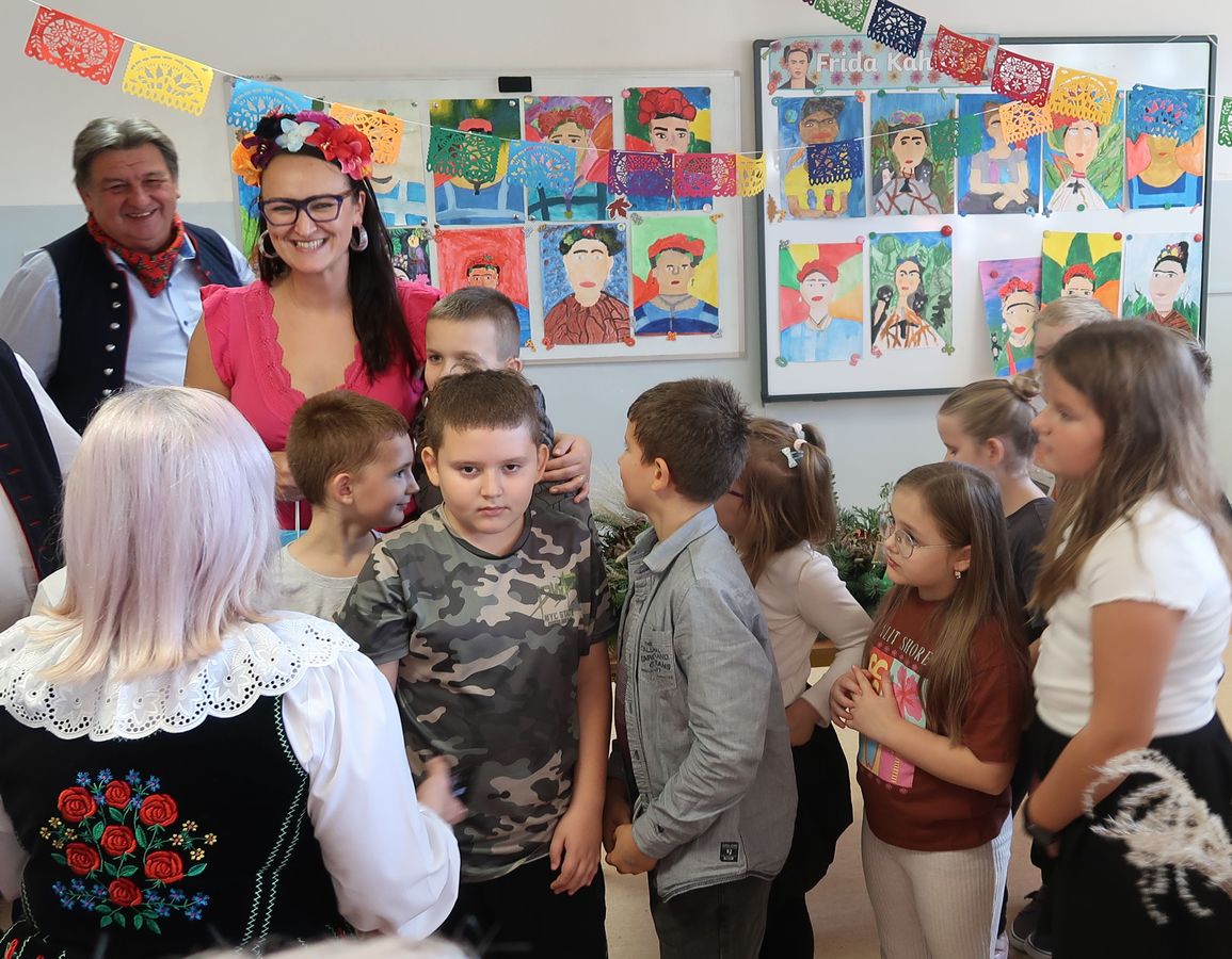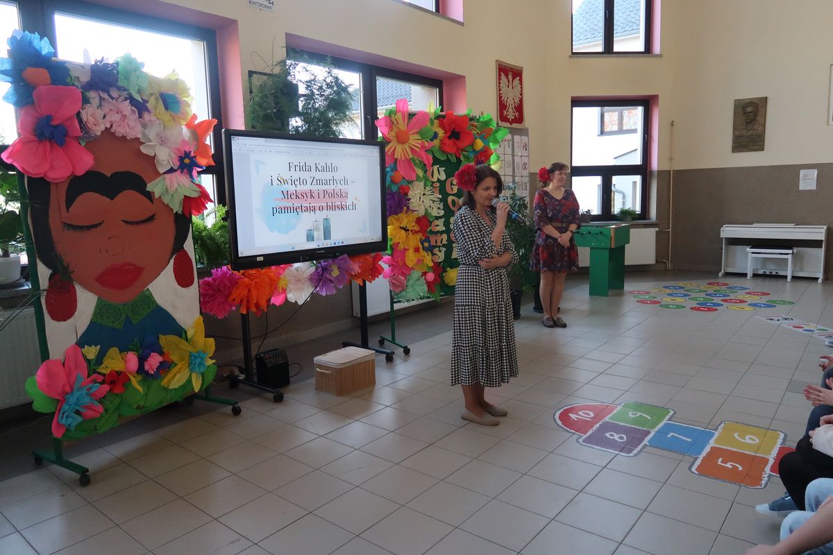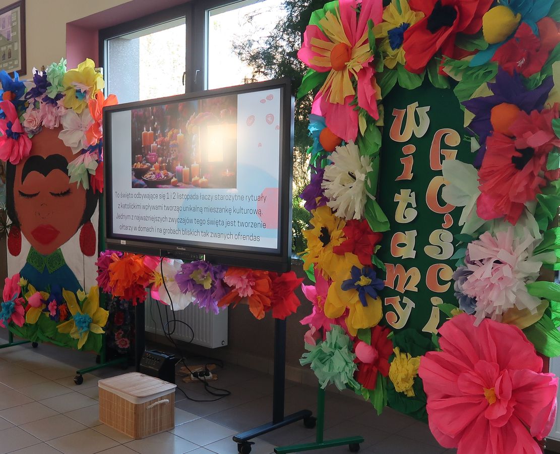 Nauczyciele prowadzący zaprezentowali sylwetkę jednej z najsłynniejszych meksykańskich artystek – Fridy Kahlo. Jej życie, twórczość i niezłomna postawa stały się inspiracją do głębszej refleksji na temat sztuki, pasji i znaczenia indywidualności w kulturze. W trakcie spotkania uczniowie mieli także okazję posłuchać o meksykańskich tradycjach oraz rytuałach związanych z życiem i śmiercią. Porównano sposób obchodzenia Święta Zmarłych w Meksyku z tradycjami, które panują w Polsce. Podkreślono, że mimo różnic, w obu krajach łączy nas szacunek do przodków oraz pamięć o zmarłych.