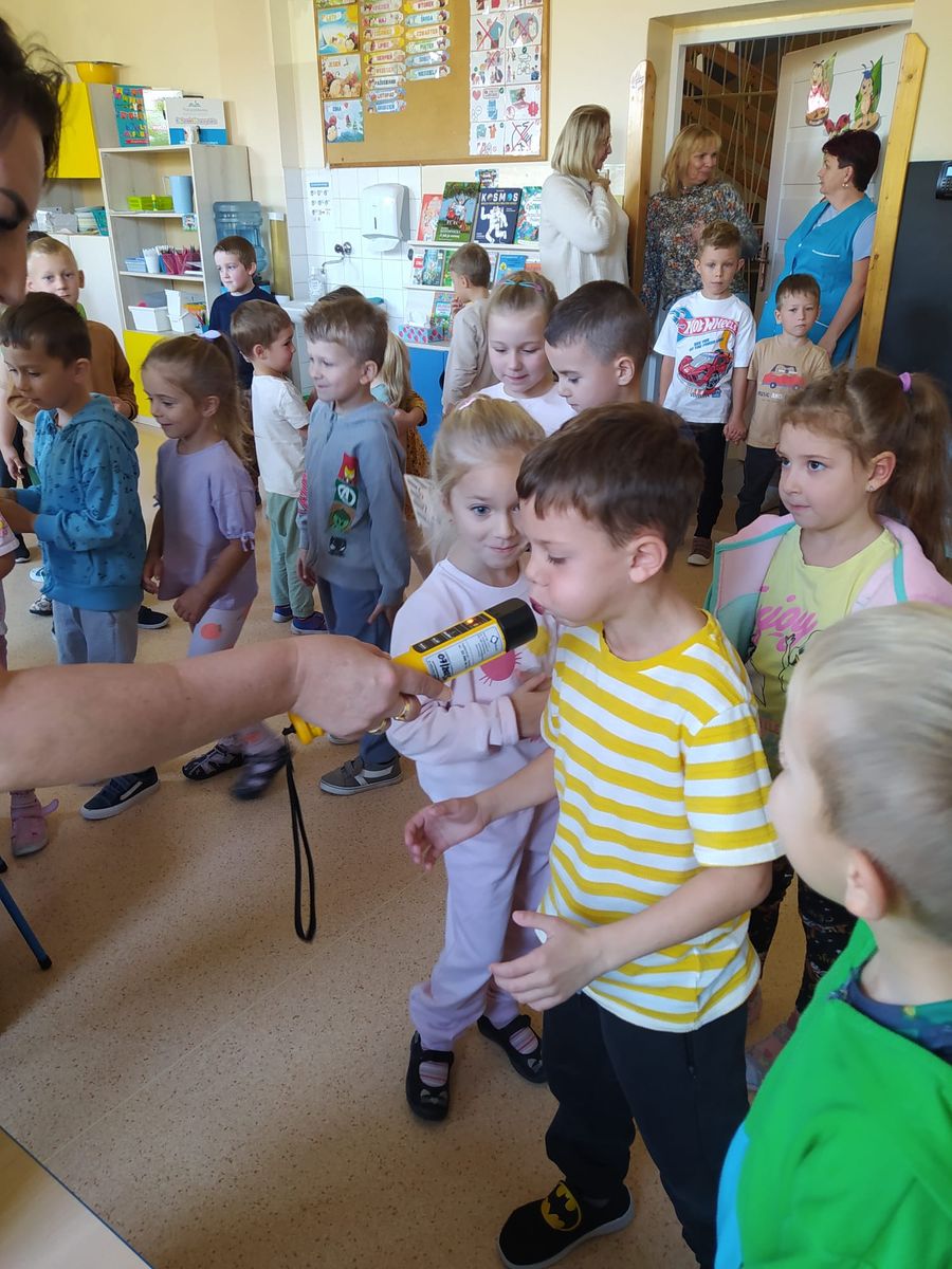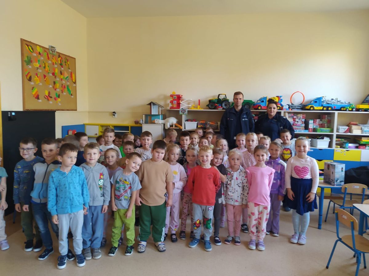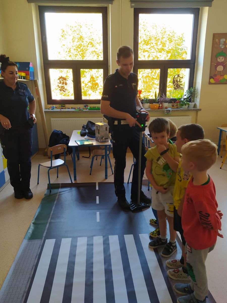 W poniedziałek 21 października nasze przedszkolaki odwiedzili policjanci z Komendy Powiatowej Policji w Oświęcimiu. Przypomnieli dzieciom zasady bezpiecznego poruszania się w ruchu drogowym, a w szczególności przechodzenia przez jezdnię. Ponadto zaprezentowali charakterystyczne elementy policyjnego stroju. Największą atrakcją był pokaz radiowozu policyjnego wraz z jego sygnałami dźwiękowymi.