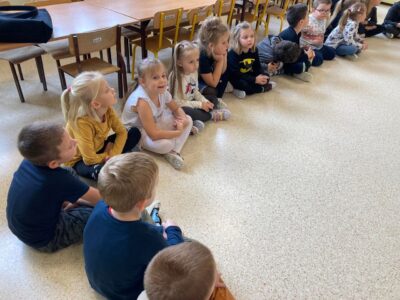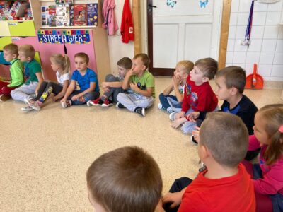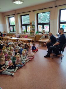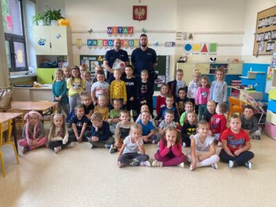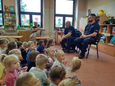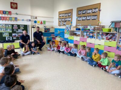 19 września w naszym przedszkolu odbyło się spotkanie z policjantami z Komendy Powiatowej Policji w Oświęcimiu. Tematem spotkania było utrwalenie z dziećmi zasad bezpiecznego zachowania się na drodze oraz przypomnienie zagadnień dotyczących bezpieczeństwa dzieci zarówno w przedszkolu, jak i w domu. Policjanci wytłumaczyli przedszkolakom jak należy zachować się w kontaktach z obcymi ludźmi, a także jak dbać o bezpieczeństwo własne i innych. Na koniec panowie zaprezentowali dzieciom swój służbowy strój oraz akcesoria. Przedszkolaki z dużym zainteresowaniem słuchały wskazówek zaproszonych gości, a teraz z niecierpliwością czekają na kolejne spotkanie.
